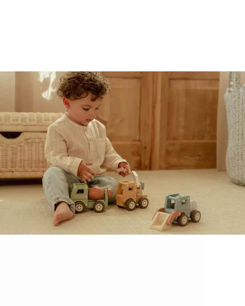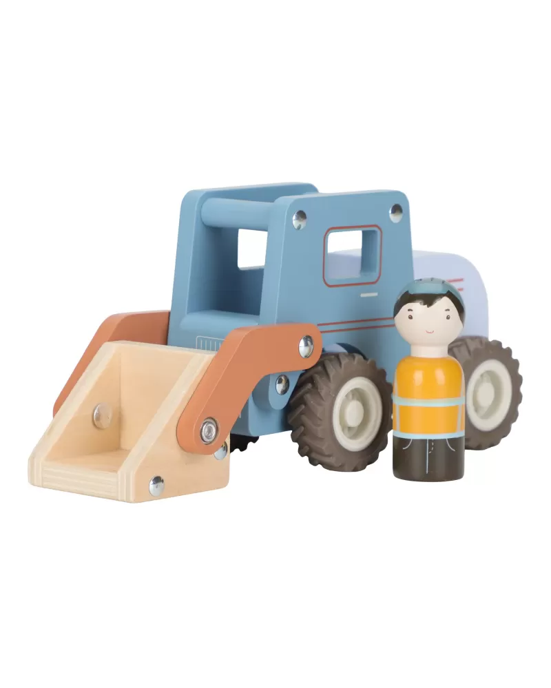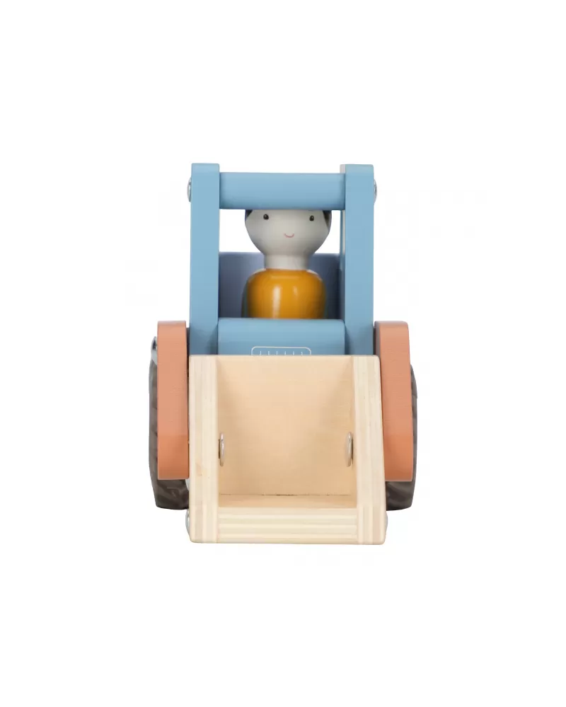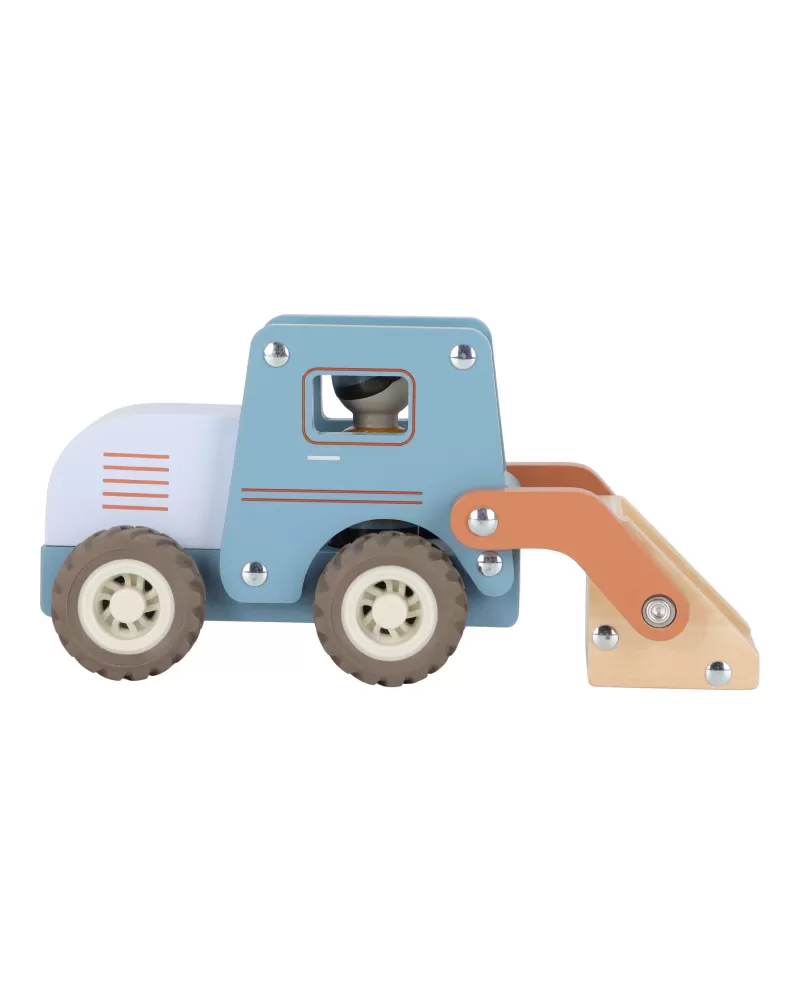 Součástí hračky je dřevěná figurka stavbaře, která rozšiřuje možnosti hry a podporuje představivost. Nakladač můžete kombinovat s dalšími stavebními vozidly – například s autojeřábem, míchačkou nebo sklápěčkou – pro kompletní stavební dobrodružství.