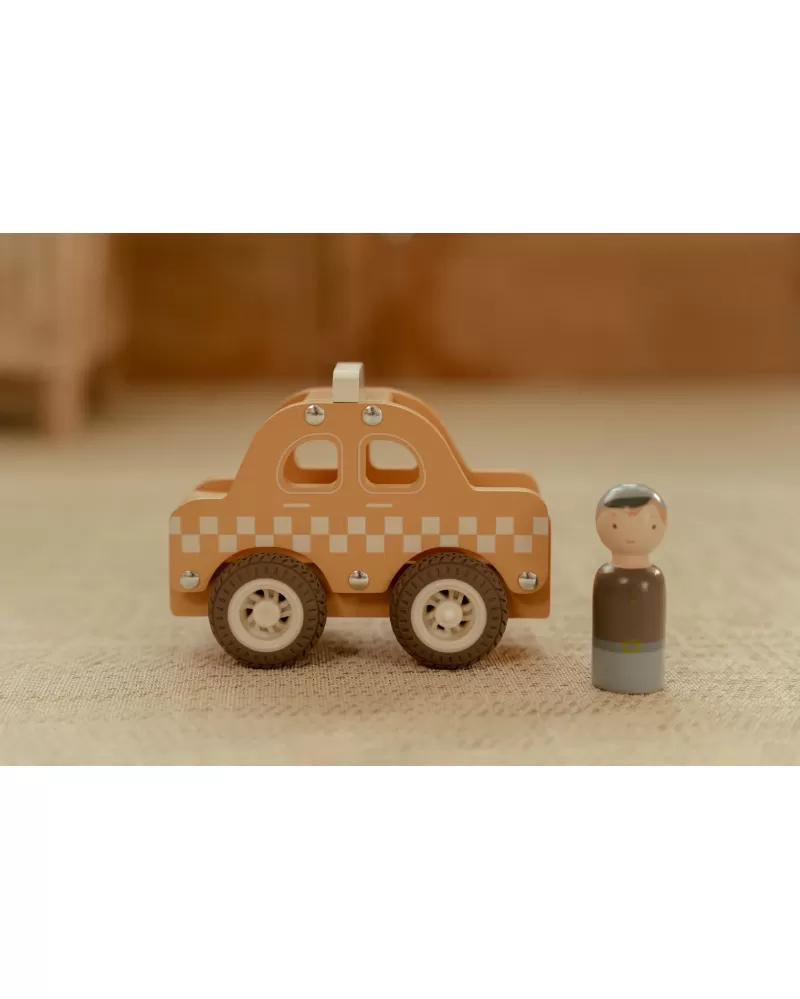 Naskočte a nechte se odvézt! Toto dřevěné taxi je připraveno bezpečně dopravit každého cestujícího do cíle. Díky gumovým pneumatikám se hladce pohybuje po podlaze, a sympatický řidič už čeká, až vyrazíte na cestu.