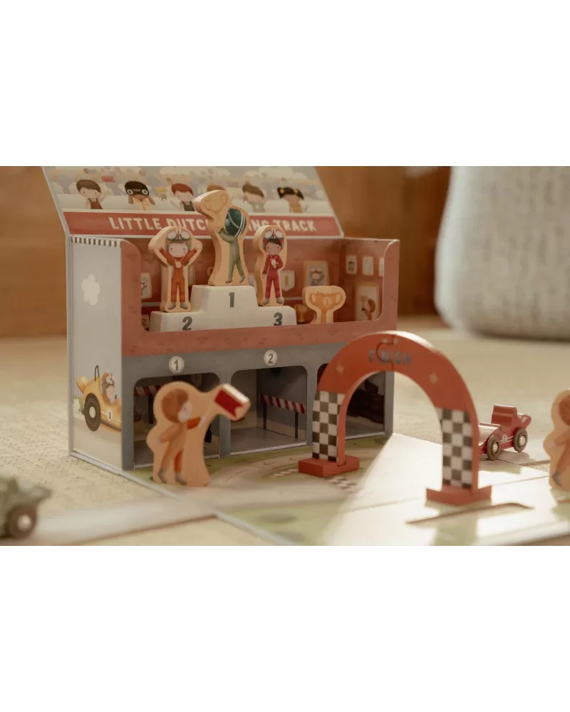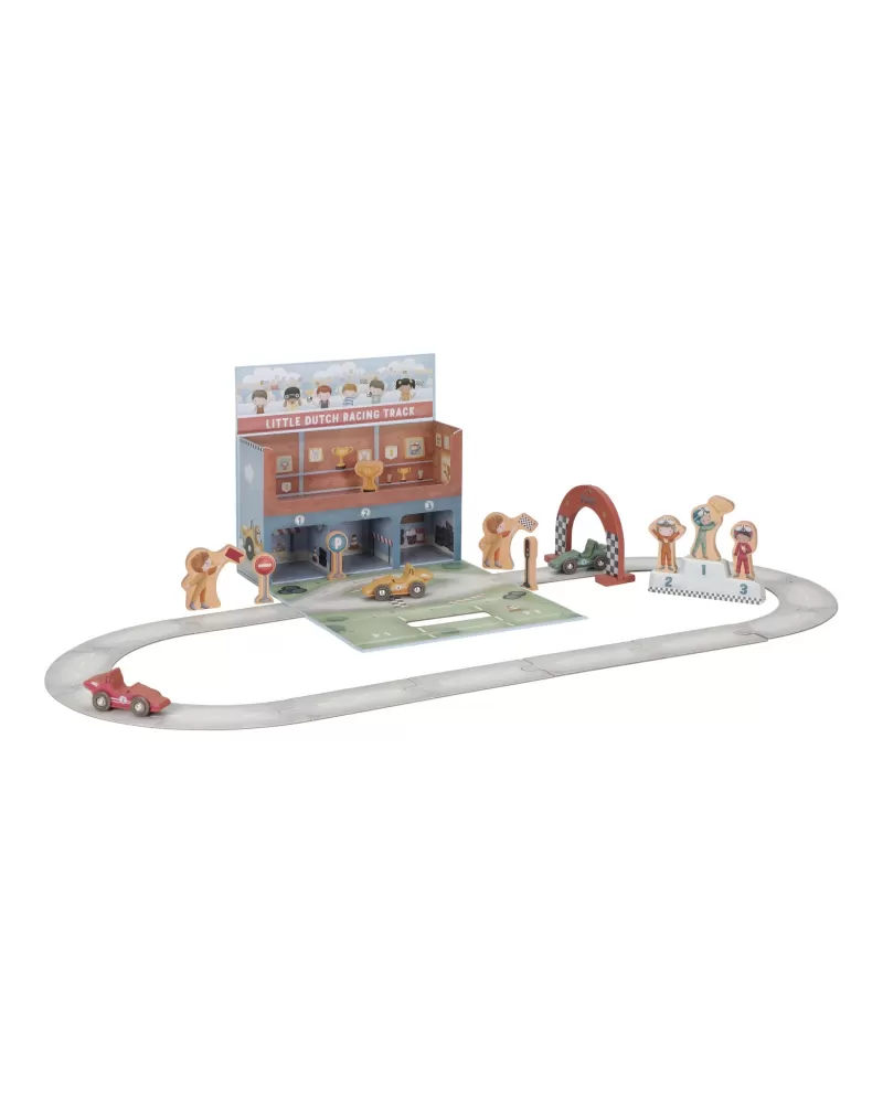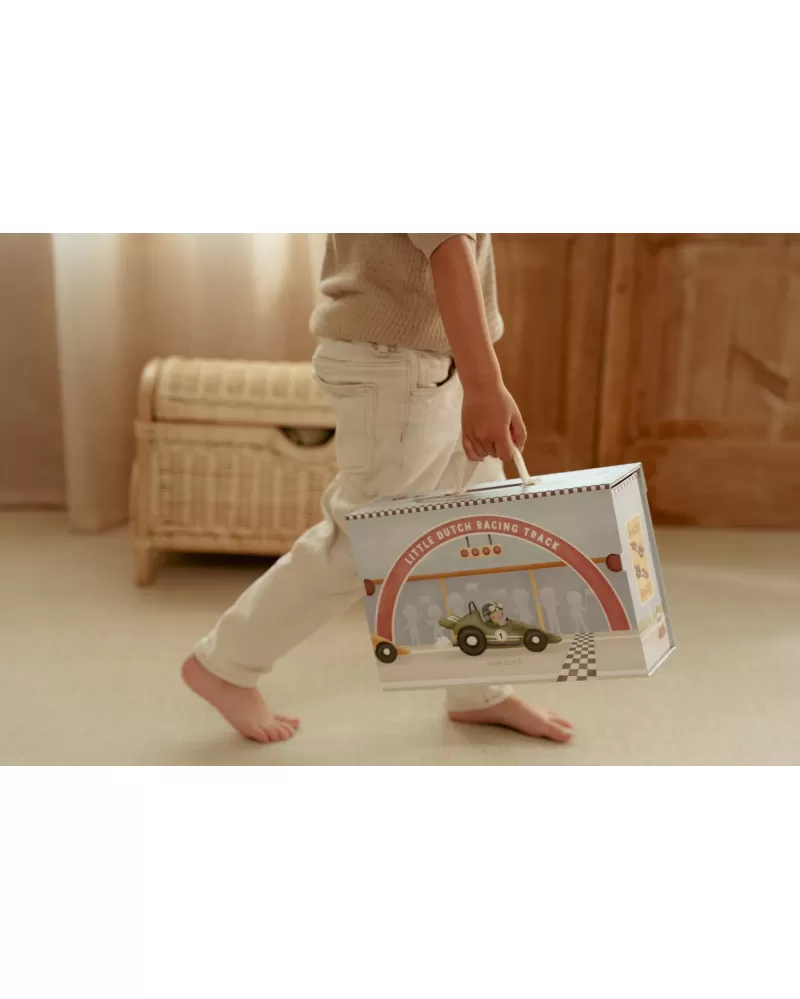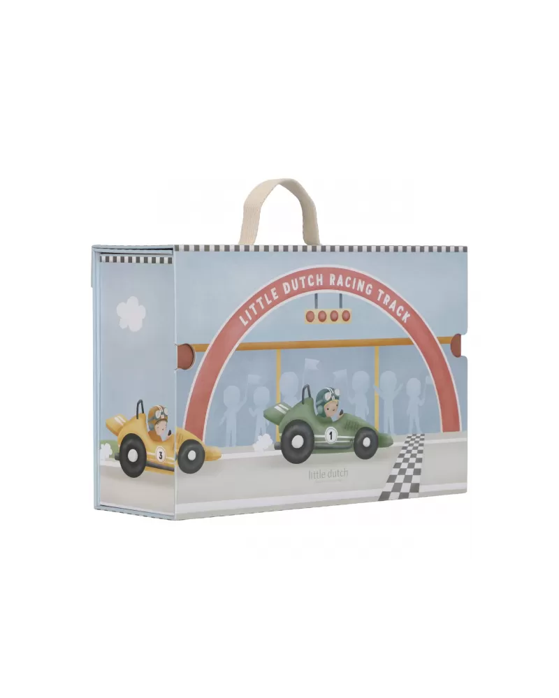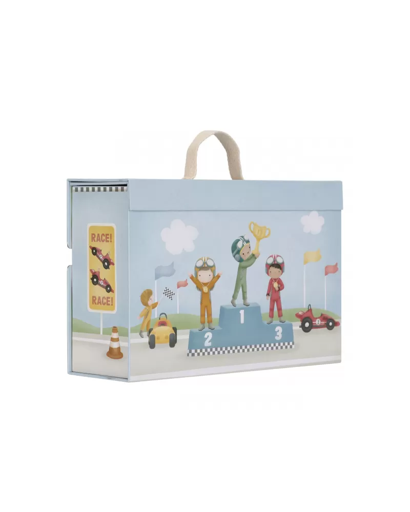 Nastartujte motory, závod začíná! Tato závodní dráha Little Dutch ukrytá v praktickém kufříku se během chvilky promění v kompletní autodráhu plnou akce. Sada obsahuje vše, co malí závodníci potřebují ke vzrušujícímu klání – dřevěná závodní auta s řidiči, cílovou pásku, dopravní značky, stupně vítězů i zlatý pohár pro šampiona.