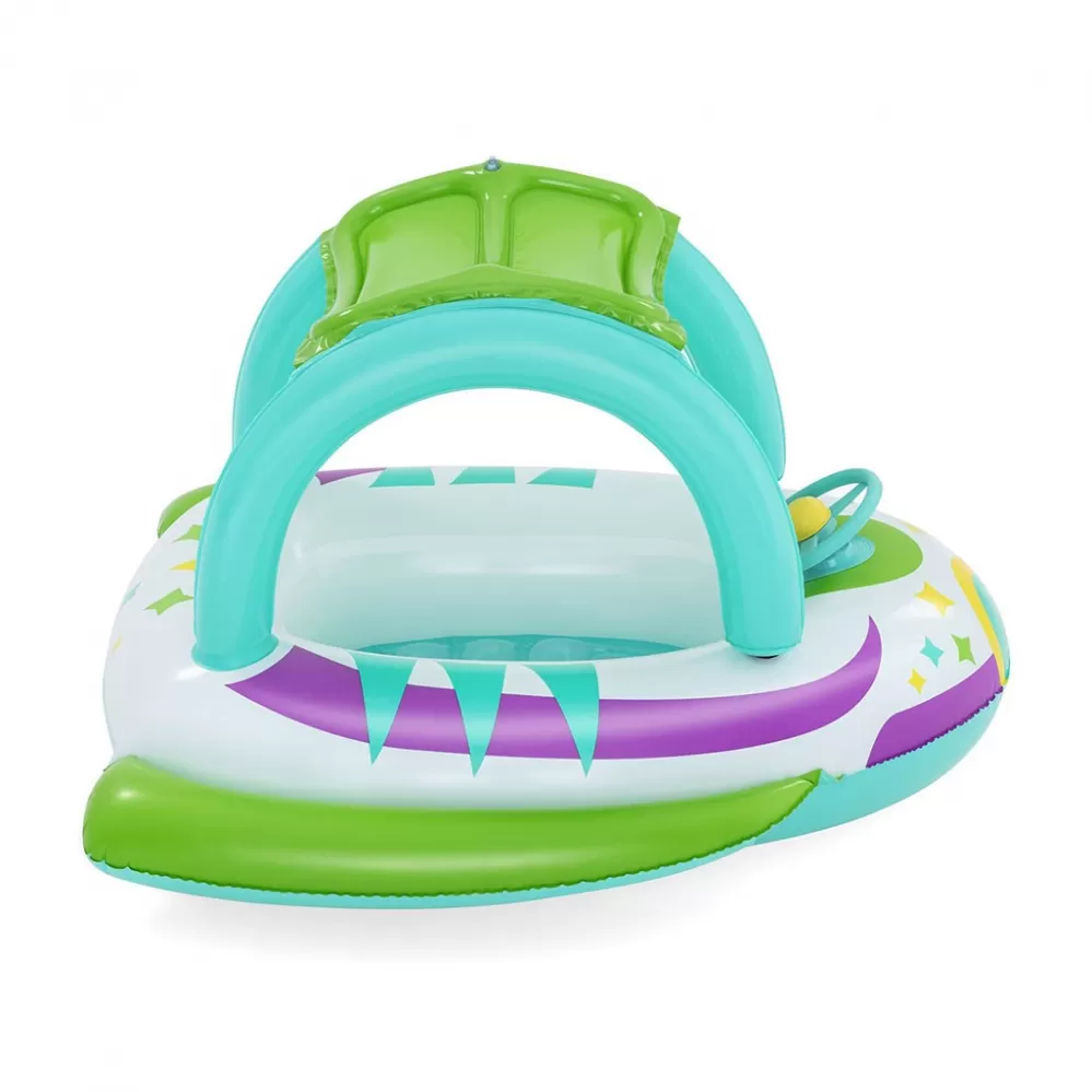 Dětský nafukovací kosmický člun Bestway. Krásný barevný dětský člun ve tvaru kosmické lodi se stříškou, která ochrání dítě před slunečními paprsky. Dovádění ve vodě milují všechny děti, proto dopřejte svým dětem pohádkové lenošení na vodě.