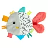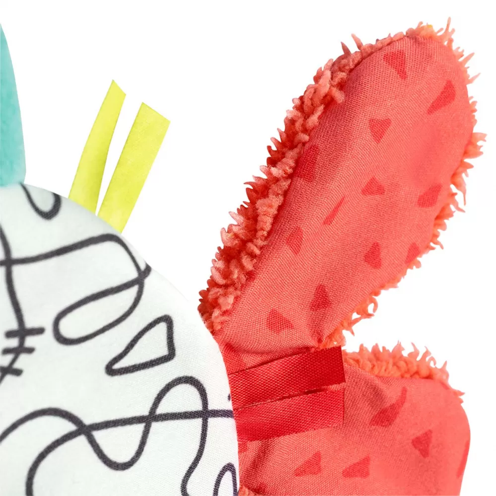 Plyšové chrastítko se spoustou aktivity prvků jako je praskací papír, kousátko, mix materiálů. Hračka na uchopení hravě podporuje sluch dítěte, smysl pro zrak, hmat, zdravé uchopení – ideální jako dáreček pro chlapce a dívky k narození, narozeninám či křtu.