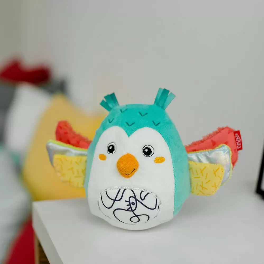Plyšové chrastítko se spoustou aktivity prvků jako je zvoneček a praskací papír. Hračka na uchopení hravě podporuje sluch dítěte, smysl pro zrak, hmat, zdravé uchopení a logické myšlení – ideální jako dáreček pro chlapce a dívky.