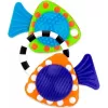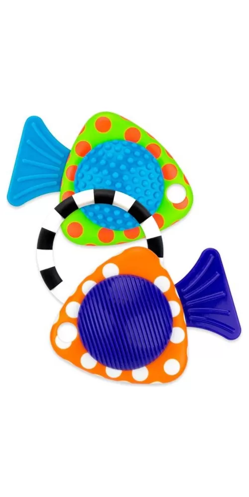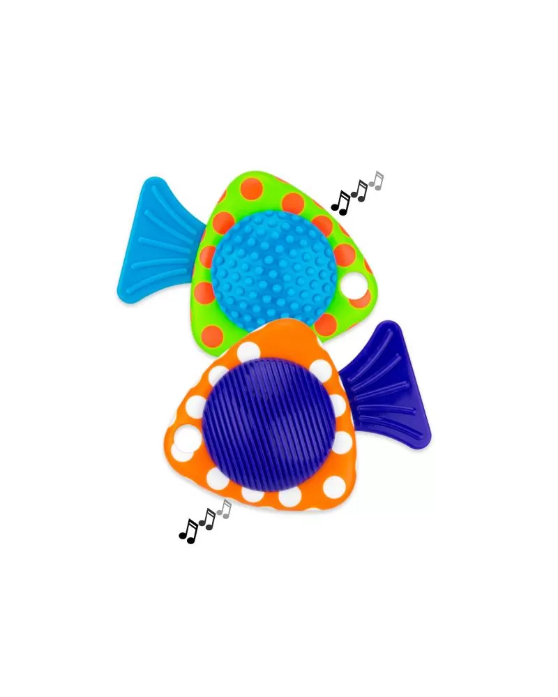 Chrastítka ve tvaru rybiček po zmáčknutí vydávají zvuky. Součástí hračky je černobílý kroužek, kterým můžete obě rybičky spojit dohromady. Ocas rybiček slouží jako kousátko.