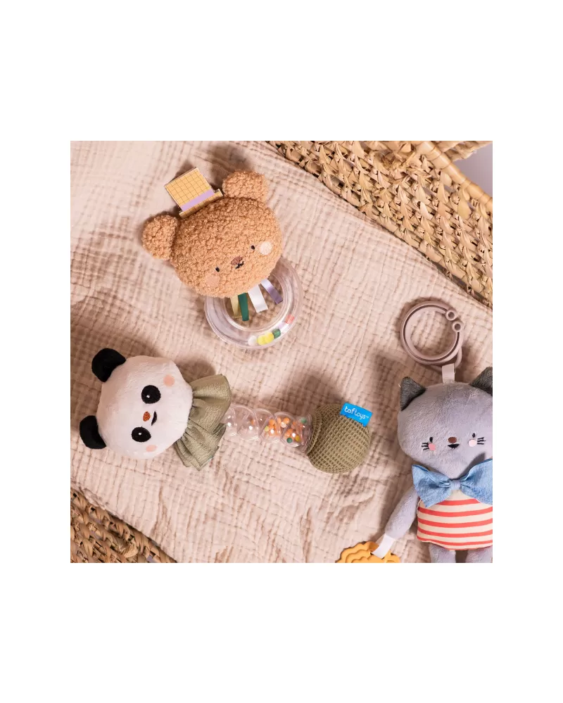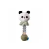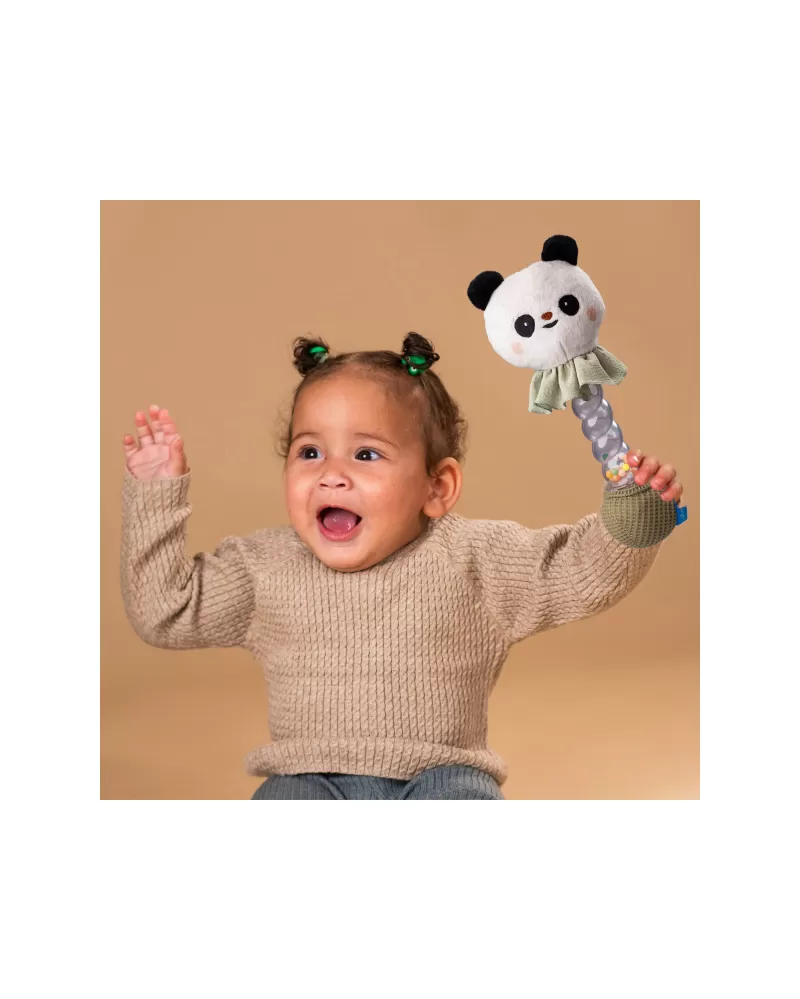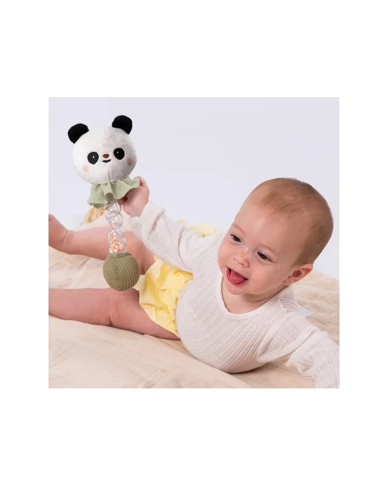 Chrastítko tvoří měkká plyšová hračka ve tvaru usměvavé pandy a průhledné plastové držadlo naplněné barevnými korálky. Uklidňující zvuk přesýpajících se korálků připomíná zvuk padajících kapek deště.