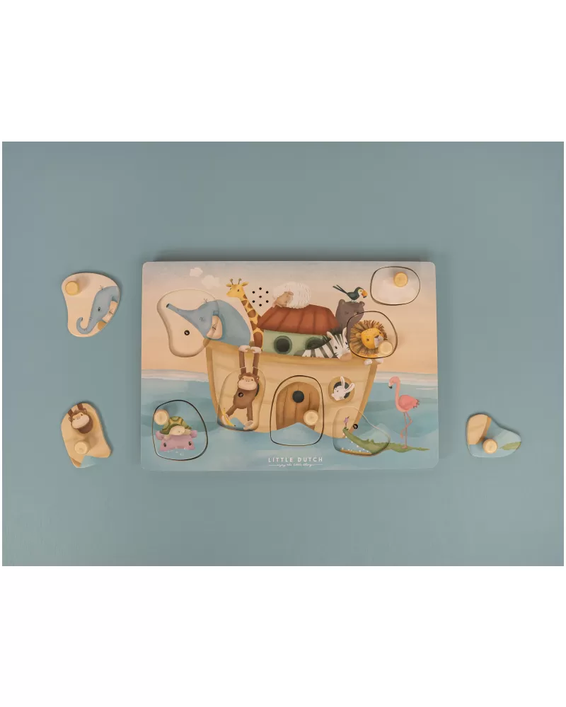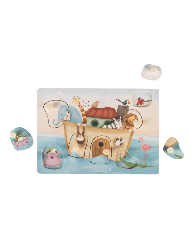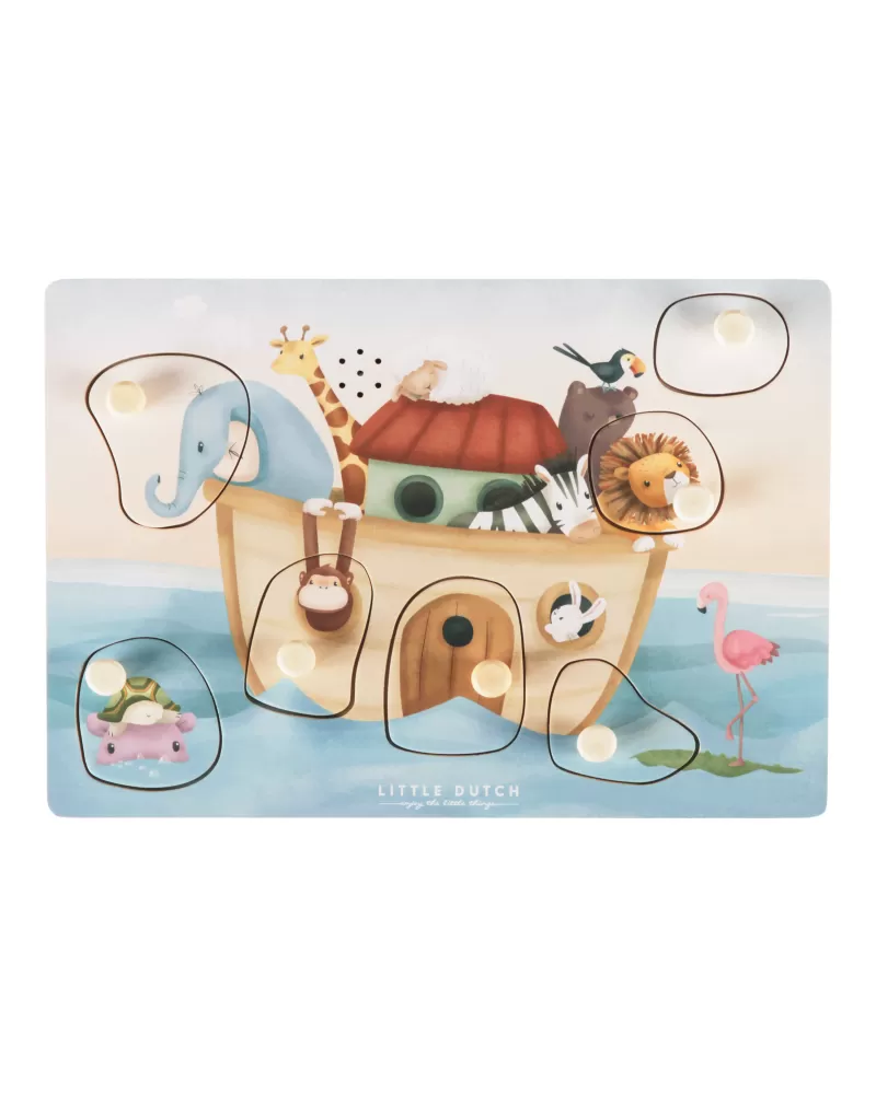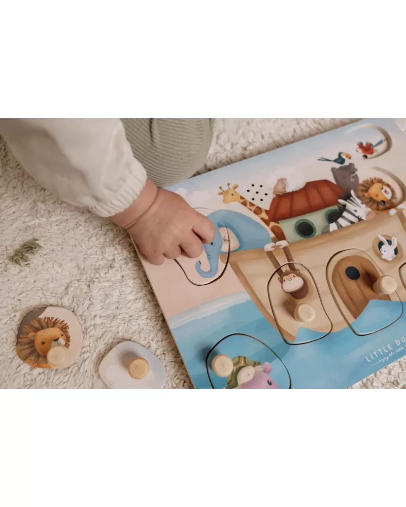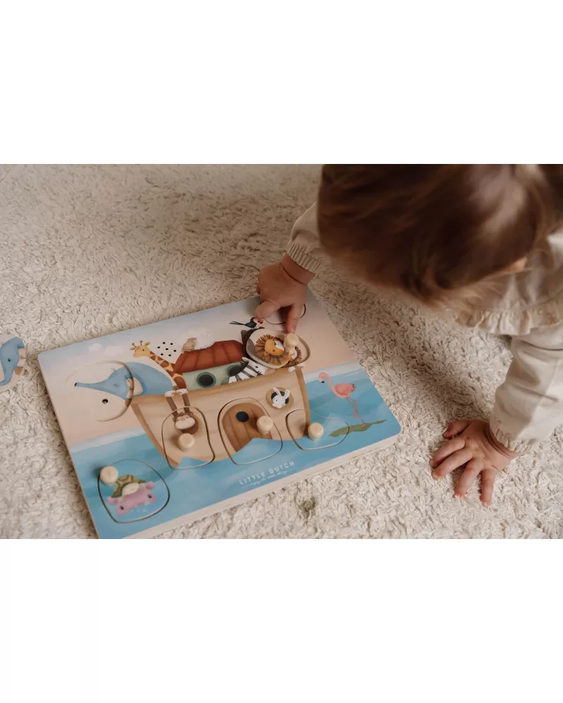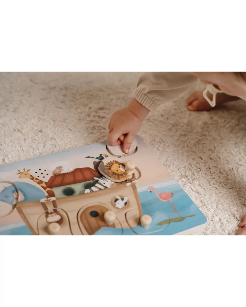 Poznávejte spolu s vaším dítětem, která zvířata plují na Noemově arše a jaké zvuky vydávají. Když dítě vloží správný tvar do otvoru na herní desce, ozve se např. hlas slona či lva nebo bublání pod hladinou.