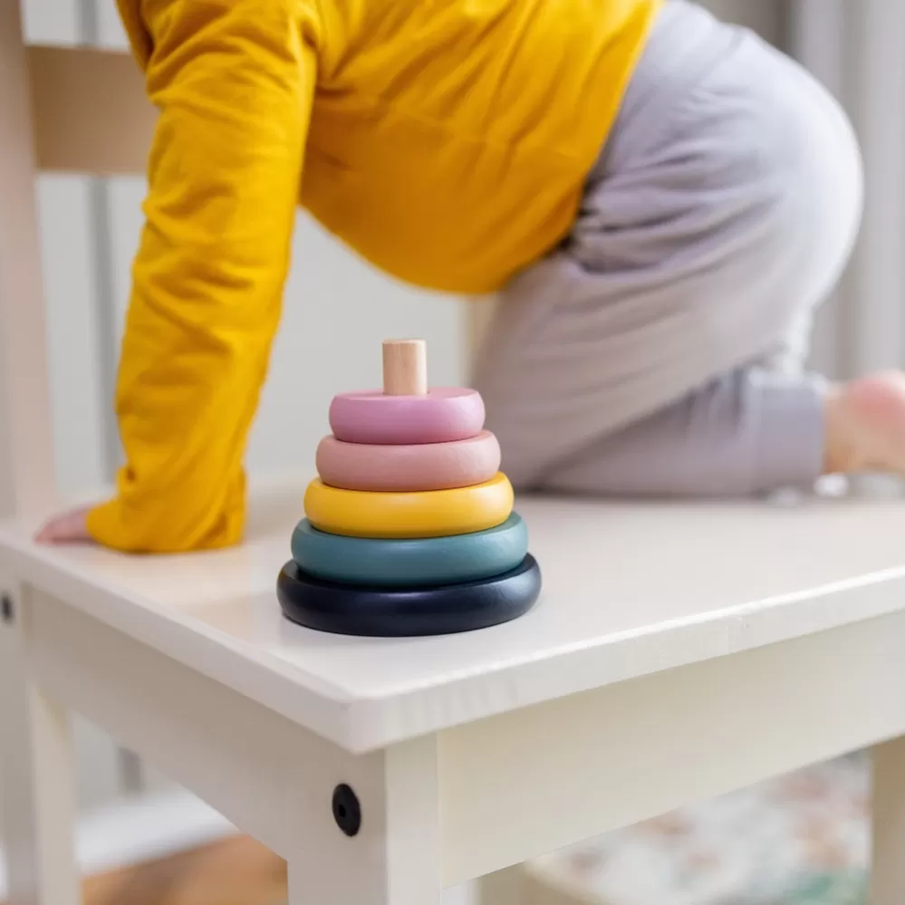 Stohovací kužel z jiné planety! Kolekce WOOD OF MARS Kolekce dřevěných hraček WOOD OF MARS je víc než jen sada kostek. Je to jedinečný svět, ve kterém se rozvíjí dětská představivost, motorické schopnosti a kreativita. Tyto hračky z jiného světa vybízejí k objevování nových dimenzí hry, kde každý prvek stimuluje rozvoj a schopnost prostorového myšlení. Každý kousek kolekce je pečlivě navržen tak, aby byl nejen estetický, ale aby rozvíjel také kognitivní schopnosti dětí. Jedná se o jedinečnou kombinaci vzdělávání a krásy, která dětem umožňuje tvořivě zkoumat vesmírná tajemství a rozvíjet neobyčejné schopnosti. Dřevěná skládací hračka ORBIT ve tvaru pyramidy je kombinací barevných disků různých velikostí. Každý disk byl pečlivě opracován a nemá ostré hrany, což zaručuje bezpečnou hru pro malé děti. Kromě zlepšování šikovnosti malých ručiček a koordinace oko-ruka, skládačka rozvíjí také prostorovou představivost a schopnost rozpoznávat tvary a barvy. Je ideální pro děti, které právě začínají své dobrodružství se skládáním kostek a vytvářením věží. Pyramida se skládá ze 6 barevných disků, které dítě umístí na základnu s kolíkem. Hračka dokonale rozvíjí smysl pro pozorování a učí logickému myšlení. Díky pevnému zpracování je stabilní a odolná.