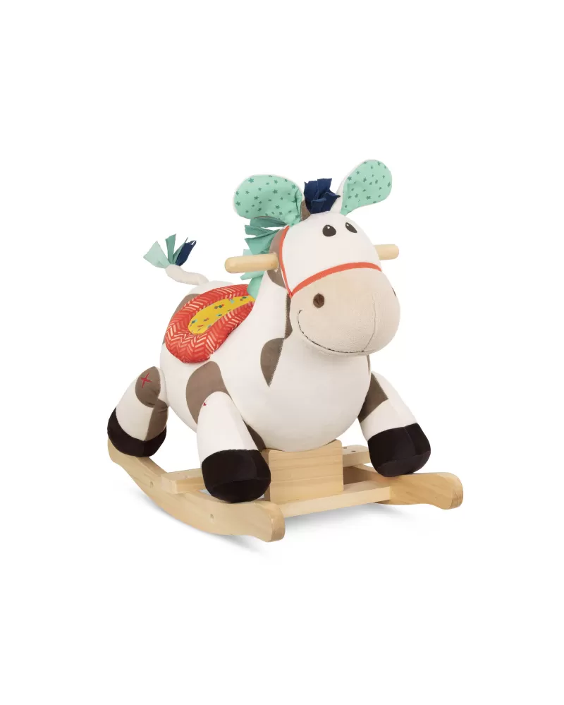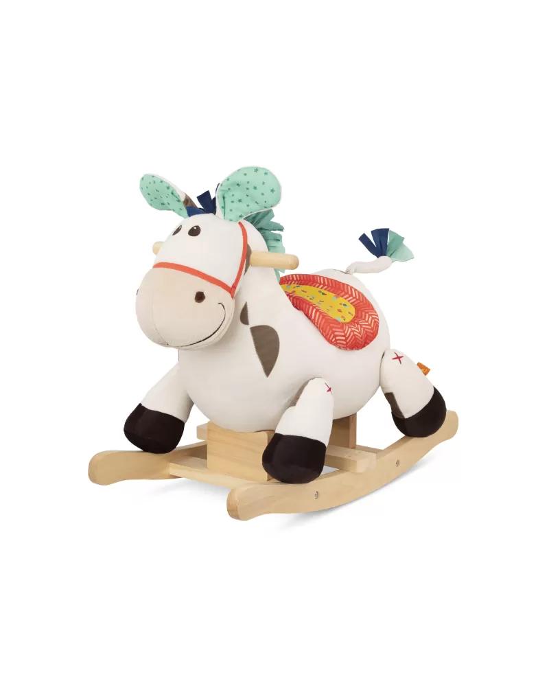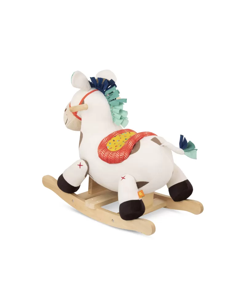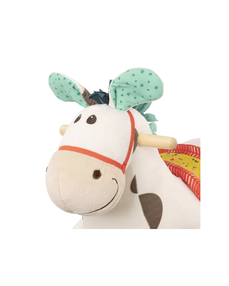 Roztomilý plyšový houpací kůň s dřevěnou základnou a držadly. Během houpání se ozývá klapot koňských kopýtek.