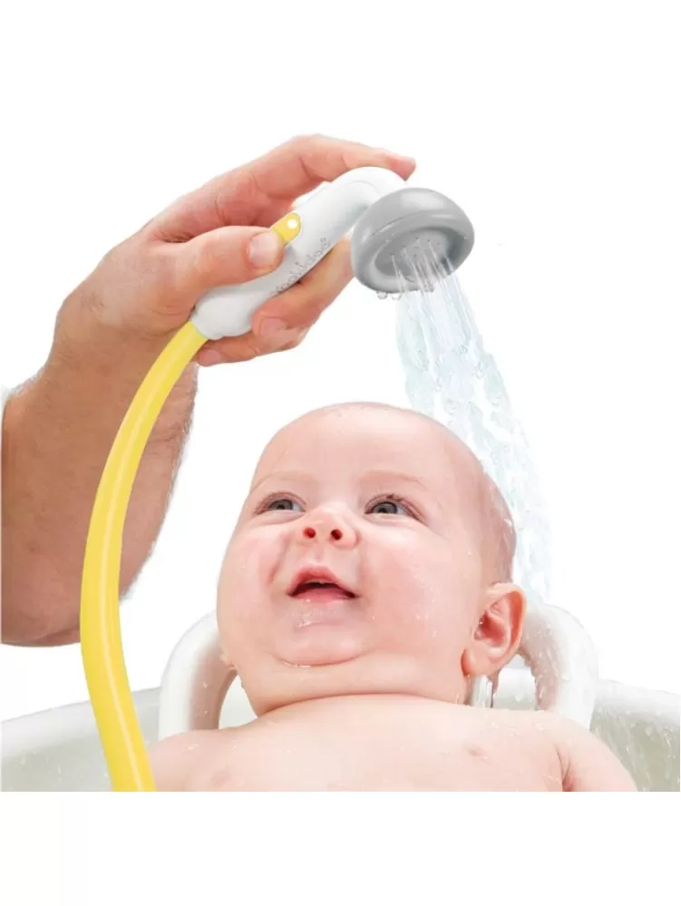 Kompaktní bateriová přenosná sprcha s jemným proudem je určena pro snadnou manipulaci při koupání dětí. Sprchová hlavice je ergonomicky navržena a aktivuje se stlačením oboustranného tlačítka, čímž umožňuje snadnou regulaci průtoku vody se zachováním konstantní teploty vody. V pozdější fázi je možné sprchu použít jako hračku do koupele.