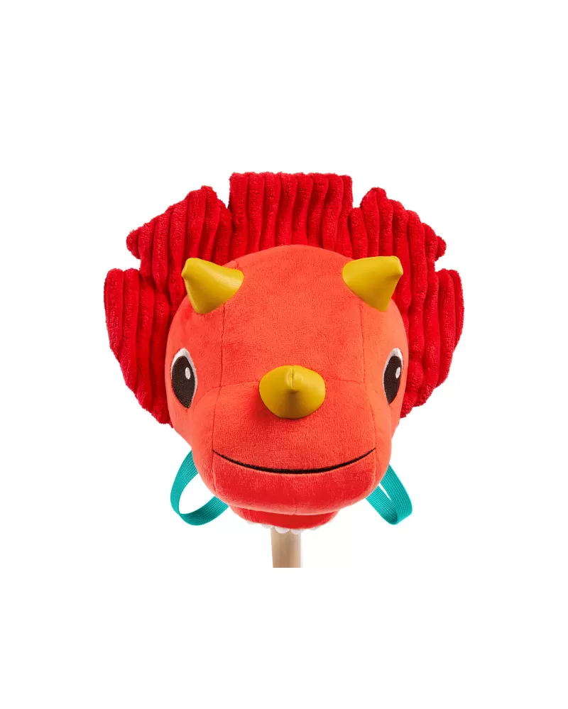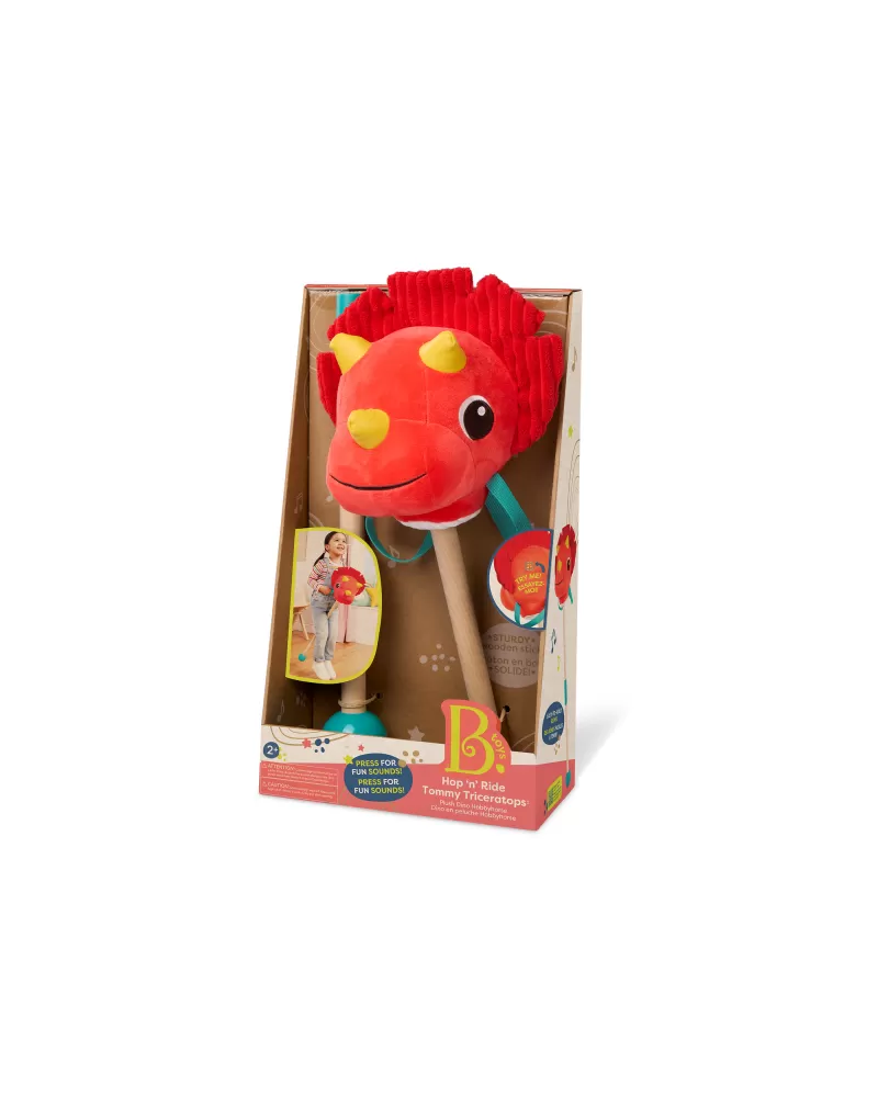 Připravte se na jízdu do pravěkého světa s roztomilým Tommy Triceratopsem od B. Toys! Tento plyšový dinosaurus na tyči je originální verzí klasické hračky "hobby horse" a zaručí dětem spoustu aktivní zábavy. Hebká hlava z různých senzorických materiálů stimuluje hmat, stisknutím tlačítka se navíc ozvou veselé dinosauří zvuky. Děti si mohou nasednout, pevně chytit otěže a rozběhnout se za dobrodružstvím. Díky pogumované spodní části nezanechá tyč škrábance na podlaze.