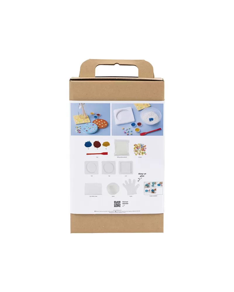 Skvělá zábava pro děti i rodiče! Tato sada umožní dětem od 5 let vytvořit si barevné stojánky z cementu, které si samy namíchají, odlijí a ozdobí. Ideální projekt pro první seznámení s odléváním a tvoření s barvami.