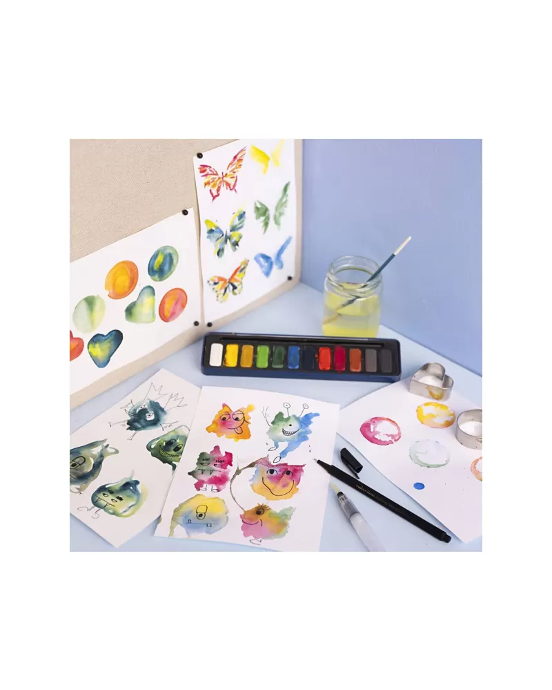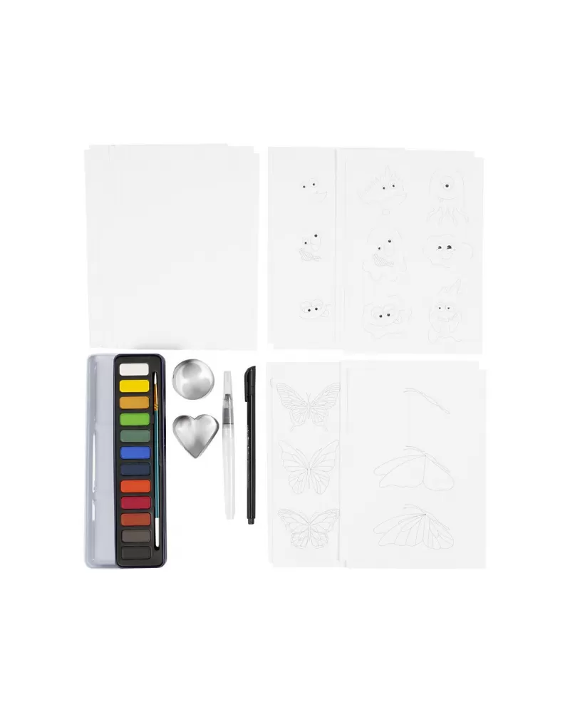 • V sadě najdete vše potřebné – akvarelovou paletu, vodní štětec, formy, papír i fix