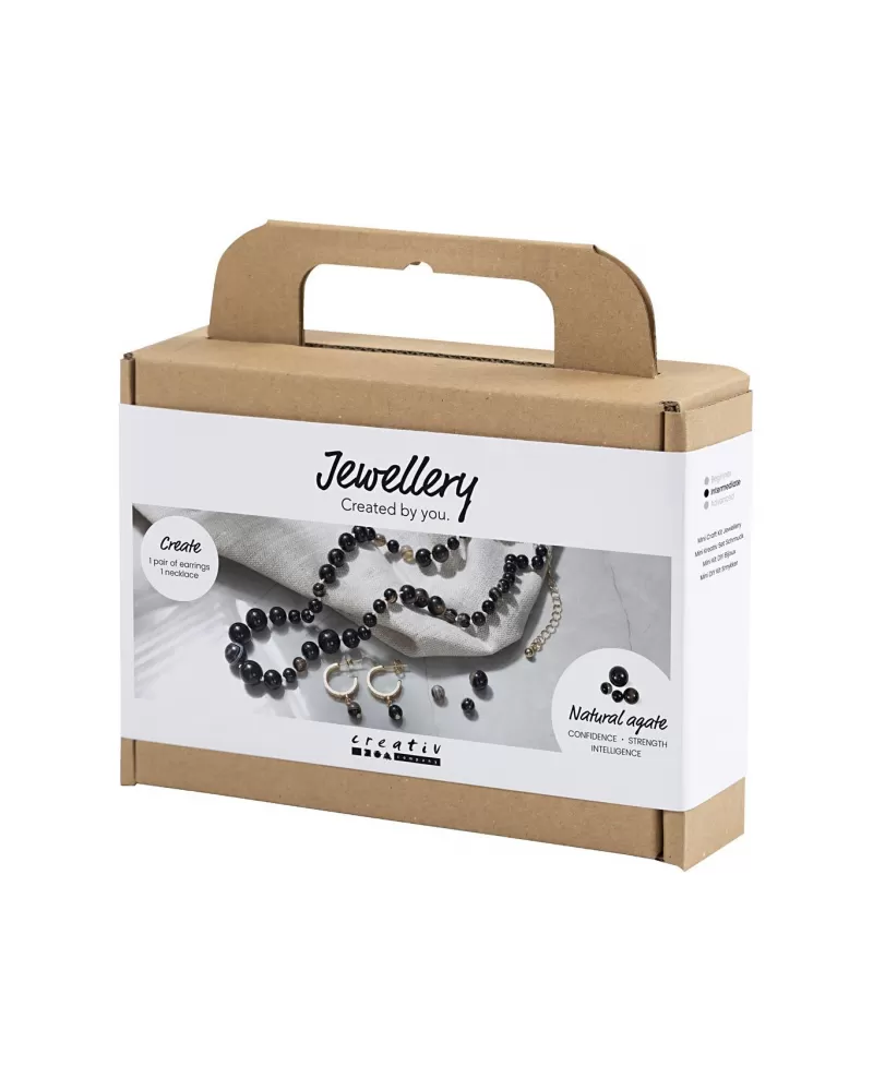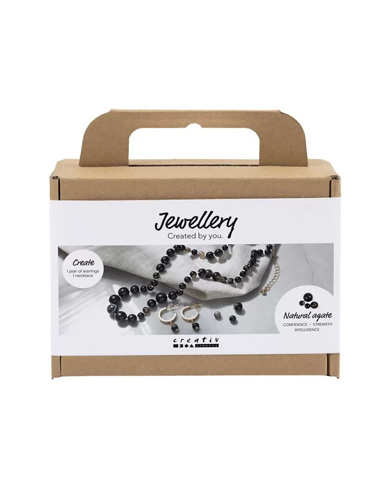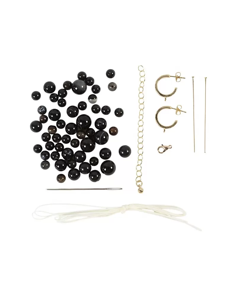 Ručně vyrobené šperky s hlubokým významem. Tato kreativní sada vám umožní vytvořit náhrdelník a pár náušnic s přírodními korálky z achátu – polodrahokamu známého svým mystickým vrstveným vzhledem a posilující energií.