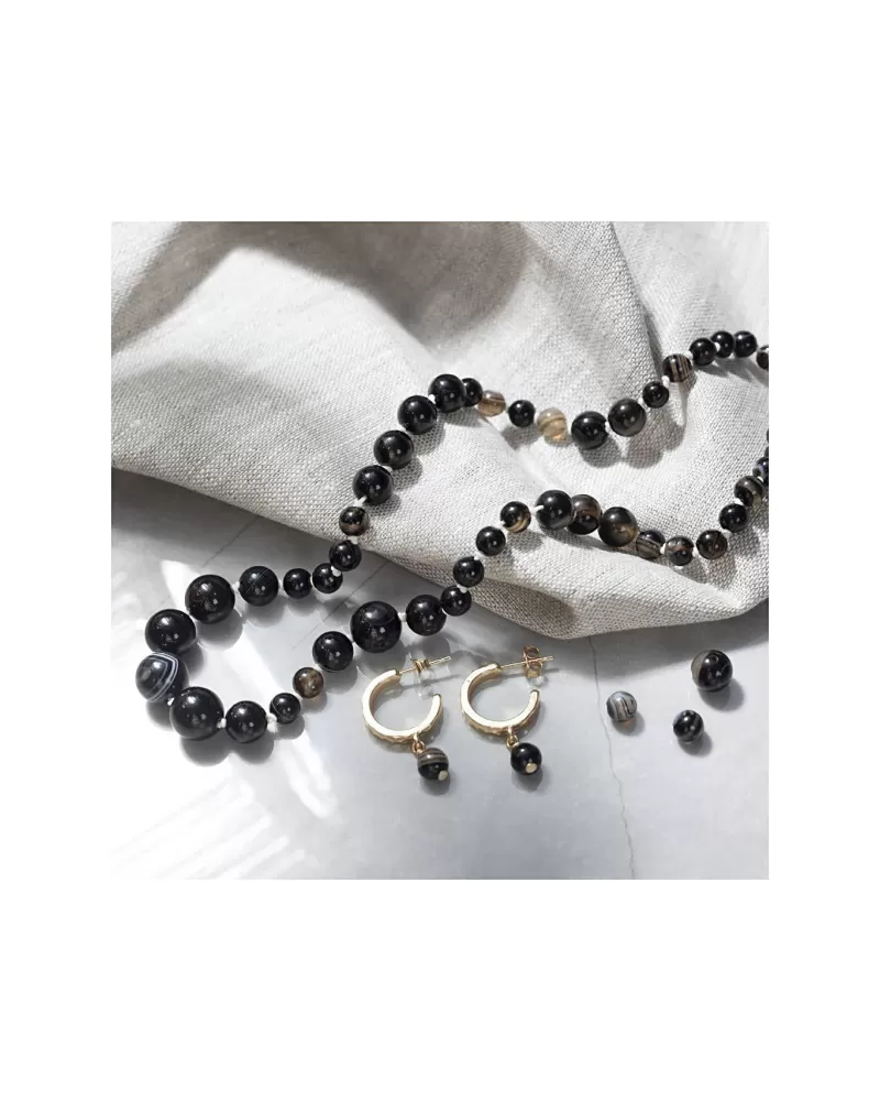• Každý korálek z achátu je jedinečný – s černým základem a jemnými bílými pruhy