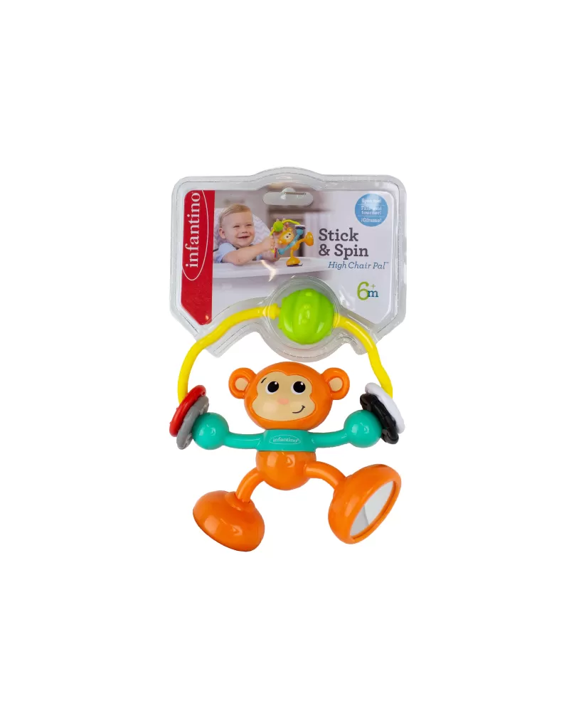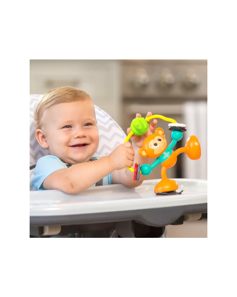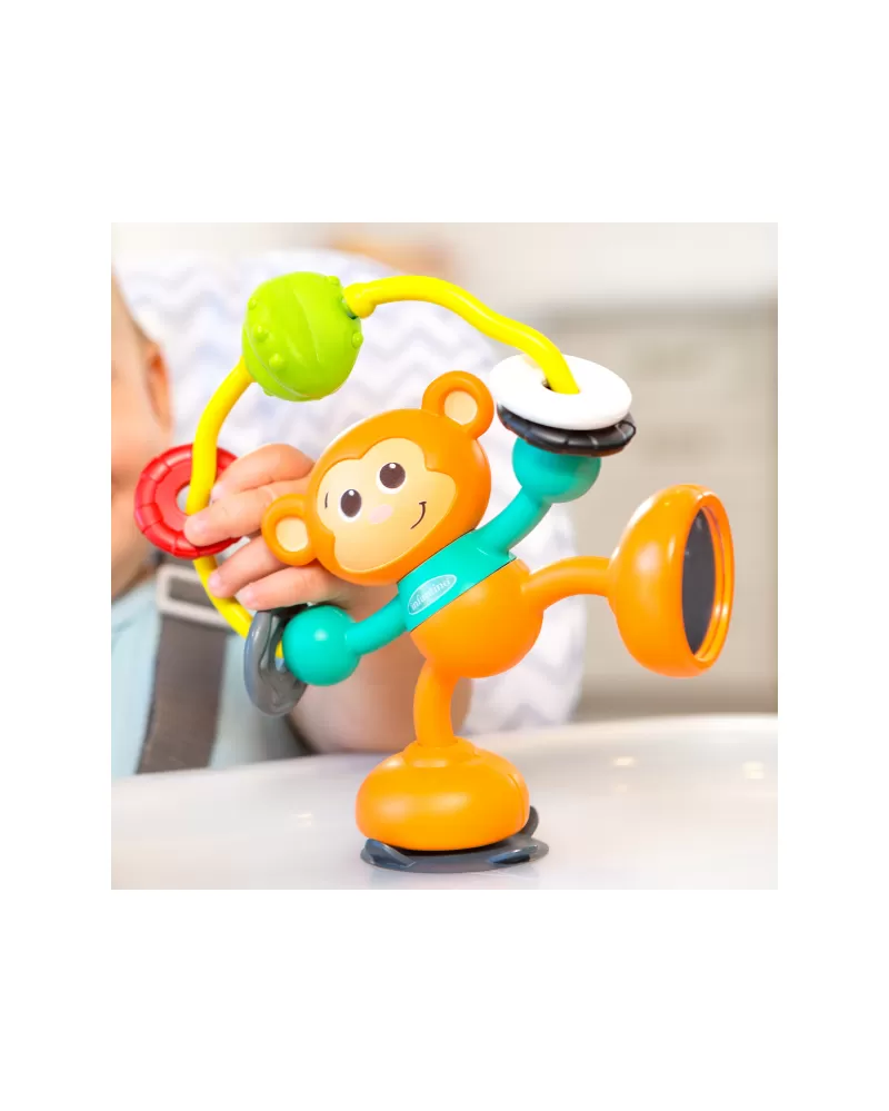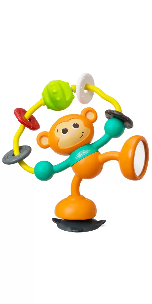 Hračku v podobě rošťácké opičky s přísavkou na jedné noze lze postavit na pult vysoké židličky, stůl apod. Při otáčení opičky se ozývá cvakání, pohyblivé kroužky a zrcátko na spodní straně druhé nohy lákají ke zkoumání. Hračka rozvíjí jemnou motoriku dítěte a učí jej vztahu příčina / následek.