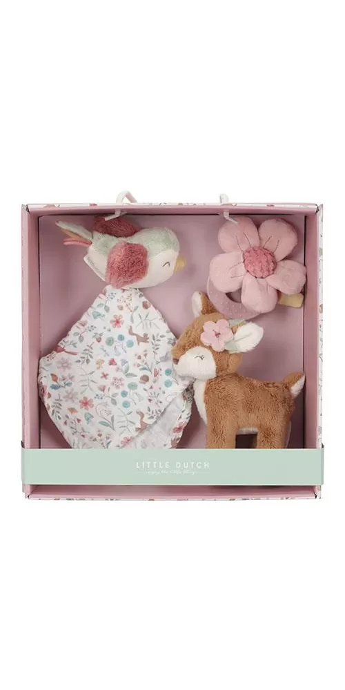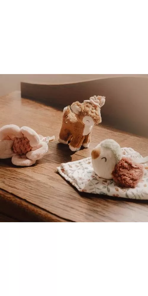 Krásná dárková sada plyšových hraček je ideální jako dárek pro novorozené miminko. Sada obsahuje kousátko s kytičkou, muchláčka s ptáčkem a plyšovou srnku.