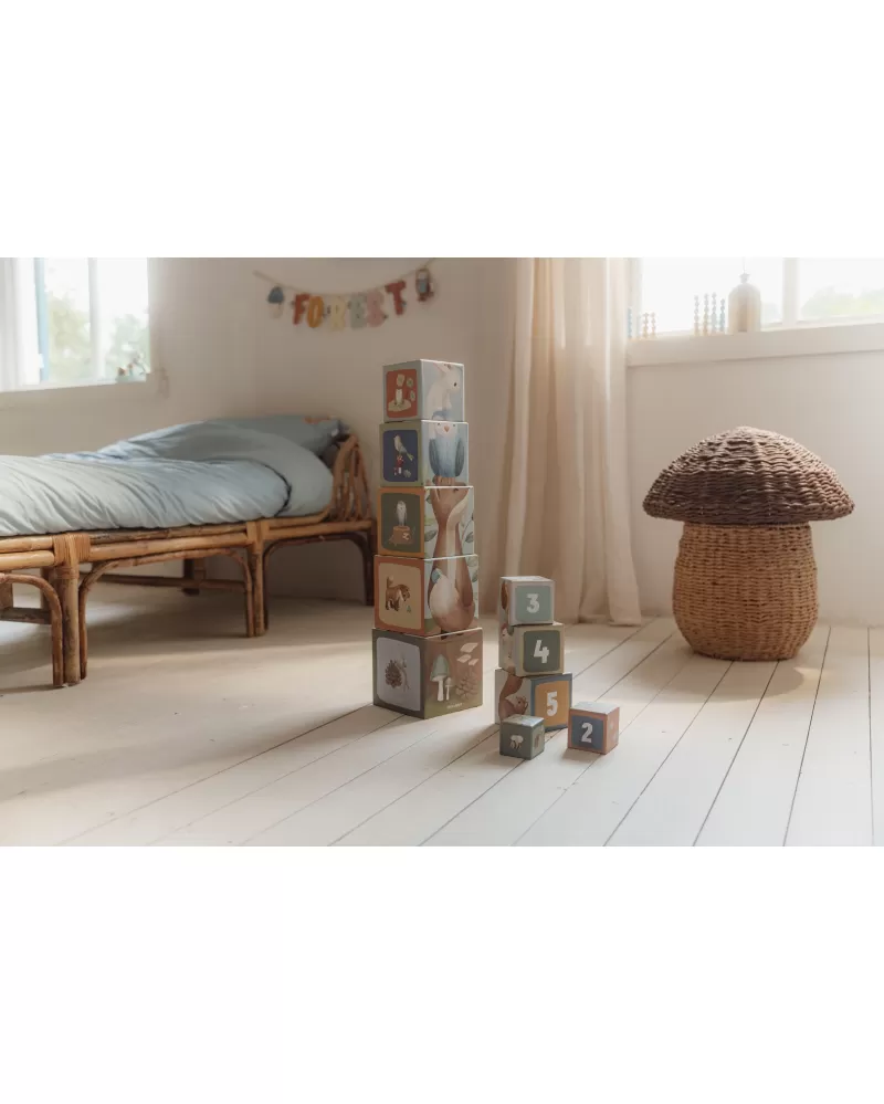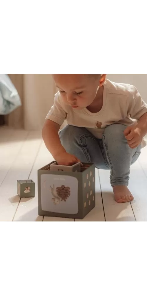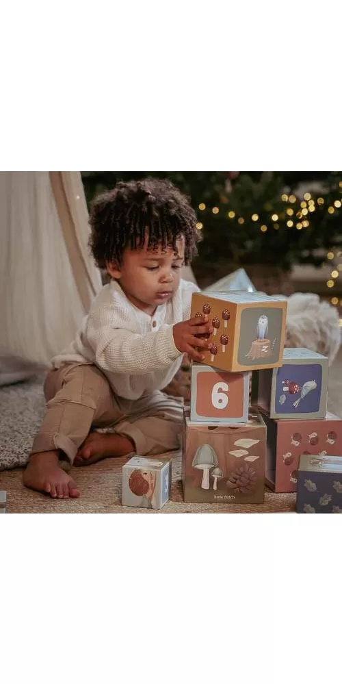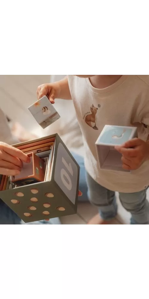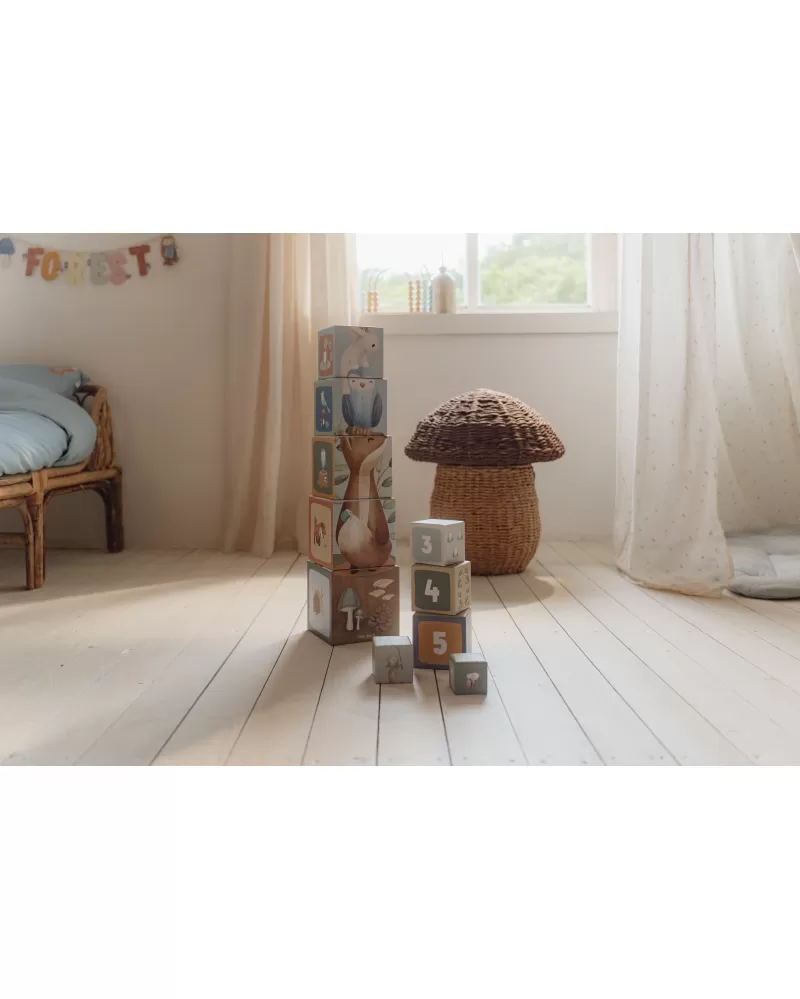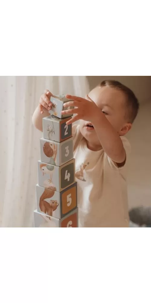 Barevné kartonové kostky s krásnými ilustracemi motivů ze života v lese. Nechte vaše dítě kostky skládat na sebe do vysoké věže nebo vedle sebe podle velikosti. Ve starším věku se dítě s pomocí očíslovaných kostek může hravým způsobem učit počítat i rozpoznávat číslice.