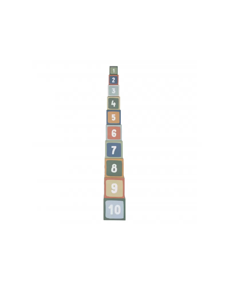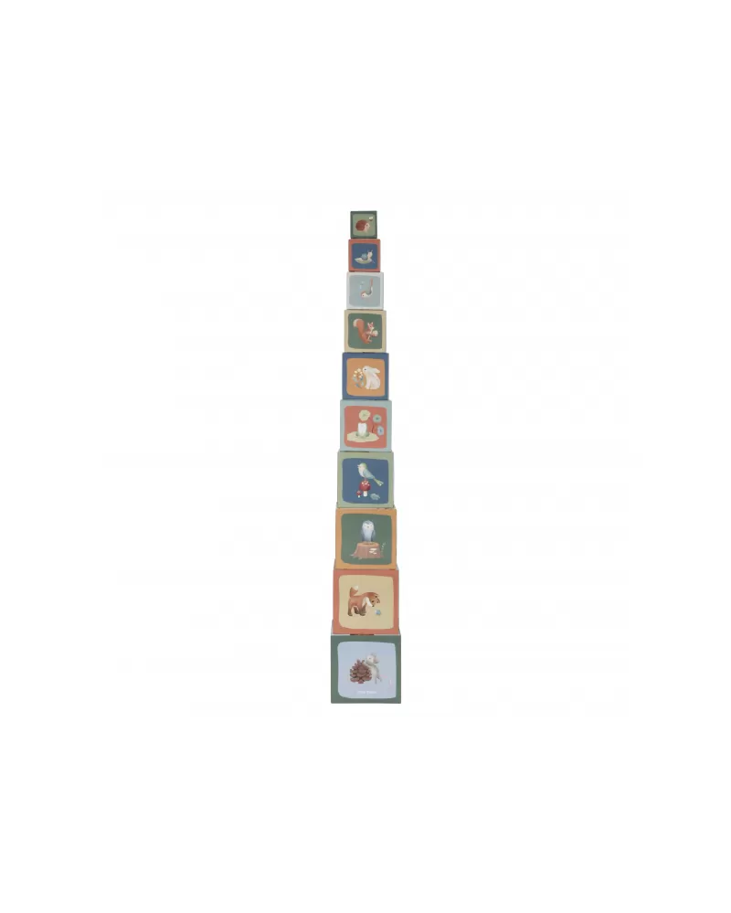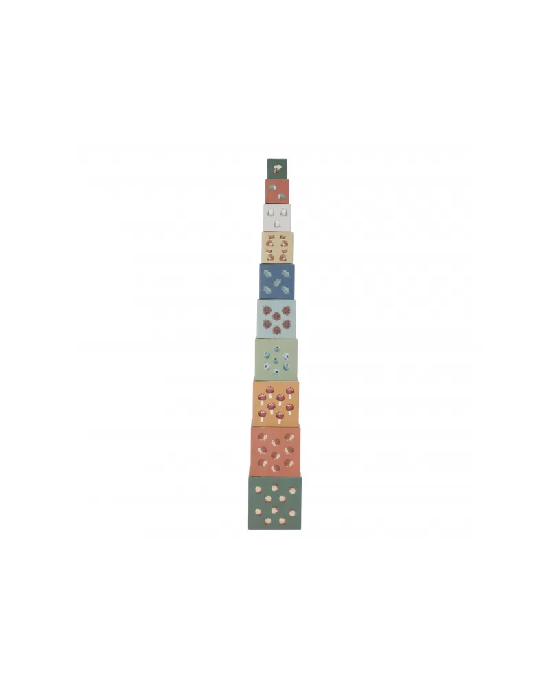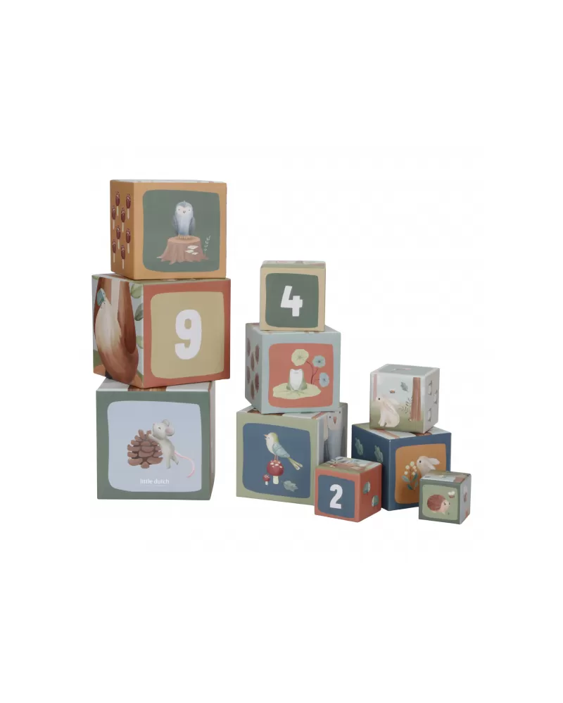 Barevné kartonové kostky s krásnými ilustracemi motivů ze života v lese. Nechte vaše dítě kostky skládat na sebe do vysoké věže nebo vedle sebe podle velikosti. Ve starším věku se dítě s pomocí očíslovaných kostek může hravým způsobem učit počítat i rozpoznávat číslice.