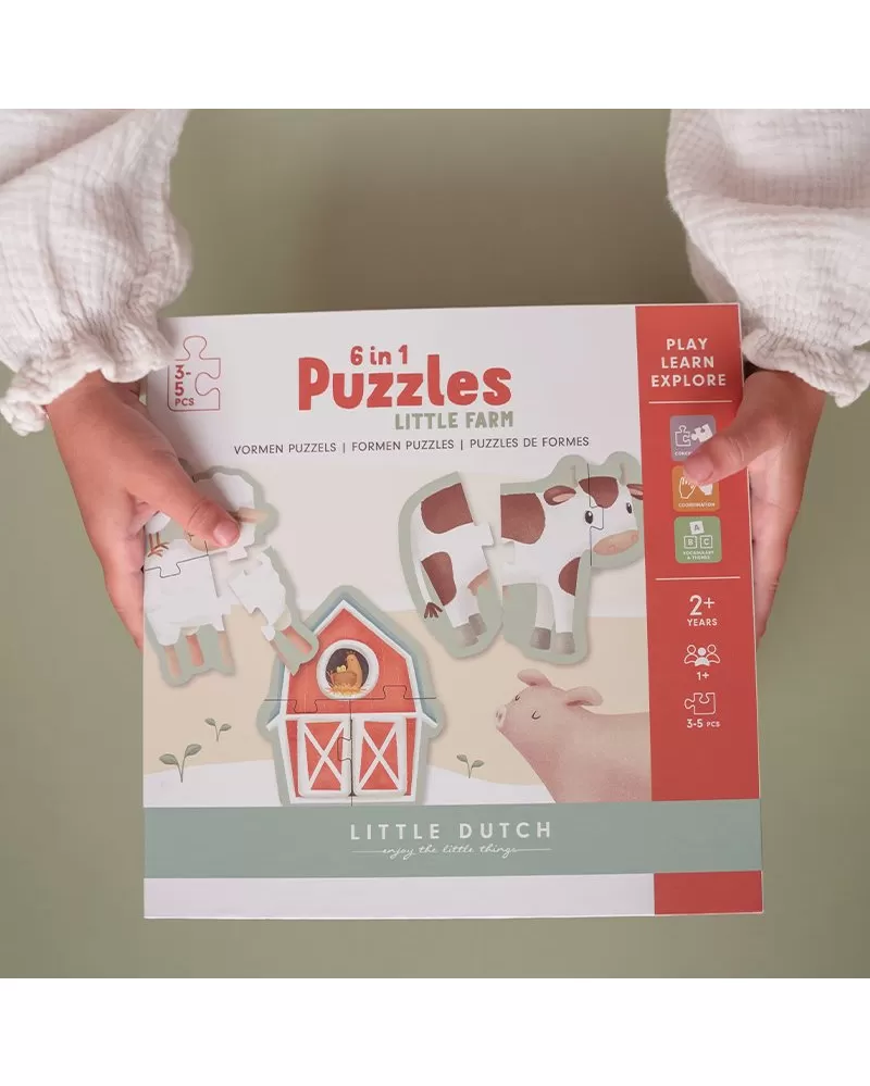 Sada obsahuje 6 variant puzzle skládaček pro nejmenší s krásnými ilustracemi ze života na farmě. Jednotlivé skládačky mají 3, 4 nebo 5 dílků z pevného kartonu, které jsou dokonale tvarované pro malé dětské ručičky.