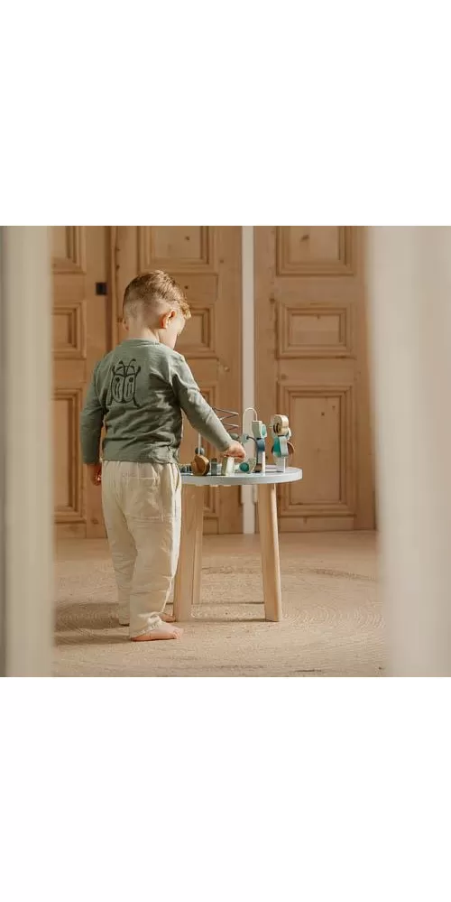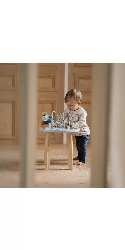 Díky stabilnímu dřevěnému provedení je stolek vhodný i pro děti, které hledají oporu při prvních krůčcích.