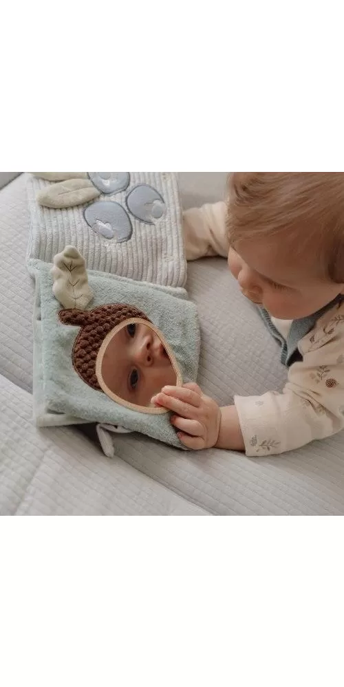 Měkká textilní knížka s krásnými motivy ze života v lese upoutá pozornost vašeho dítěte množstvím aktivit, ukrytých na jednotlivých stránkách. Ke zkoumání a prohlížení lákají šusticí i pískací stránky, různorodé textury nebo např. bezpečné zrcátko. Knížka pomáhá rozvíjet jednotlivé smysly dítěte i koordinaci ruka / oko.
