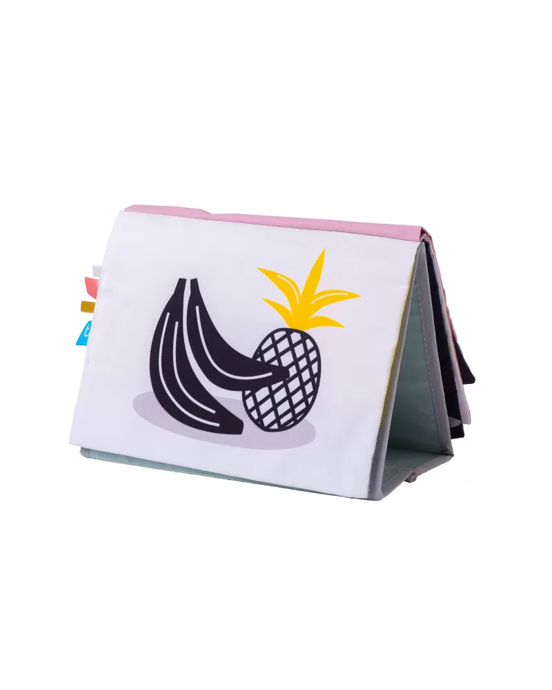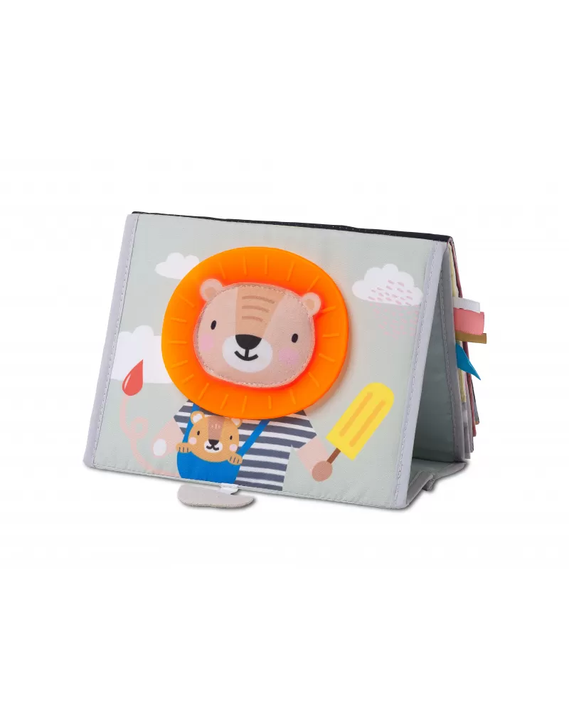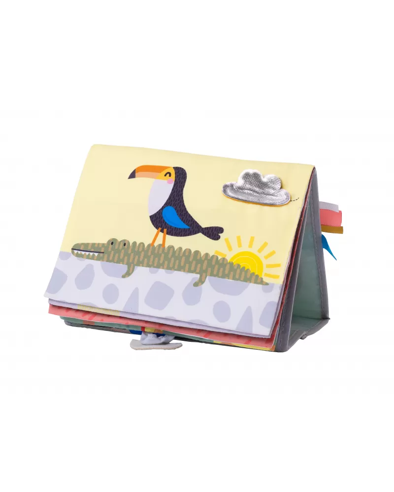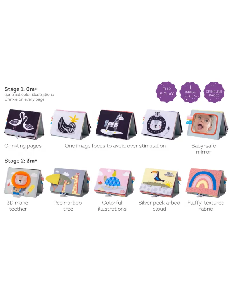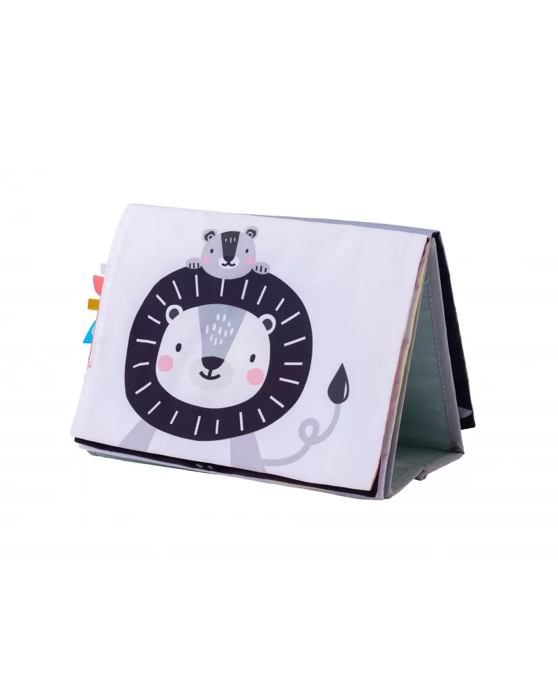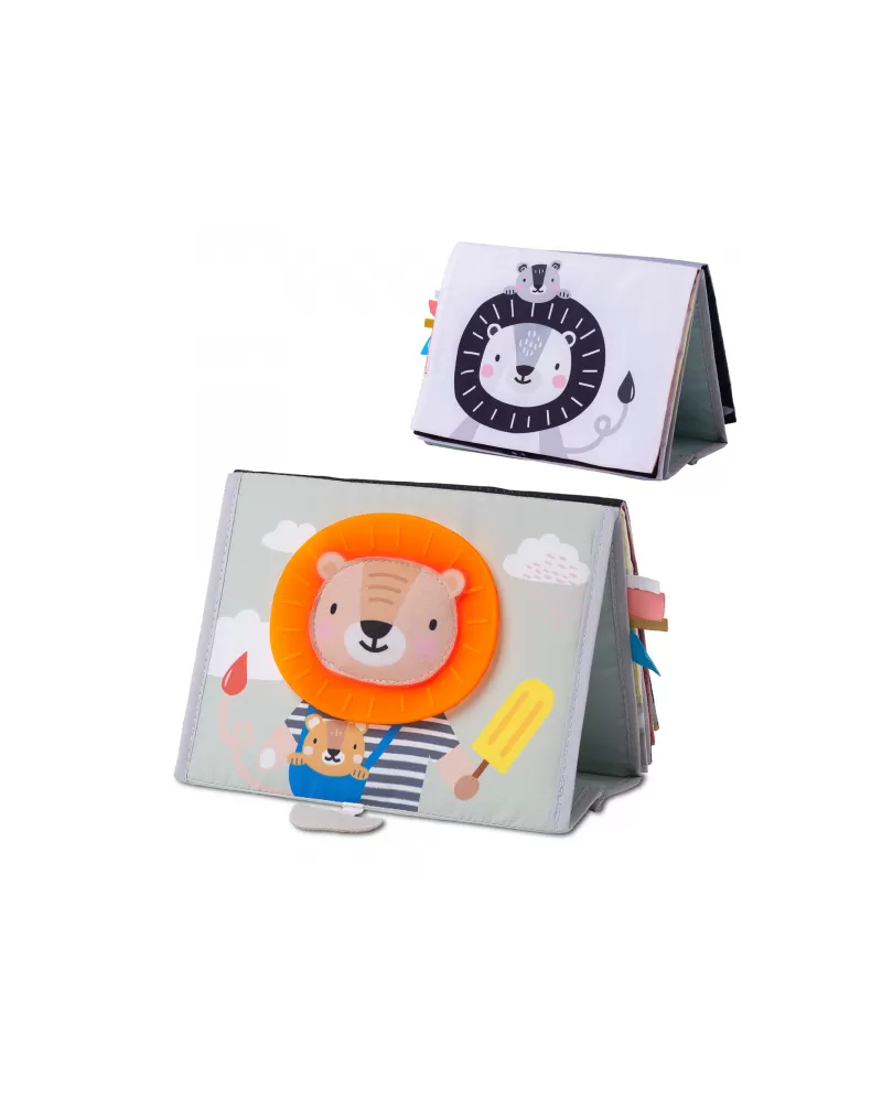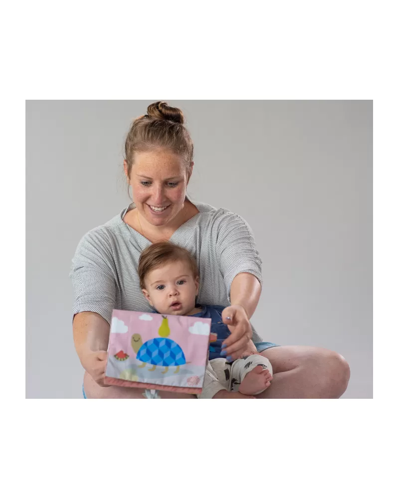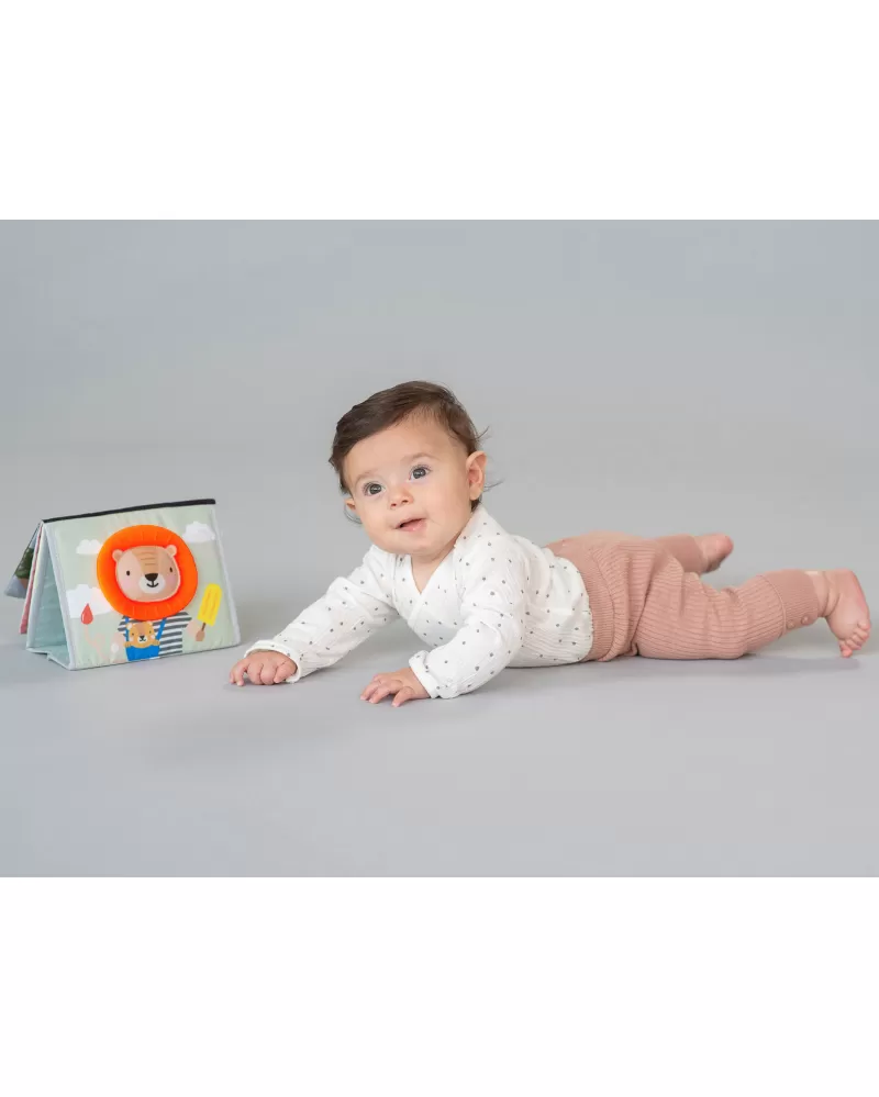 Textilní knížka s otáčecími šustícími stránkami ve tvaru stolního kalendáře nabízí množství neodolatelných obrázků s různorodými texturami, bezpečným zrcátkem, kousátkem apod. Ideální pro postavení před dítě při hře na bříšku.