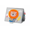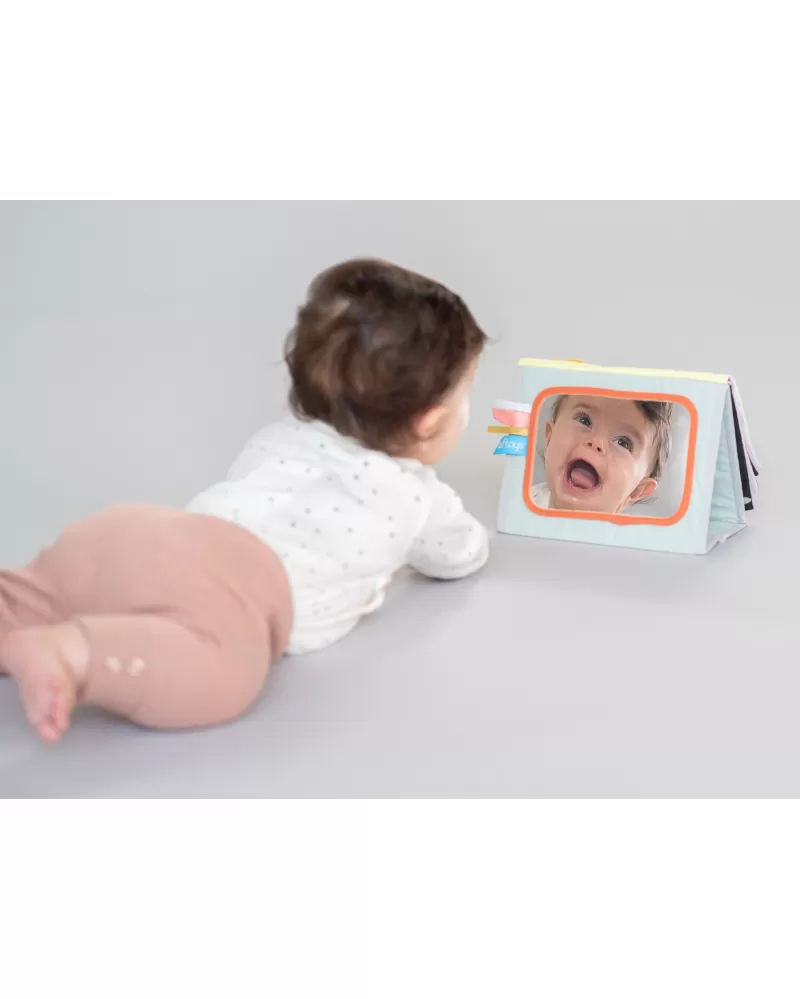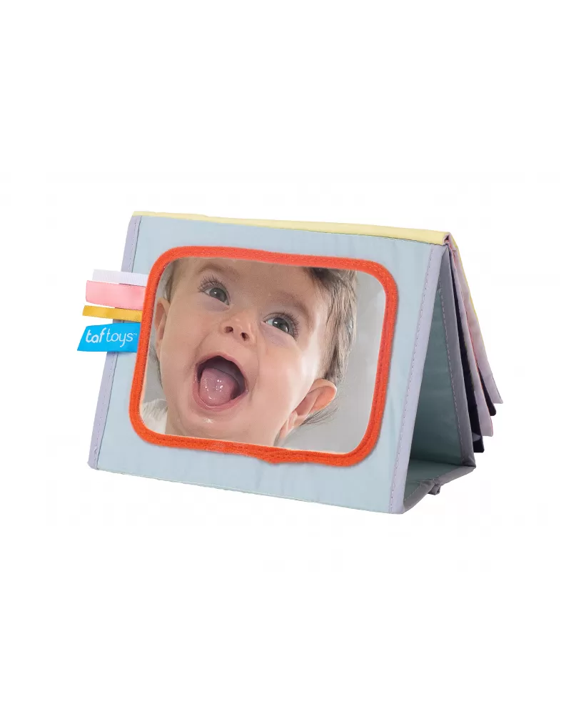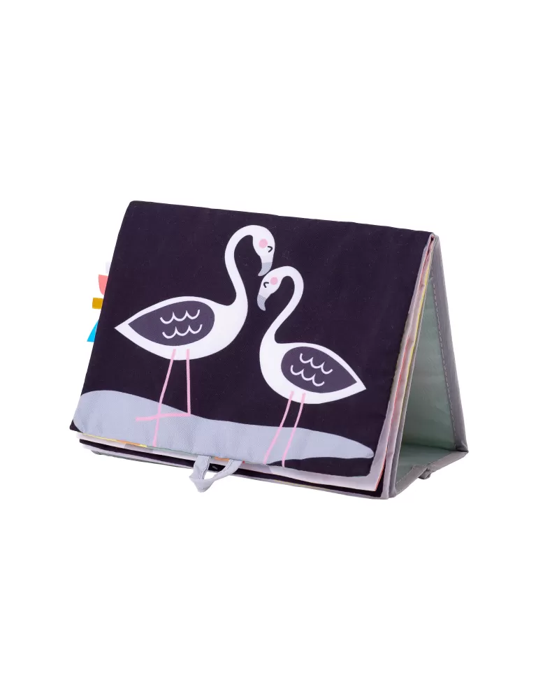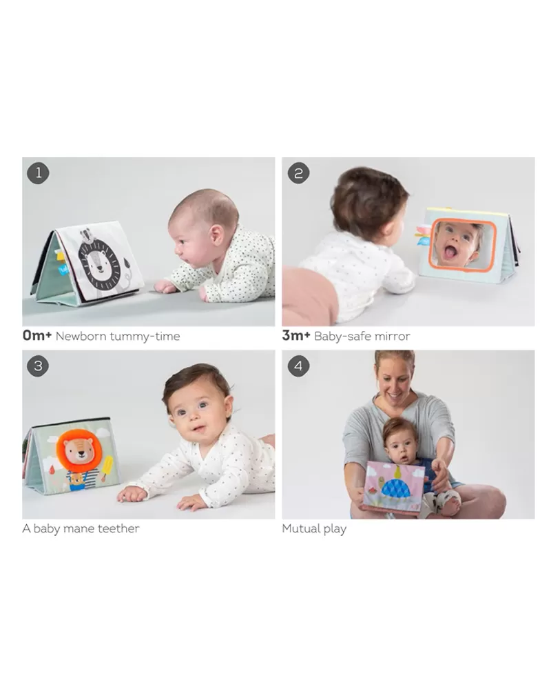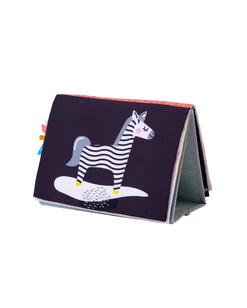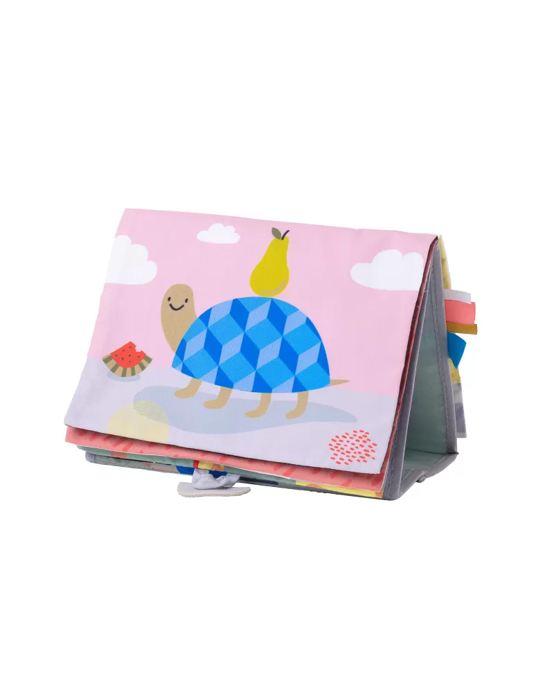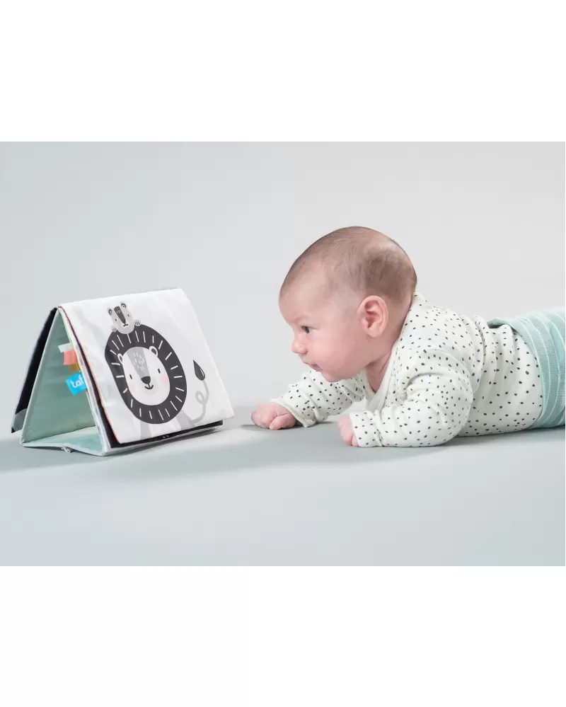 Textilní knížka s otáčecími šustícími stránkami ve tvaru stolního kalendáře nabízí množství neodolatelných obrázků s různorodými texturami, bezpečným zrcátkem, kousátkem apod. Ideální pro postavení před dítě při hře na bříšku.