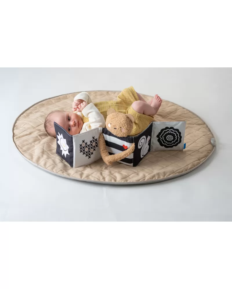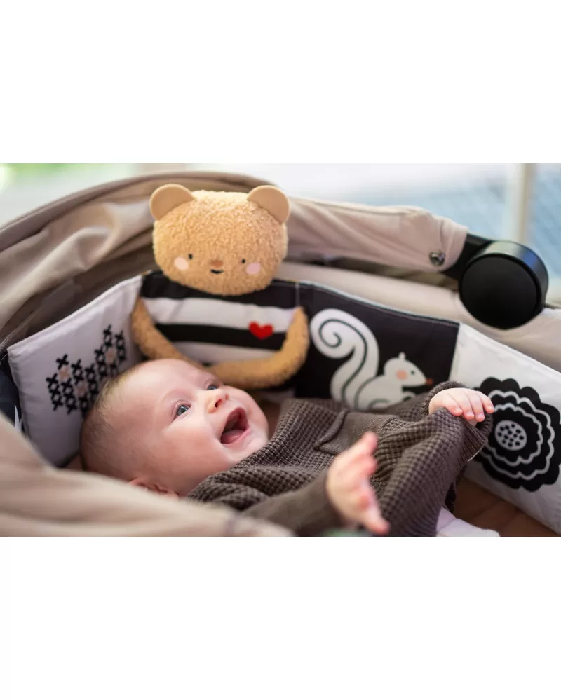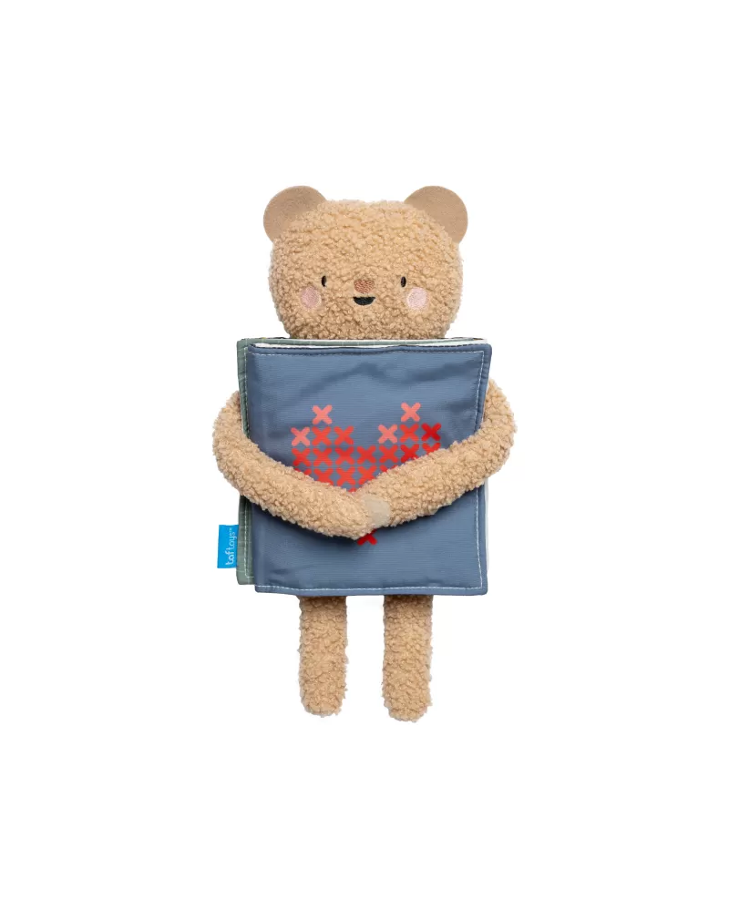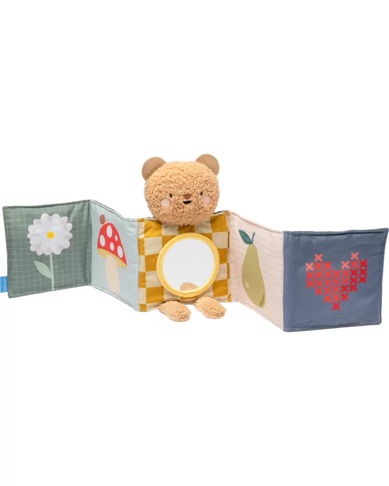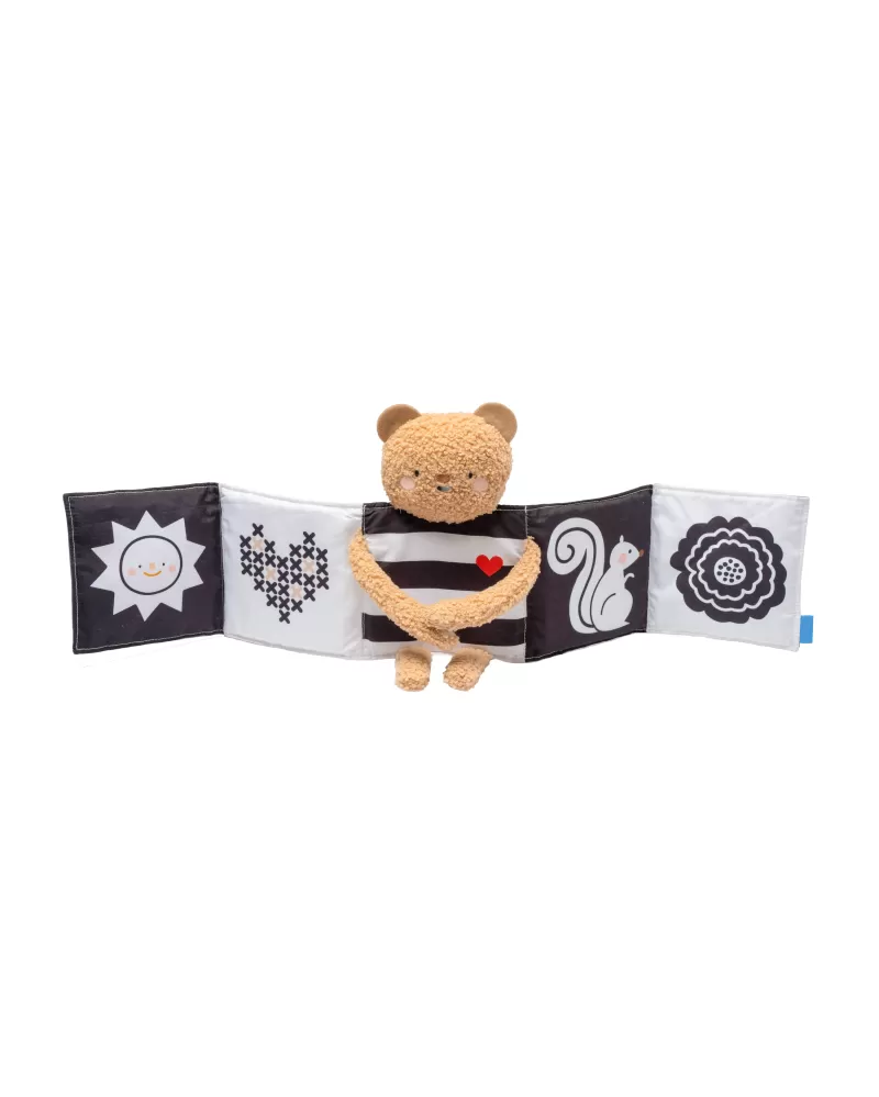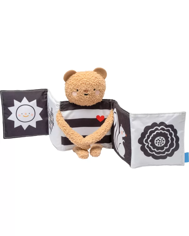 Plyšový medvídek s textilní knížkou miminko zabaví a zároveň pomáhá rozvíjet jeho jednotlivé smysly. Oboustranná knížka nabízí stranu pro novorozence s vysoce kontrastními černobílými ilustracemi a stranu s výraznými barevnými ilustracemi a aktivitami ke zkoumání pro starší miminko. Hračka podněcuje zvídavost, podporuje vývoj dítěte a zároveň nabízí příjemnou porci mazlení.