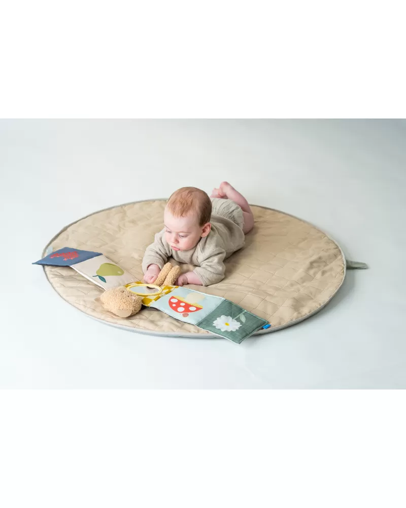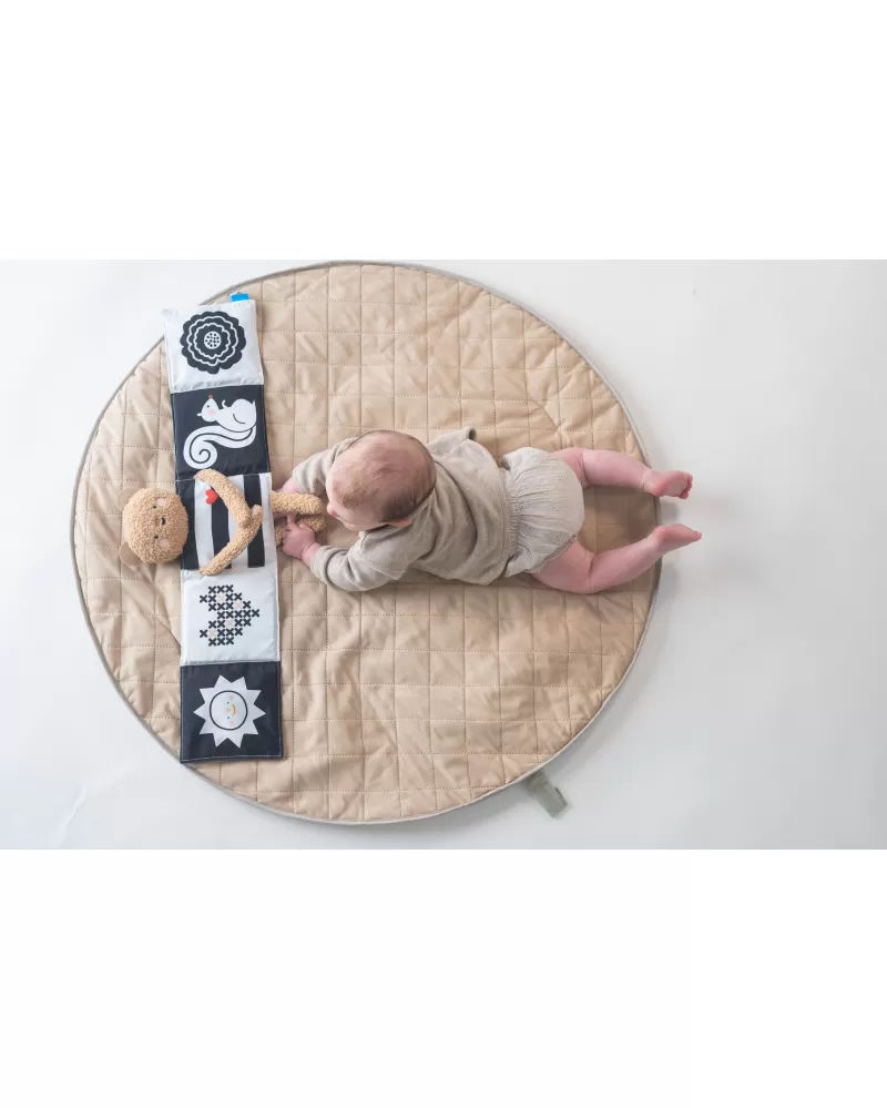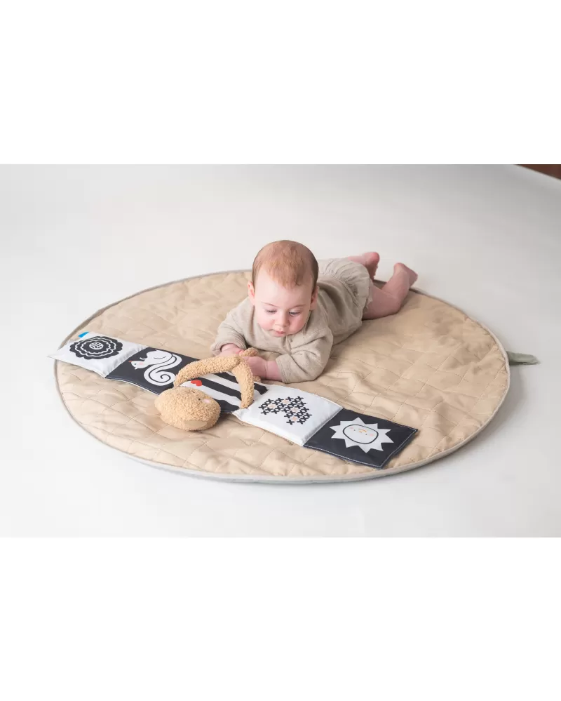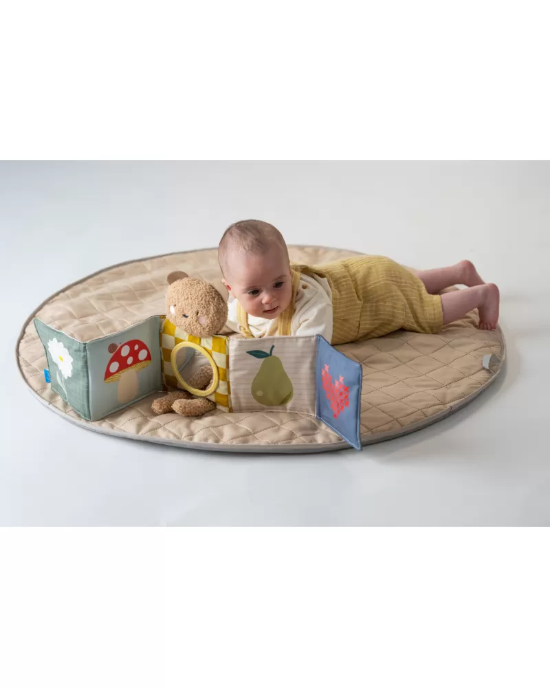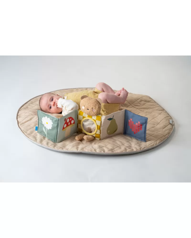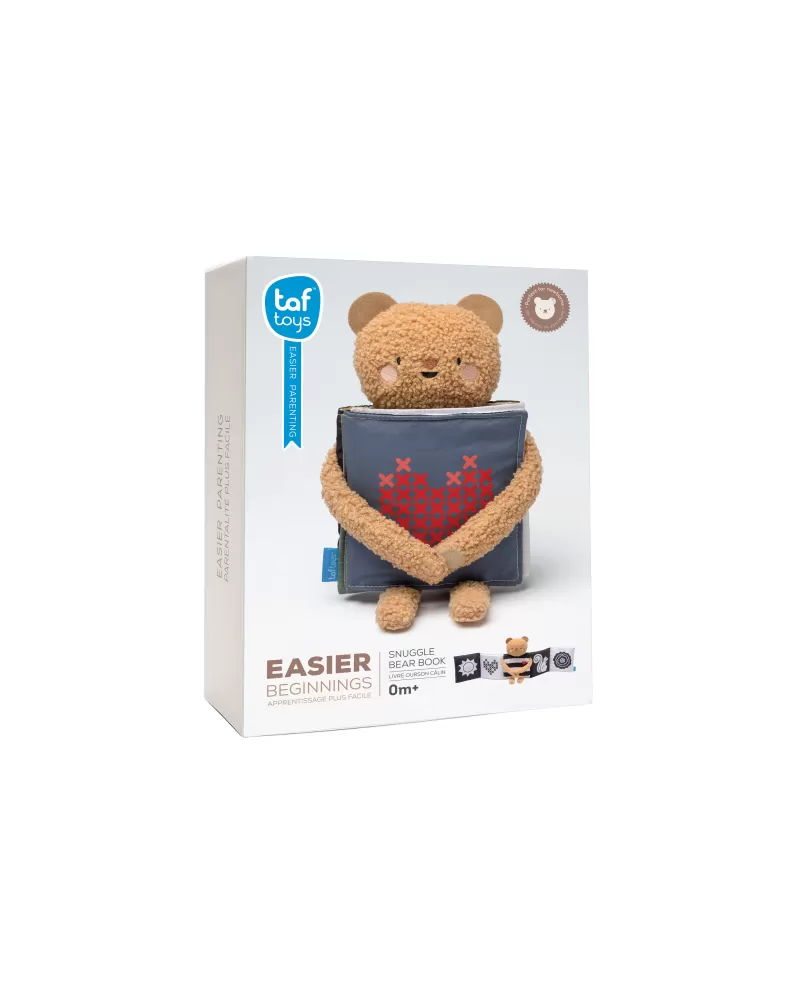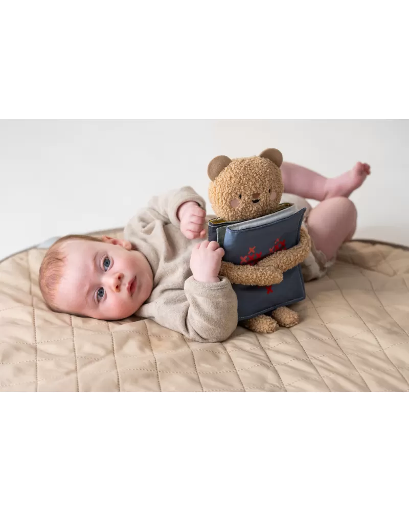 Plyšový medvídek s textilní knížkou miminko zabaví a zároveň pomáhá rozvíjet jeho jednotlivé smysly. Oboustranná knížka nabízí stranu pro novorozence s vysoce kontrastními černobílými ilustracemi a stranu s výraznými barevnými ilustracemi a aktivitami ke zkoumání pro starší miminko. Hračka podněcuje zvídavost, podporuje vývoj dítěte a zároveň nabízí příjemnou porci mazlení.