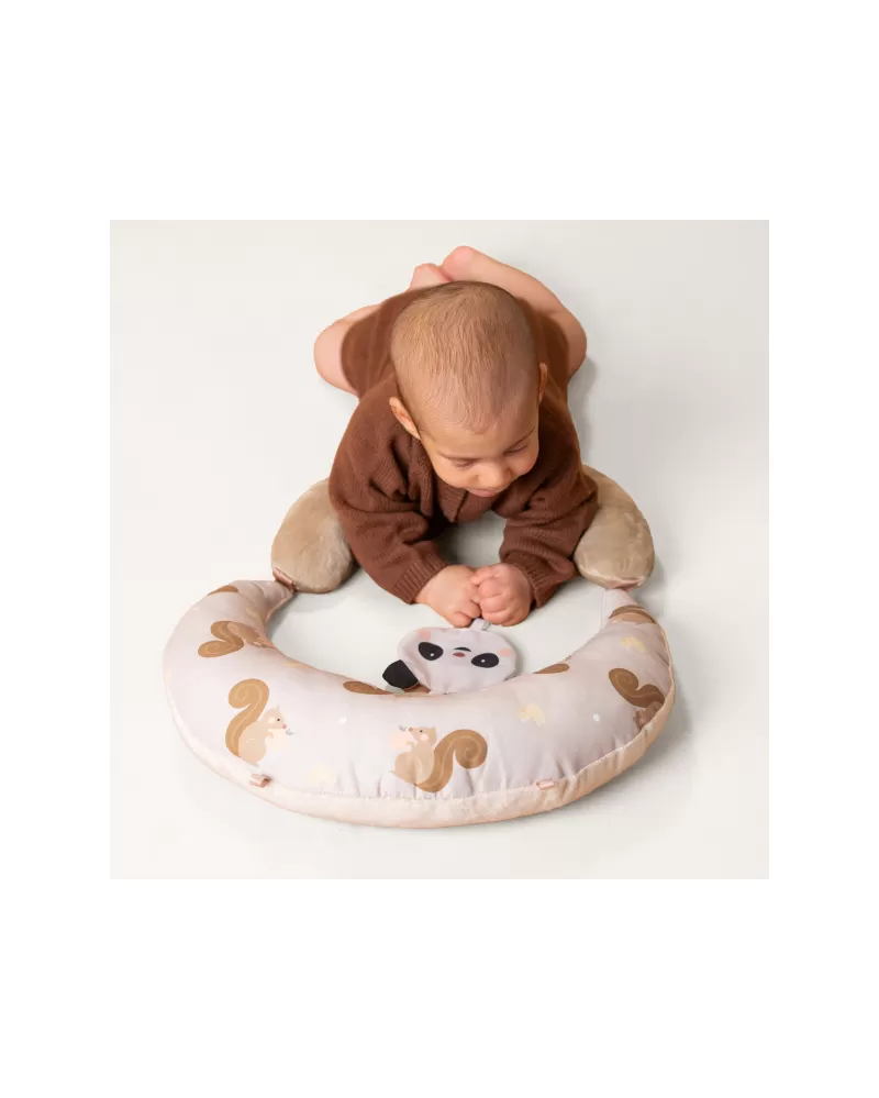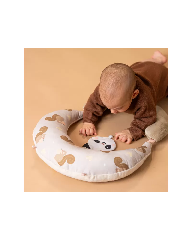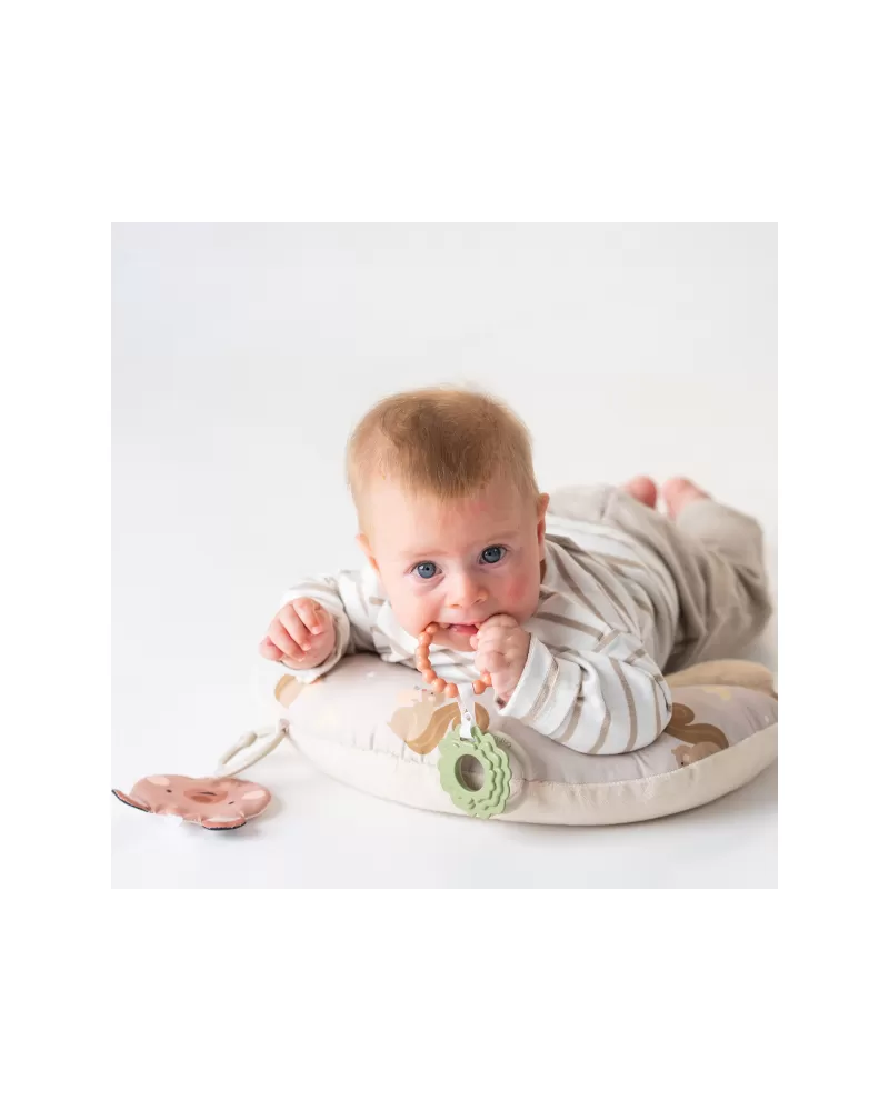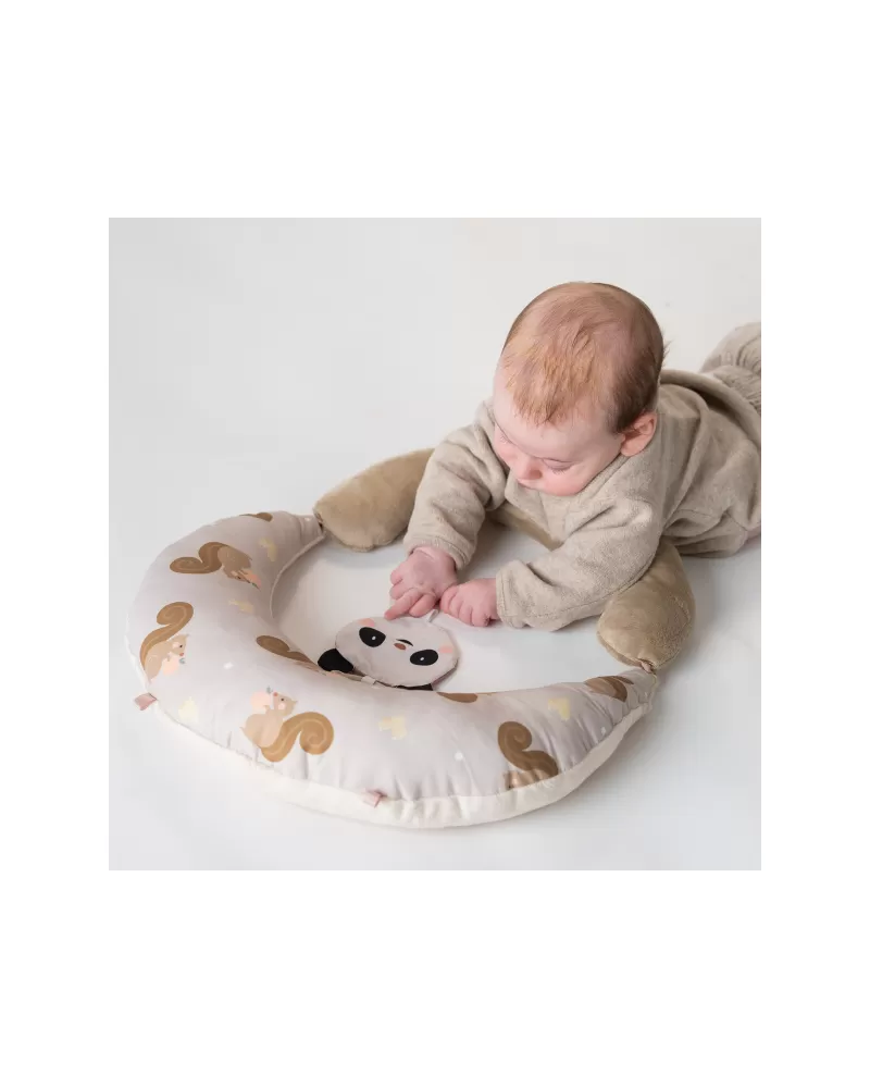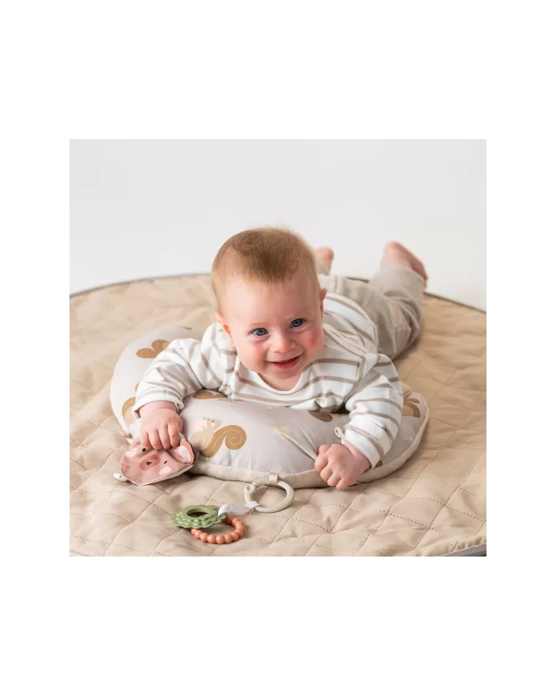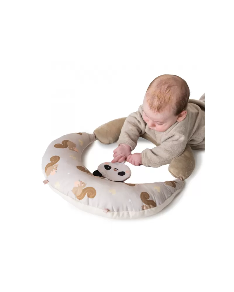 Polštářek z měkkého, příjemného materiálu je speciálně navržený, aby podporoval hraní dítěte na bříšku. Pro malého kojence, který tráví většinu dne i noci ležením na zádech, je důležité, aby trávil několikrát denně čas ležením na bříšku a takzvaným “pasením koníčků”. Poloha na bříšku přináší děťátku jiný pohled na svět a posiluje krční a zádové svaly, které později umožňují dítěti začít se přetáčet, lézt a sedět bez opory.