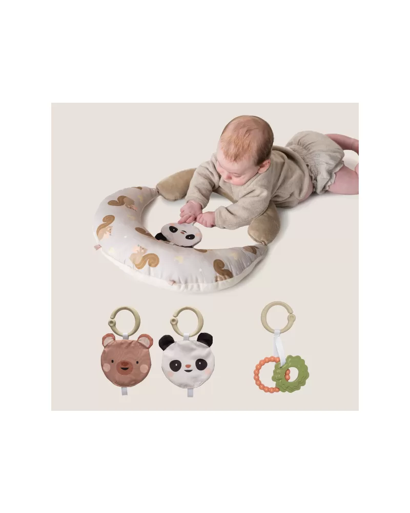 Balení obsahuje polštářek pro hru na bříšku, oboustrannou šusticí hračku a kousátko s kroužky.
