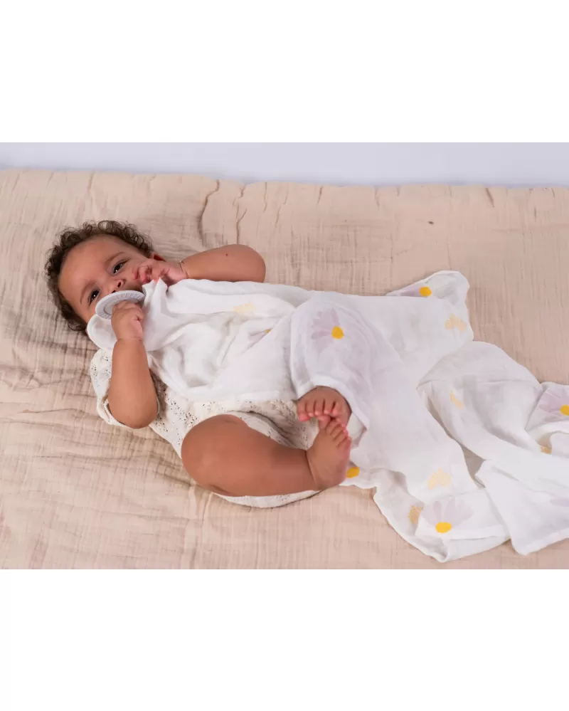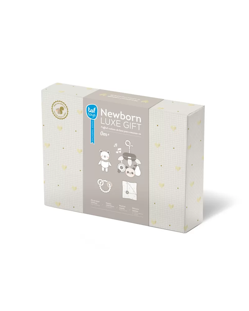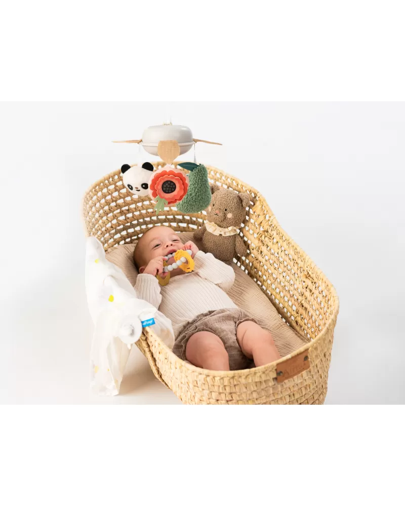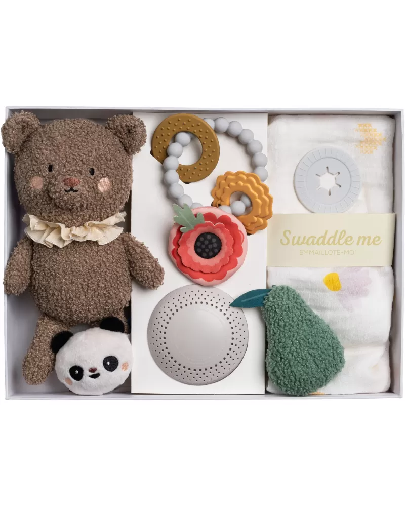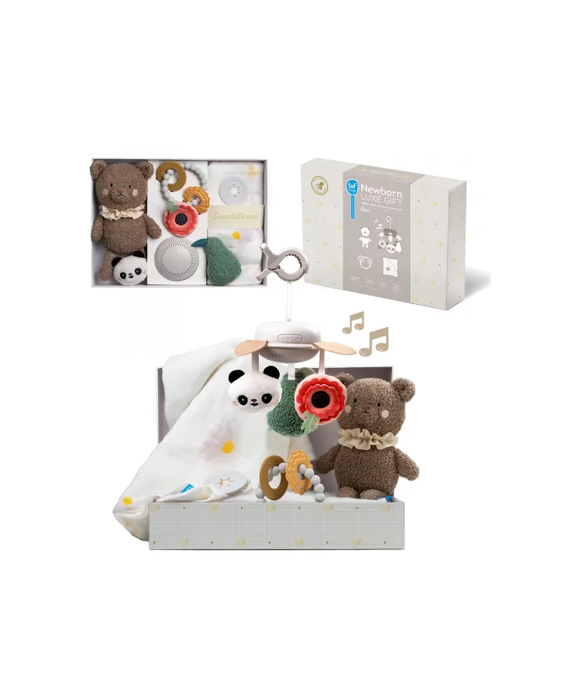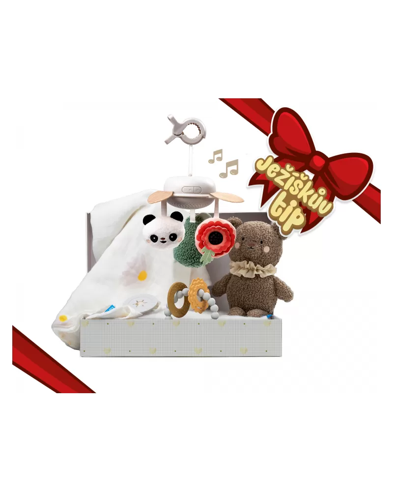 Luxusní dárkový box pro klidné usínání obsahuje hudební kolotoč s uklidňujícími melodiemi, měkkého plyšového medvídka, měkké silikonové kousátko a textilní plenu. Textilní plena s originálním silikonovým knoflíkem je využitelná pro zavinutí miminka i jako přehoz pro diskrétní kojení miminka.