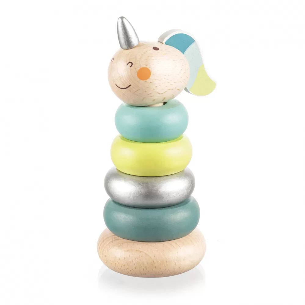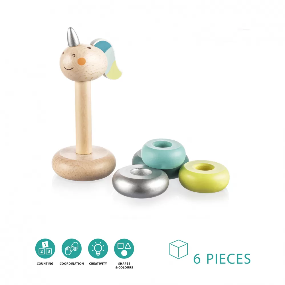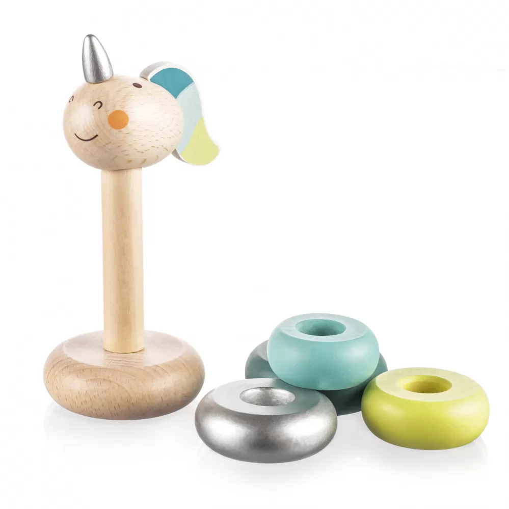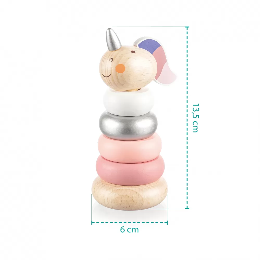 Dřevěné nasazovací kroužky ve tvaru jednorožce pro děti od 16 měsíců.