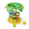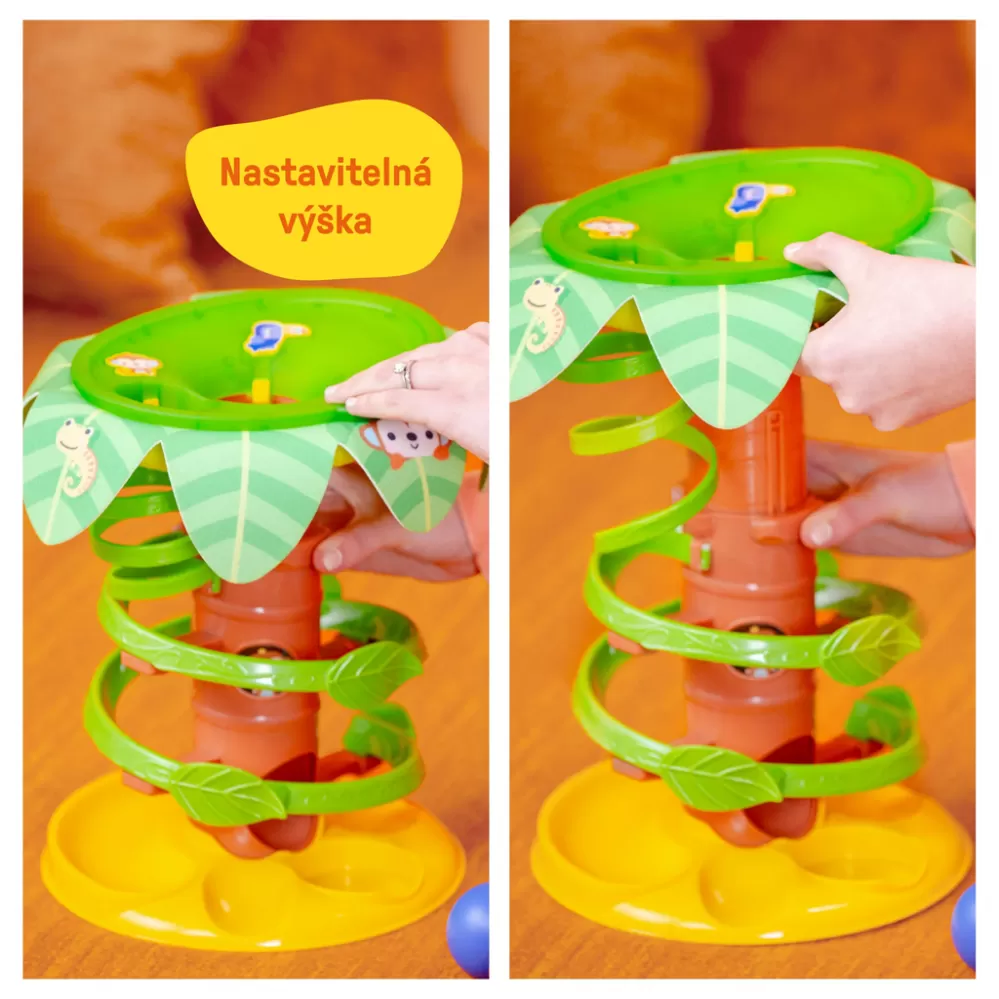 Vaše miminko nebo batole bude mít velkou radost, když bude házet, pleskat a honit 5 přiložených míčků. Existují 4 způsoby, jak si hrát: házet míčky přes střední dírku do koruny stromu a sledovat, jak se vynořují z kmene; pošlete je dolů spirálovitou révou; stiskněte tlačítka opice a tukan pro světélka a hudbu; nebo se plazte a nahánějte míčky. Zaveďte učení se příčin a následků s více než 50 melodiemi, zvuky a světly, které se aktivují při pouštění míčků nebo mačkání tlačítek. Míčky bezpečně přistávají na přiložené základně, která funguje buď jako držák na míčky, nebo jako uvolňovač míče. Tato palma, navržená pro děti ve věku 6 měsíců a starší, je výškově nastavitelná a podporuje jemnou a hrubou motoriku, když se děťátko pohybuje a roste. Doplněné melodiemi s tématikou džungle, světýlky, tropickými zvířátky „schovávajícími se“ na stromě a obepínající spirálou, bude děťátko režisérem velkého dobrodružství.
