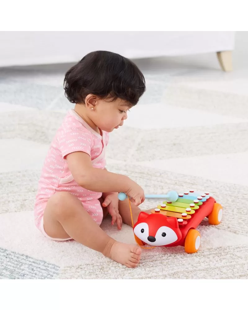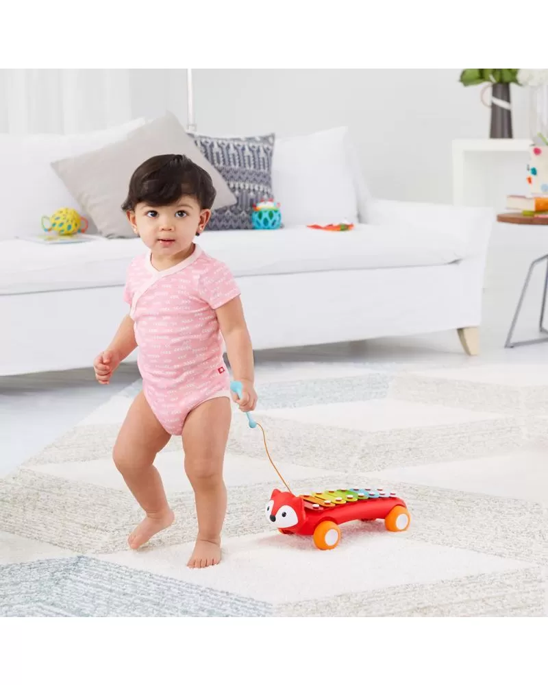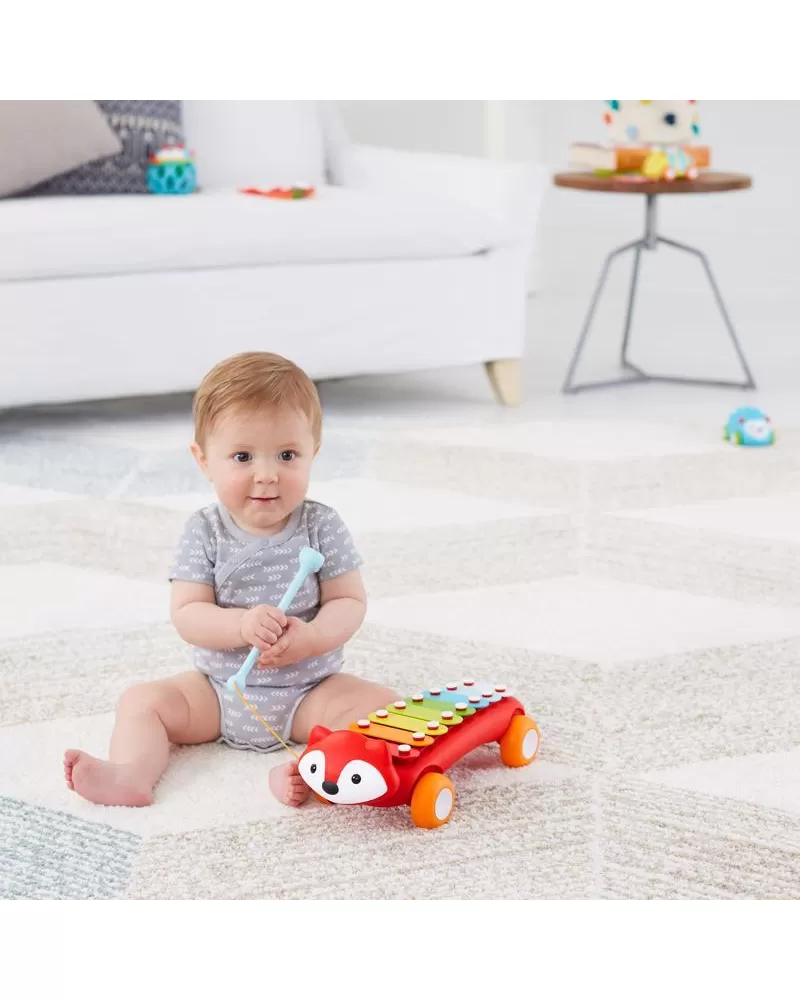 Krásná hračka obsahuje 8 notiček a paličku, kterou lze upevnit na bříšku lišáčka. Díky provázku a 4 kolečkům lze hračkupřeměnit z hudební na tahací a užít si tak ještě více zábavy. Pomáhá k rozvoji motorických vlastností dítěte.
