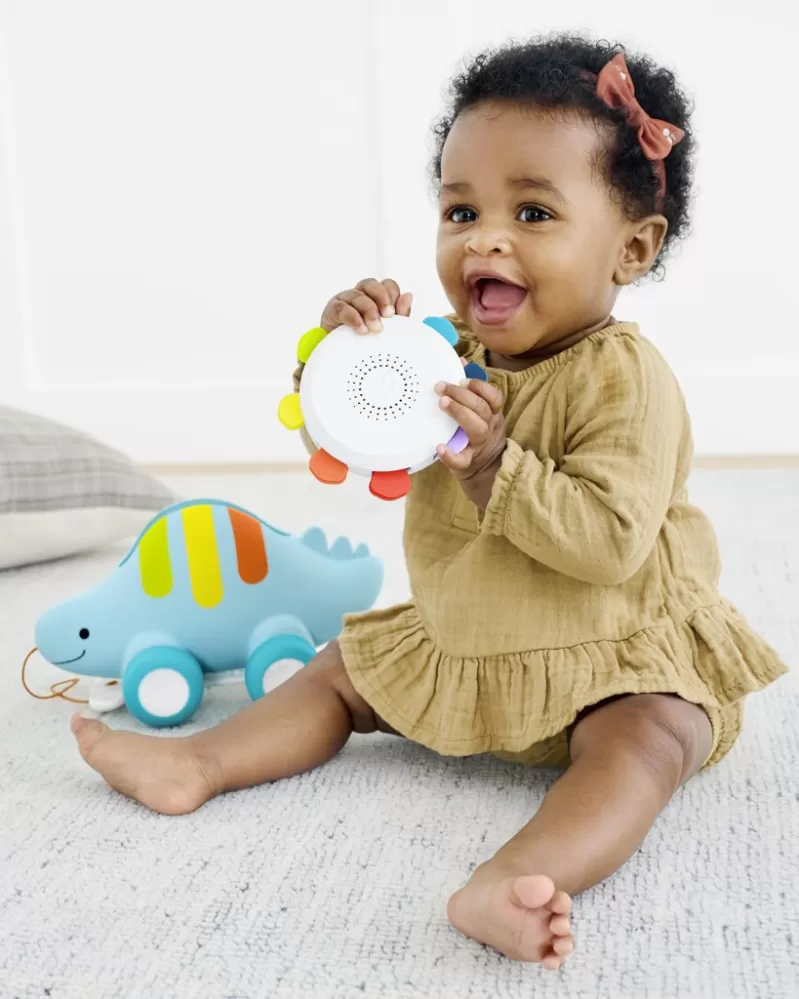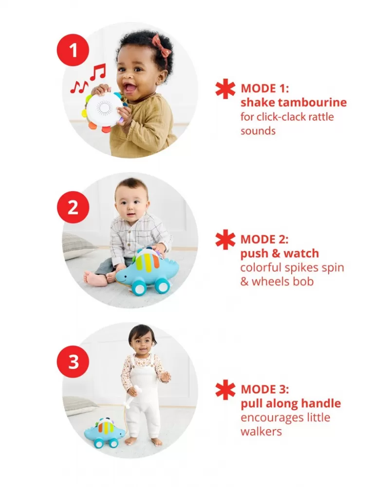 Náš rozkošný třesoucí se stegosaurus díky třem režimům hry – tamburína, tlačící hračka a tahací hračka roste spolu s dítětem, od sedícího až po chodící. Odnímatelná tamburína se malým ručičkám snadno sama třese. Nebo položte tamburínu na záda dinosaura, zatlačte na ni a sledujte, jak se hroty otáčejí, zatímco se kola otáčejí nahoru a dolů. V režimu připojená „kostová“ rukojeť povzbuzuje malé chodce, aby s sebou vzali svého zábavného dino kamaráda na procházku.