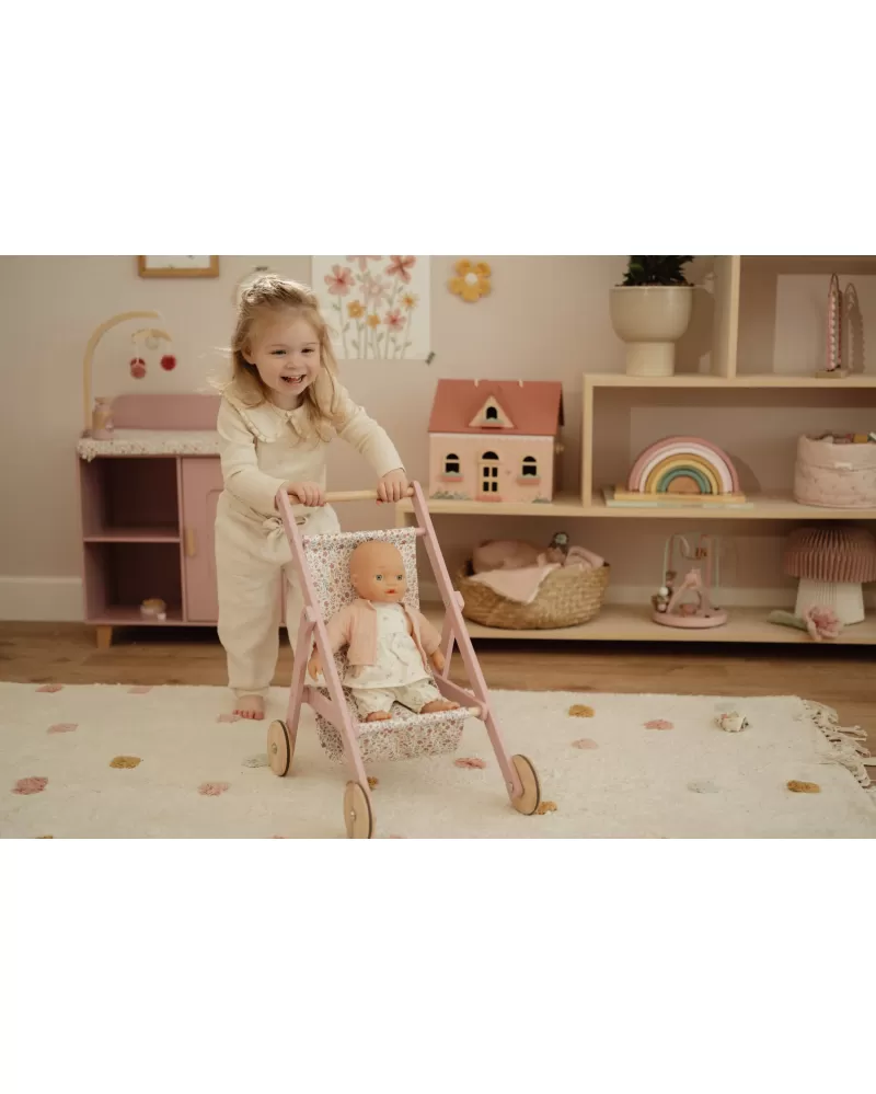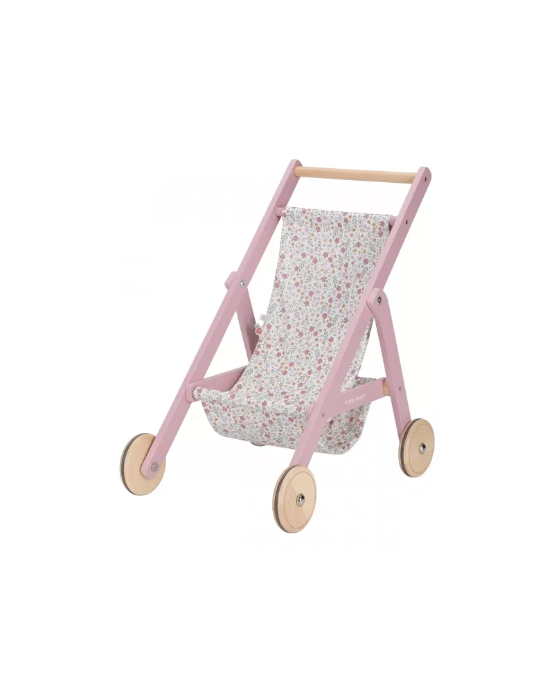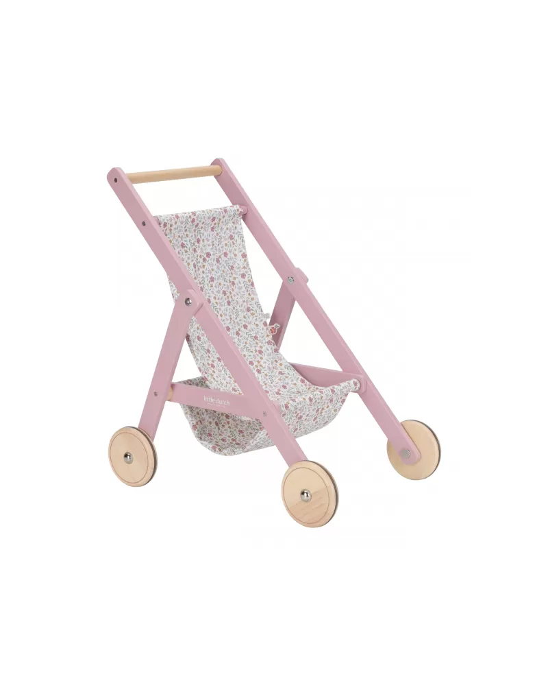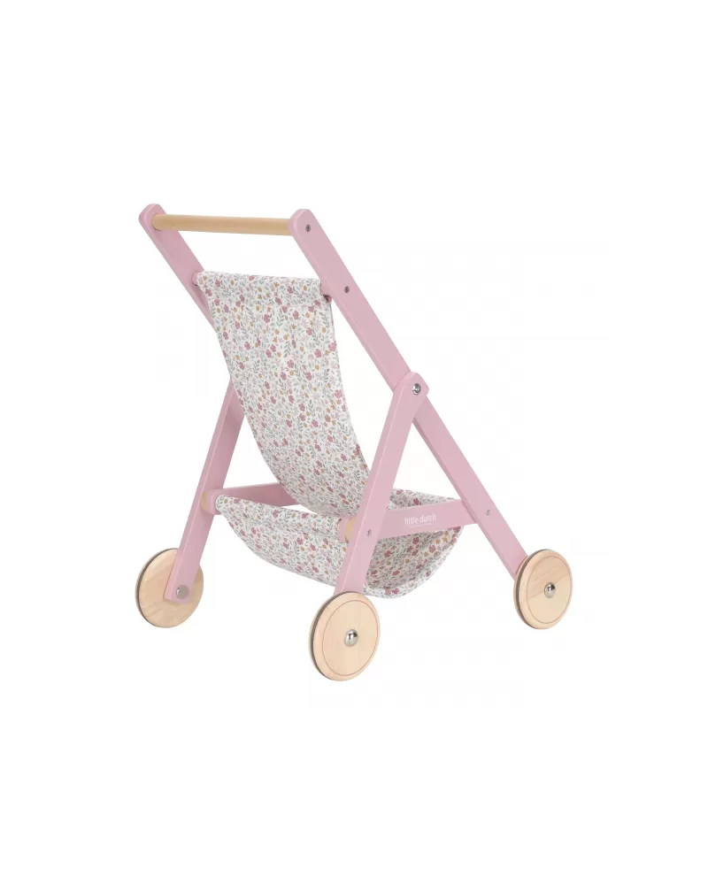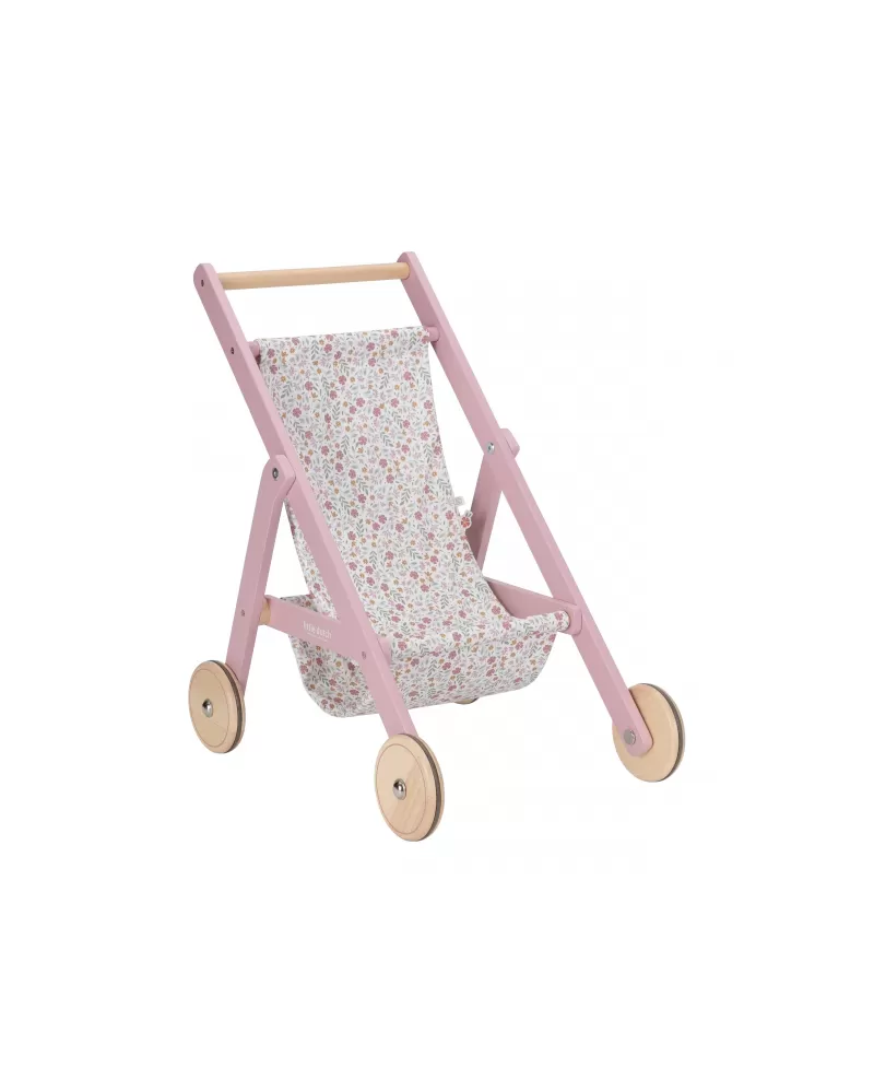 Tento dřevěný kočárek pro panenky je ideálním společníkem na všechny procházky s panenkou či plyšákem. Robustní konstrukce a tichá kolečka s gumovým potahem zajišťují plynulou jízdu bez poškození podlahy. Sedátko je potaženo látkou v romantickém květinovém designu, který dodává kočárku půvabný vzhled.