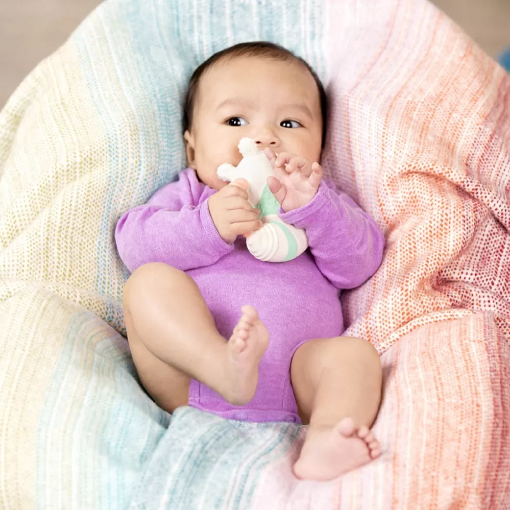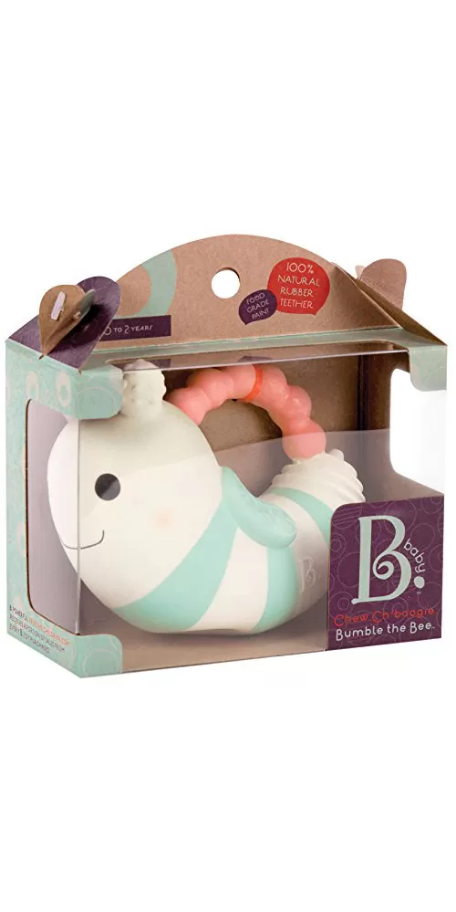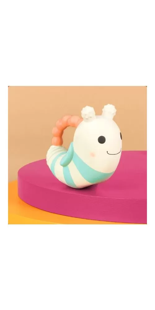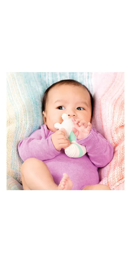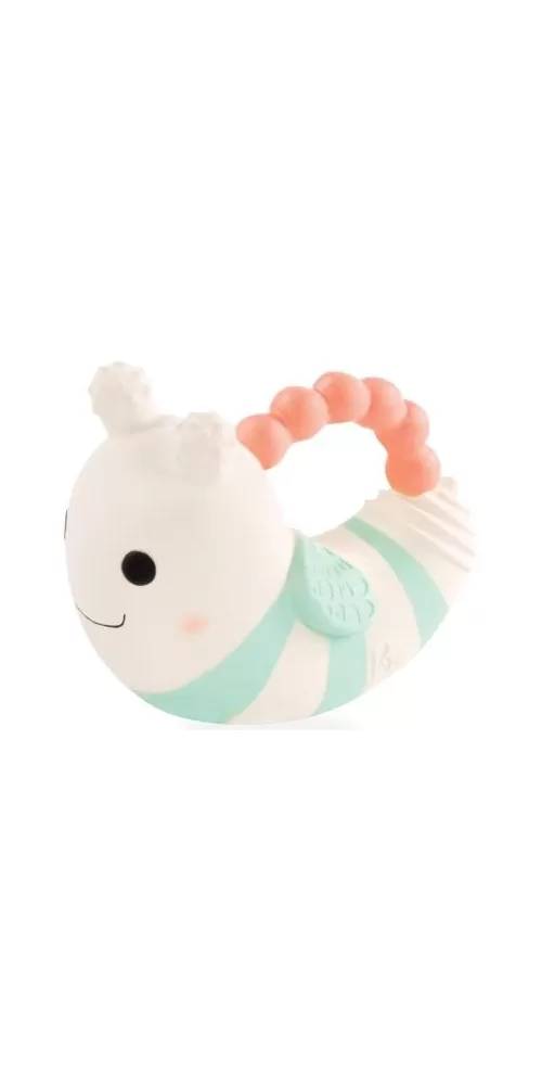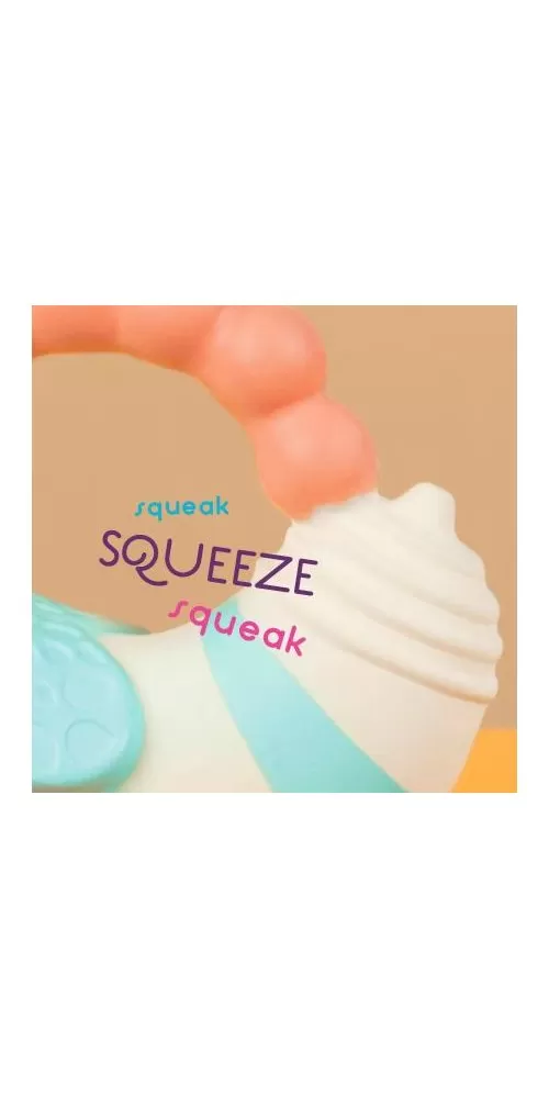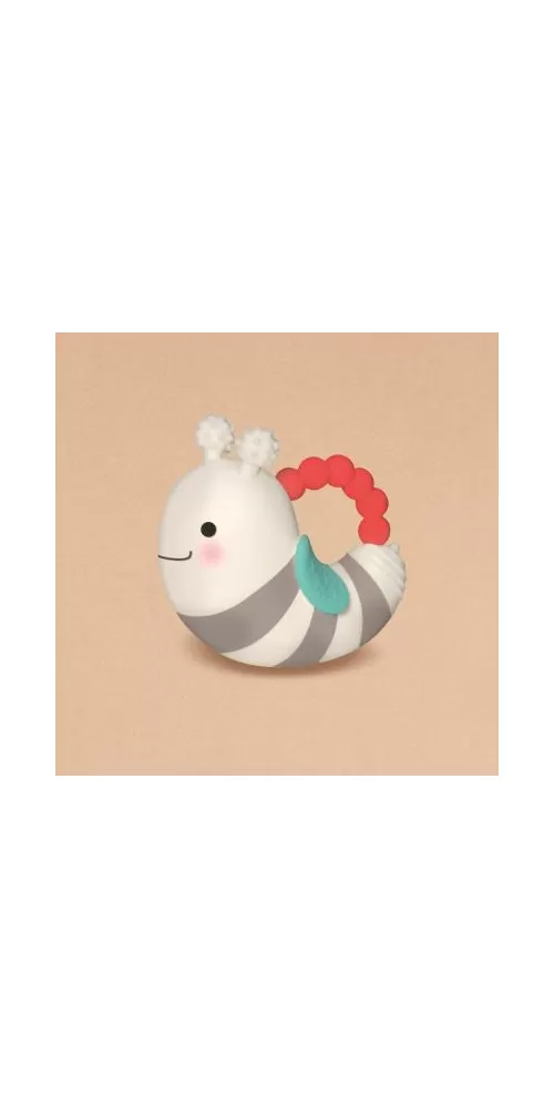 Měkká hračka z přírodního kaučuku s matným povrchem má tvar pro snadné uchopení. Různorodé textury lákají dítě ke zkoumání v ústech a hračka tak pomáhá při prořezávání prvních zoubků. Po zmáčknutí hračka jemně píská.