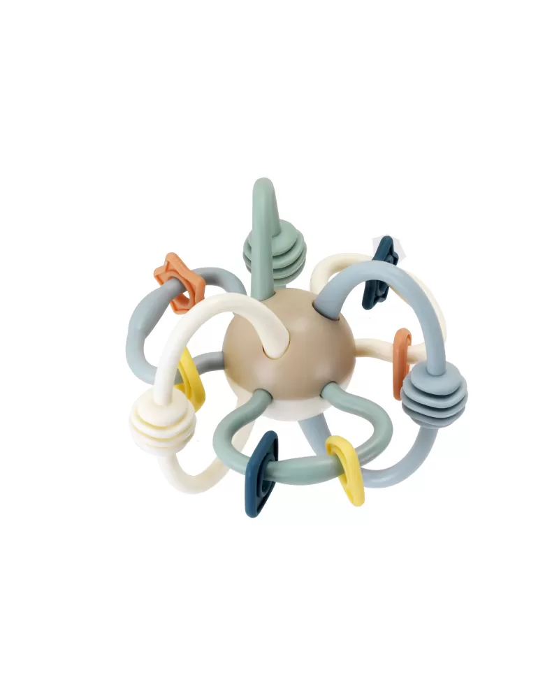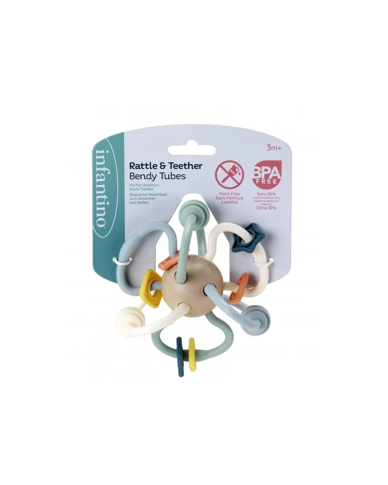 Chrastítko s kousátky Infantino láká miminko k objevování tvarů a textur. Hračka nabízí posuvné korálky a pružné smyčky, při pohybu jemně chrastí a funguje i jako kousátko, které pomáhá při prořezávání prvních zoubků dítěte. Tvar chrastítka je navržen pro snadné uchopení malými dětskými ručičkami.
