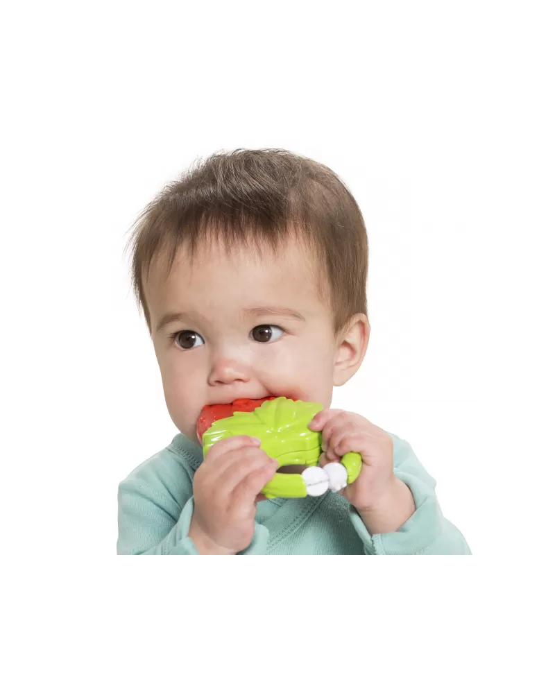 Kousátko s různorodými texturami pro zkoumání v ústech při zmáčknutí jemně vibruje a masíruje tak dítěti citlivé dásně při prořezávání prvních zoubků. Pohyblivá beruška na držadle kousátka nabízí další texturu pro zkoumání rukama i ústy.