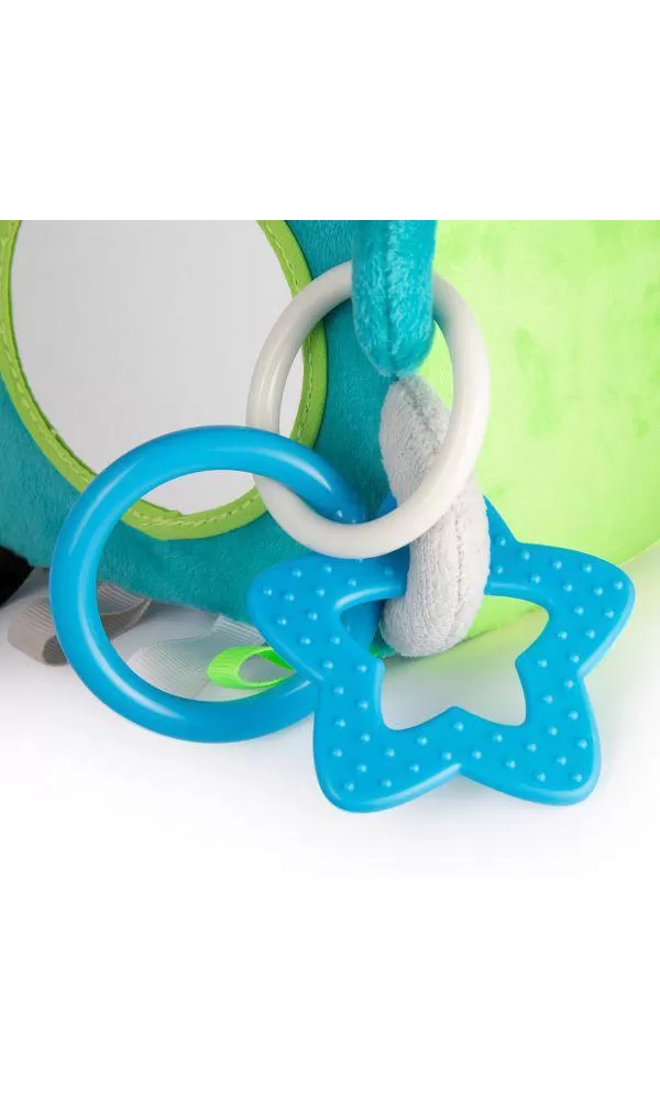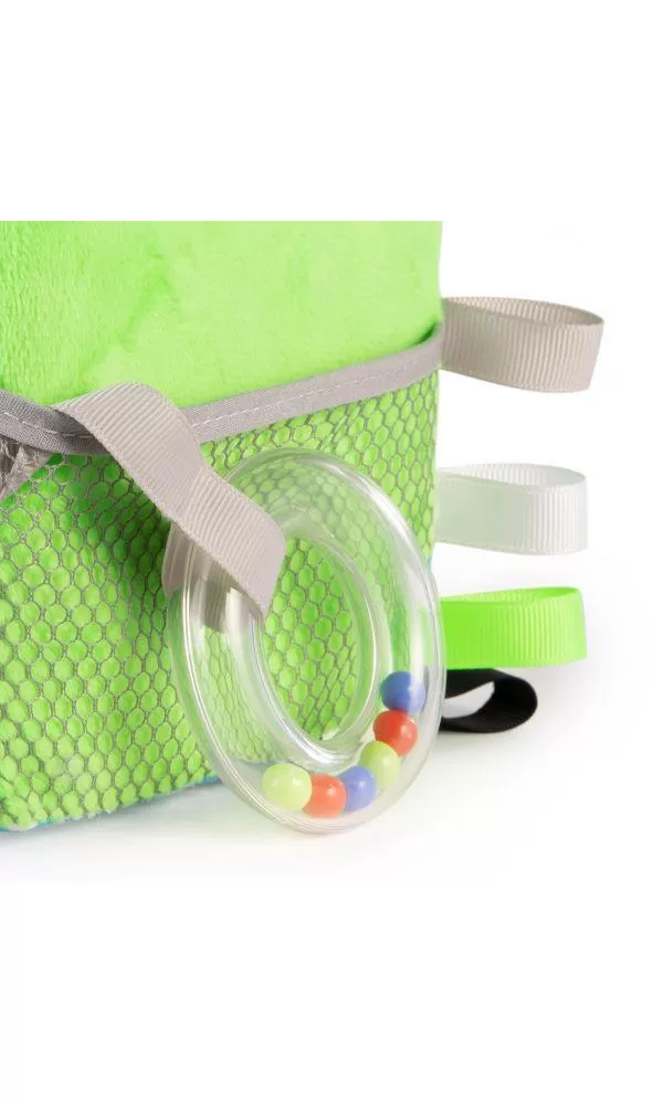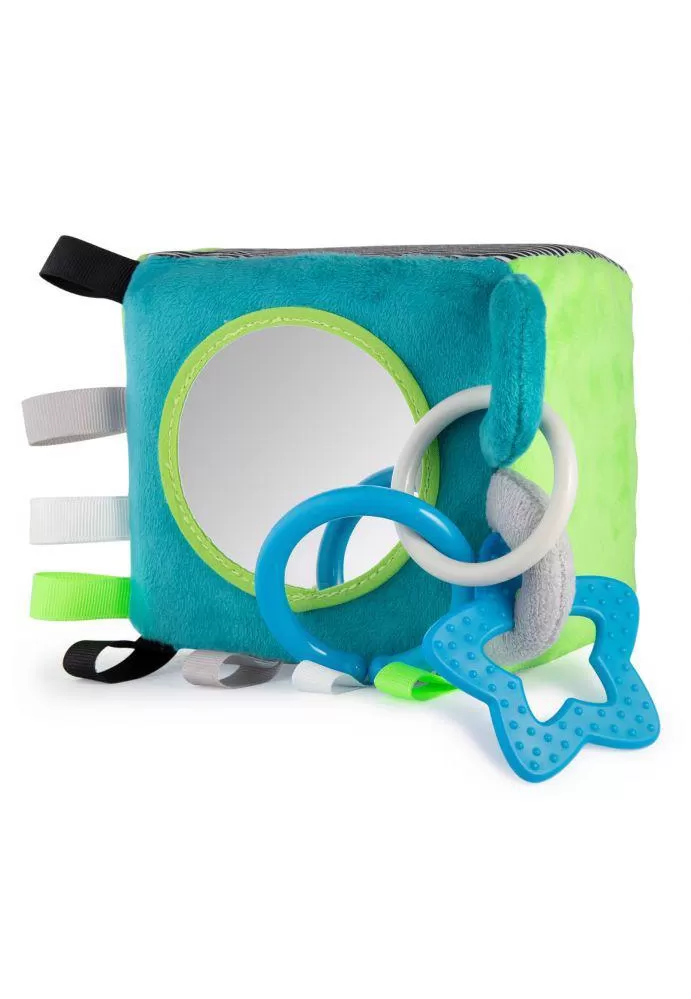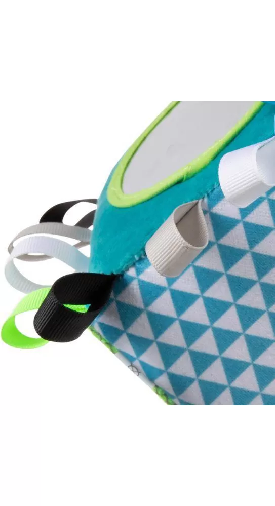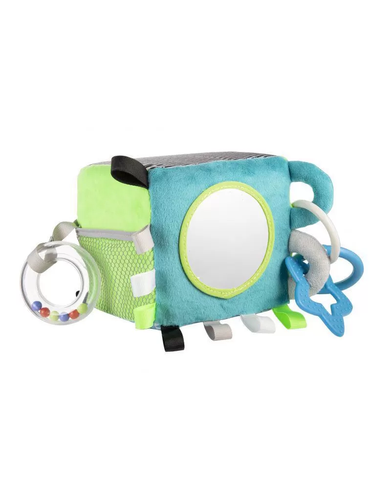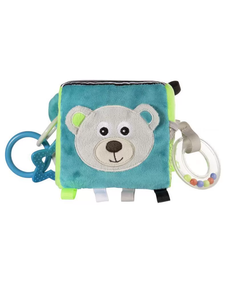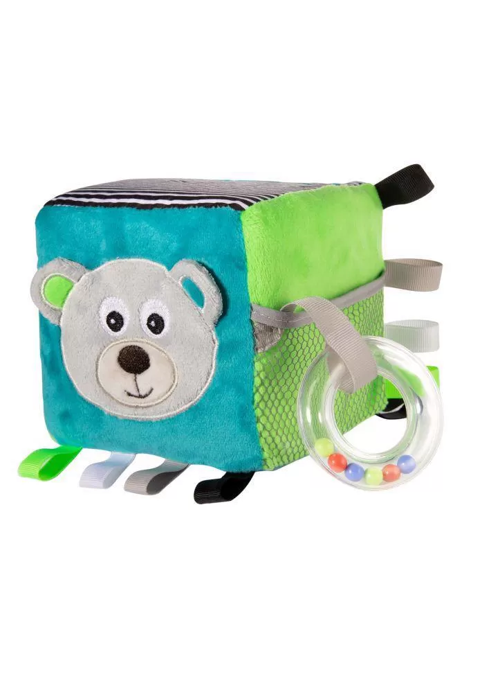 Plyšová senzorická kostka z kolekce MEDVÍDCI je vhodná pro děti již od 0 měsíců. Hračka je vyrobena z různých textur materiálů, které stimulují hmat dítěte. Zvonící a šustící prvky skvěle budí pozornost. Kostka **disponuje různě barevnými stuhami**, které povzbuzují dítě hračku uchopit. Z jedné strany je hračka zdobena černo-bílými proužky, ty jsou nejužitečnějšími pomocníky pro rozpoznávání barev u těch nejmenších dětí. **Součástí hračky je také elastické kousátko** sloužící jako zklidňující pomůcka při svědění dásní.