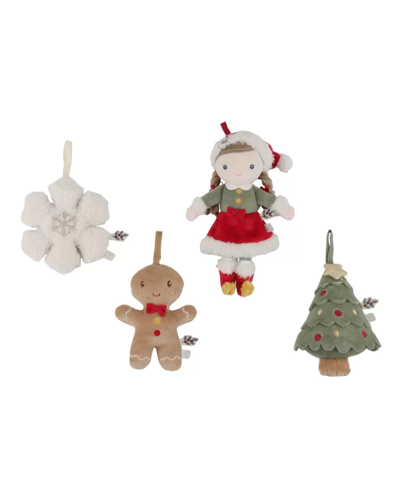 Roztomilá sada čtyř plyšových ozdob Little Dutch vnese do vašeho domova hřejivou atmosféru Vánoc. V dárkovém balení najdete panenku Rosu ve vánočním oblečení, usměvavého perníčka, vánoční stromeček a sněhovou vločku. Díky měkkému a lehkému materiálu jsou ozdoby bezpečné pro malé děti a snadno se věší na vánoční stromek, větvičku nebo girlandu. Společné zdobení stromku se tak stane kouzelným rodinným okamžikem, který si budete užívat rok co rok.