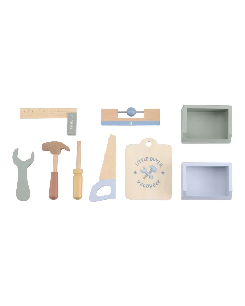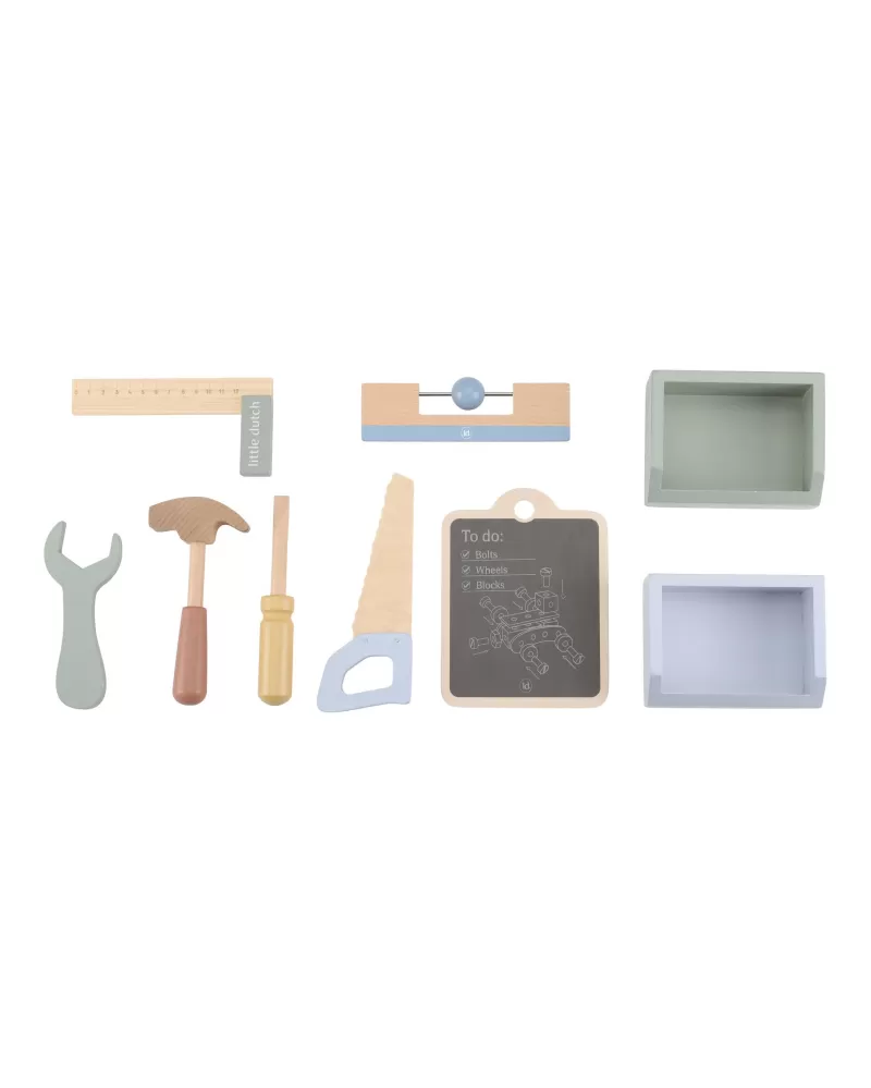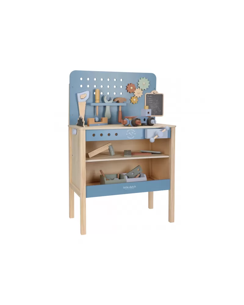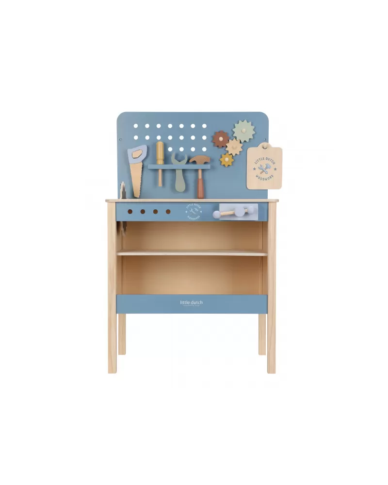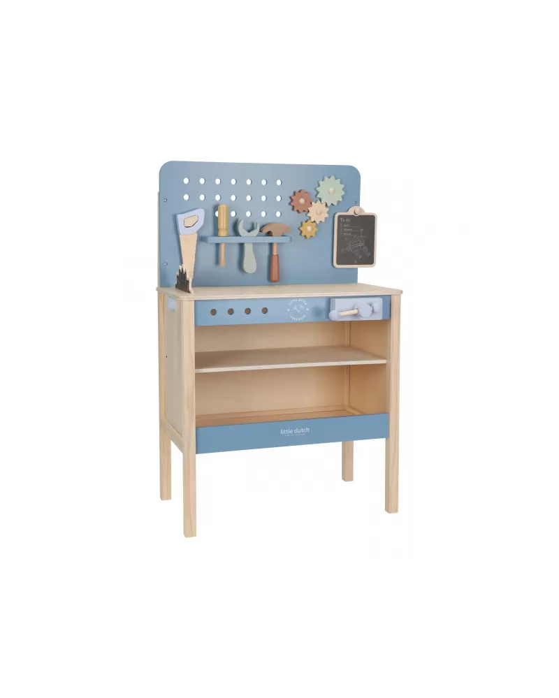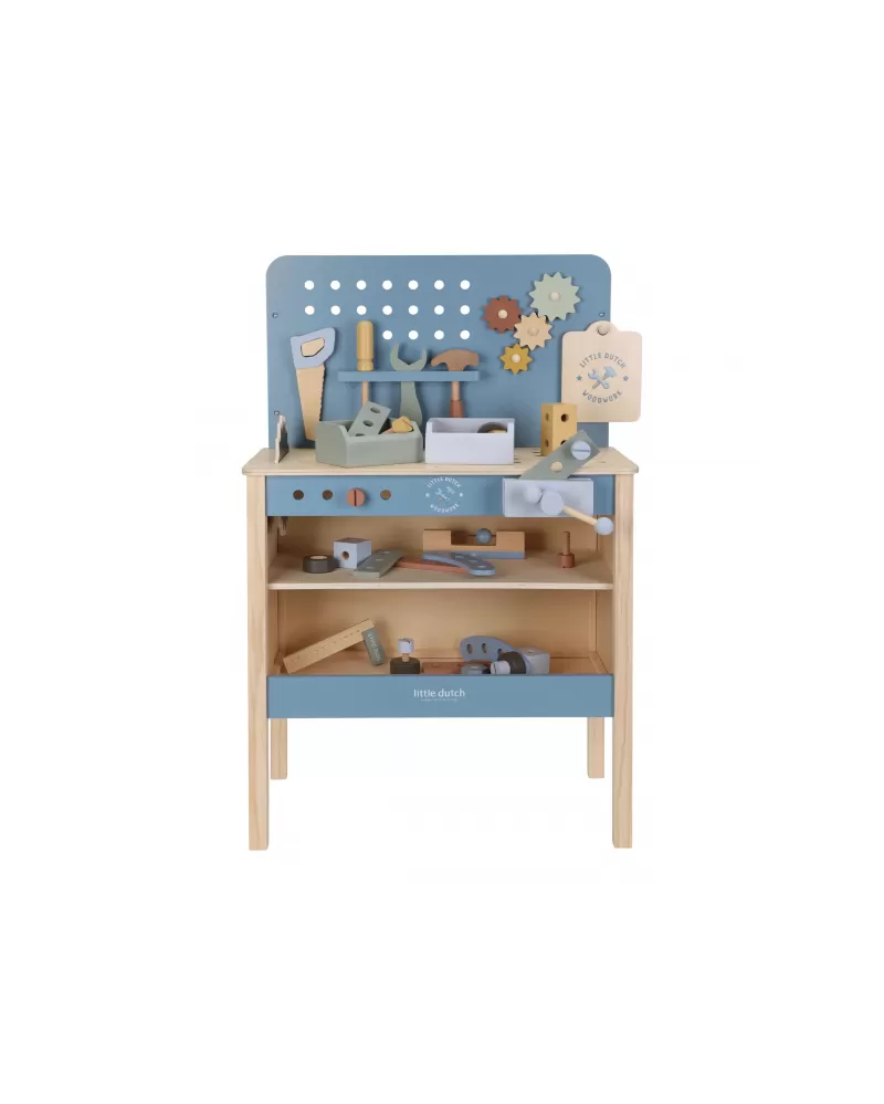Dětský ponk pro malé kutily v kvalitním dřevěném provedení s nářadím a dalším příslušenstvím. Děti si mohou z jednotlivých dílů sestavit třeba autíčko nebo opravit, cokoli je potřeba. Součástí bohatého příslušenství je dětské kladívko, klíč, šroubovák, pilka, vodováha, metr, matice a šrouby.