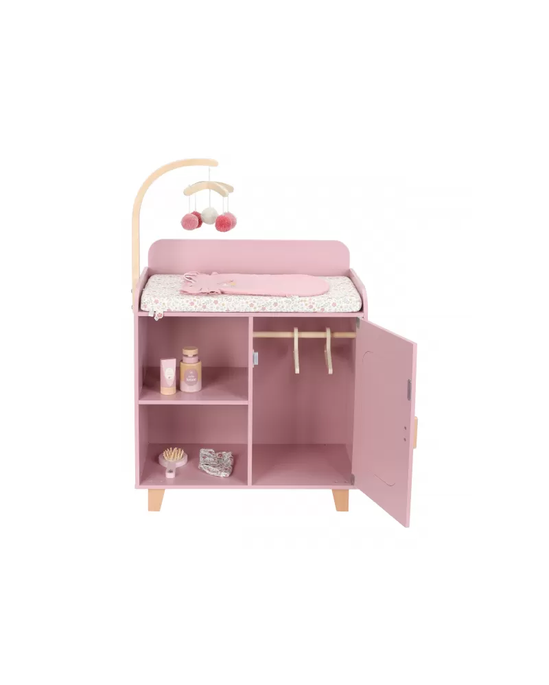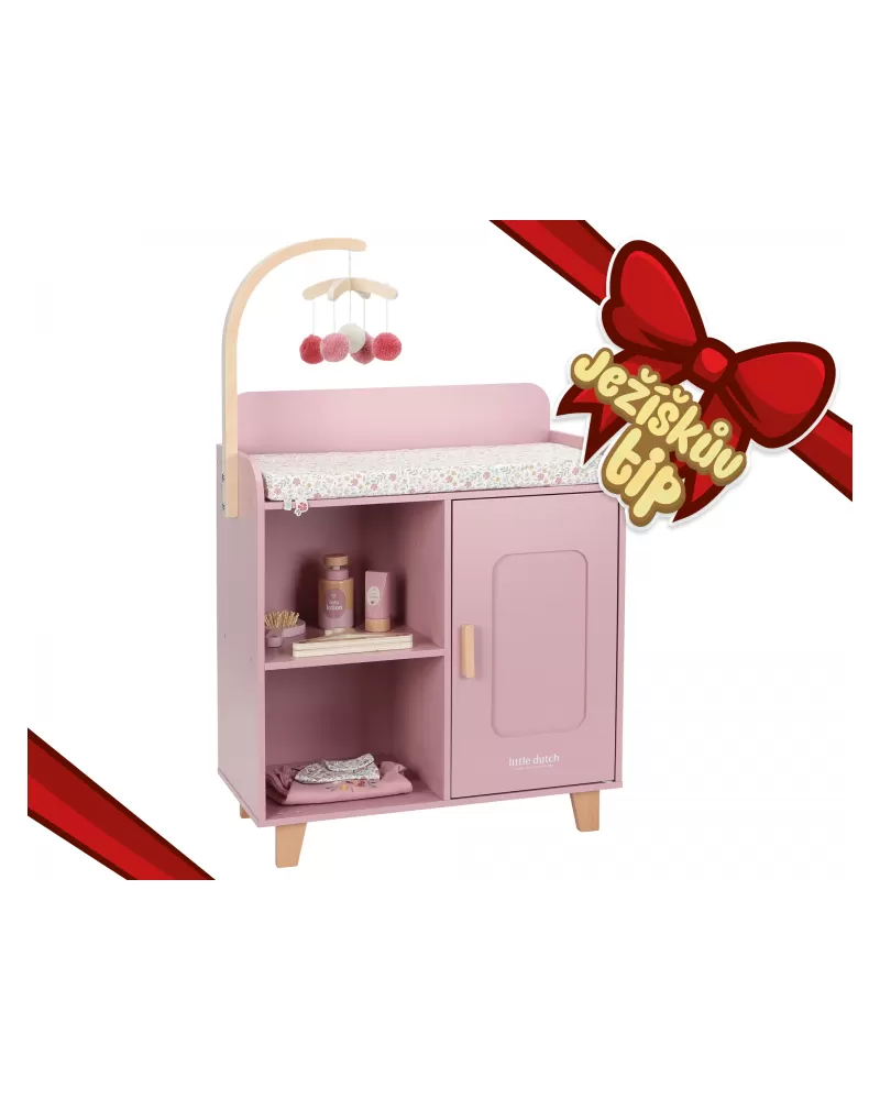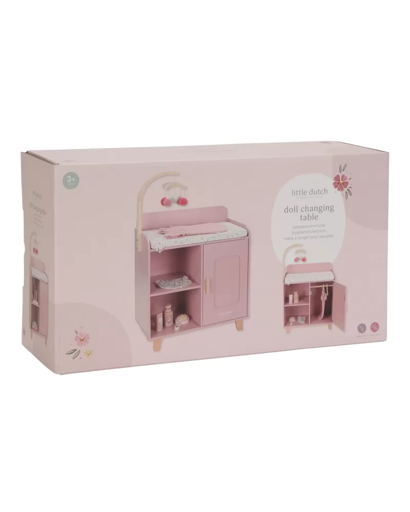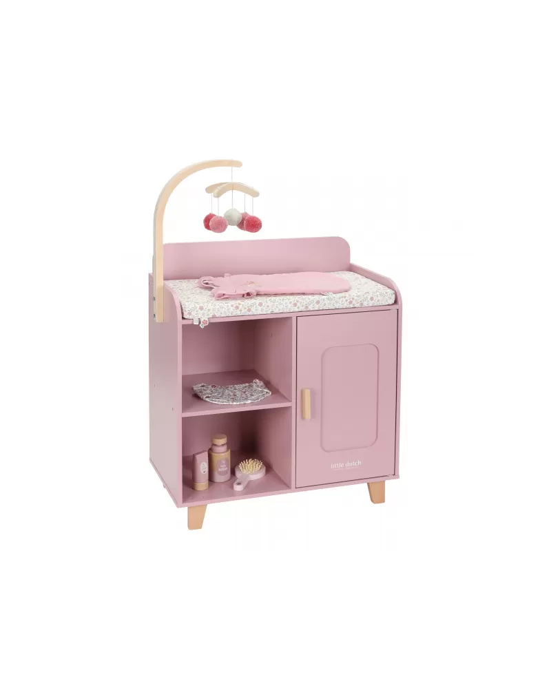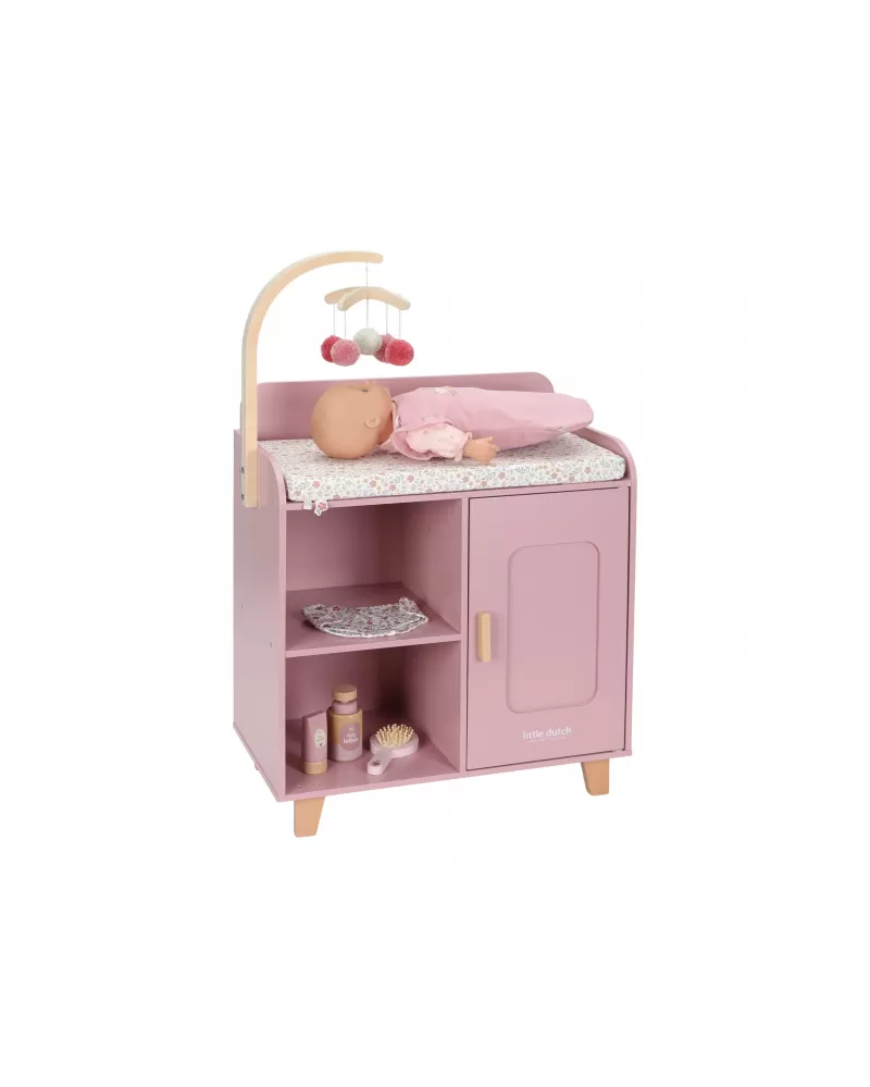 Elegantní přebalovací pult Little Dutch umožňuje dětem napodobovat každodenní péči o miminko a starat se o panenky stejně, jako se maminka či tatínek starají o své miminko. Součástí balení je měkká přebalovací podložka s romantickým květinovým potiskem, závěsný kolotoč, spací pytel, textilní plena, dvě ramínka a dřevěné doplňky pro péči o panenku. Praktická skříňka a poličky ve spodní části přebalovacího pultu umožňují mít vše potřebné pro péči o panenku vždy po ruce a uklizené.