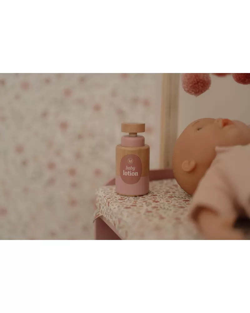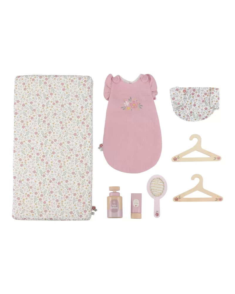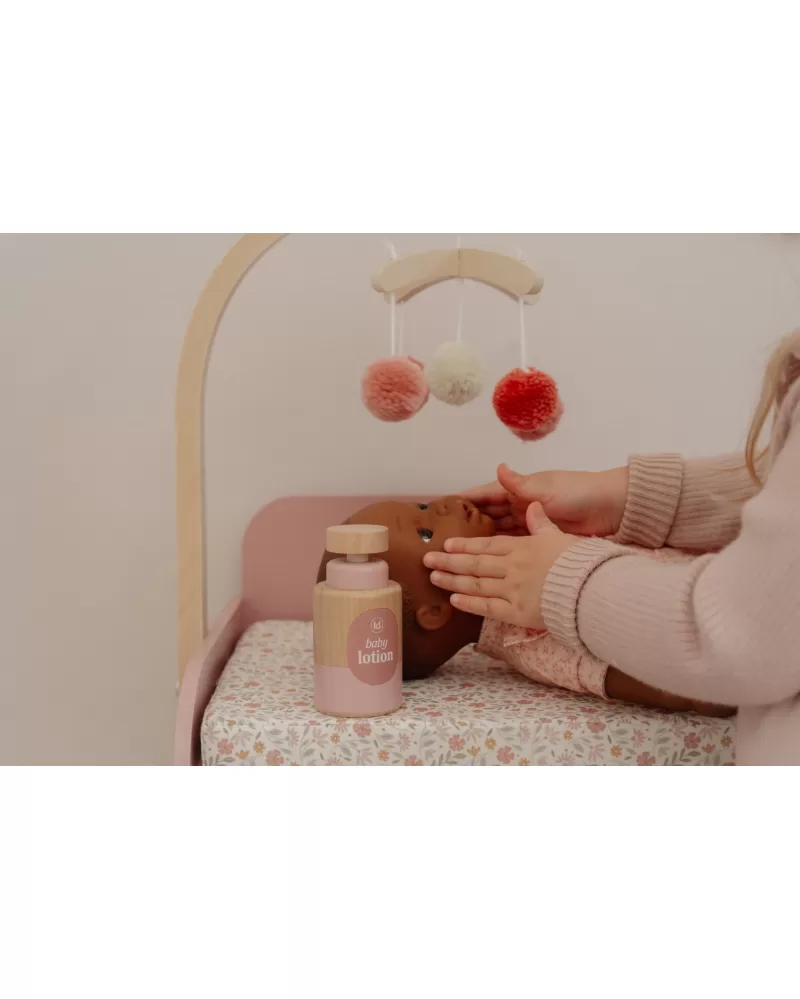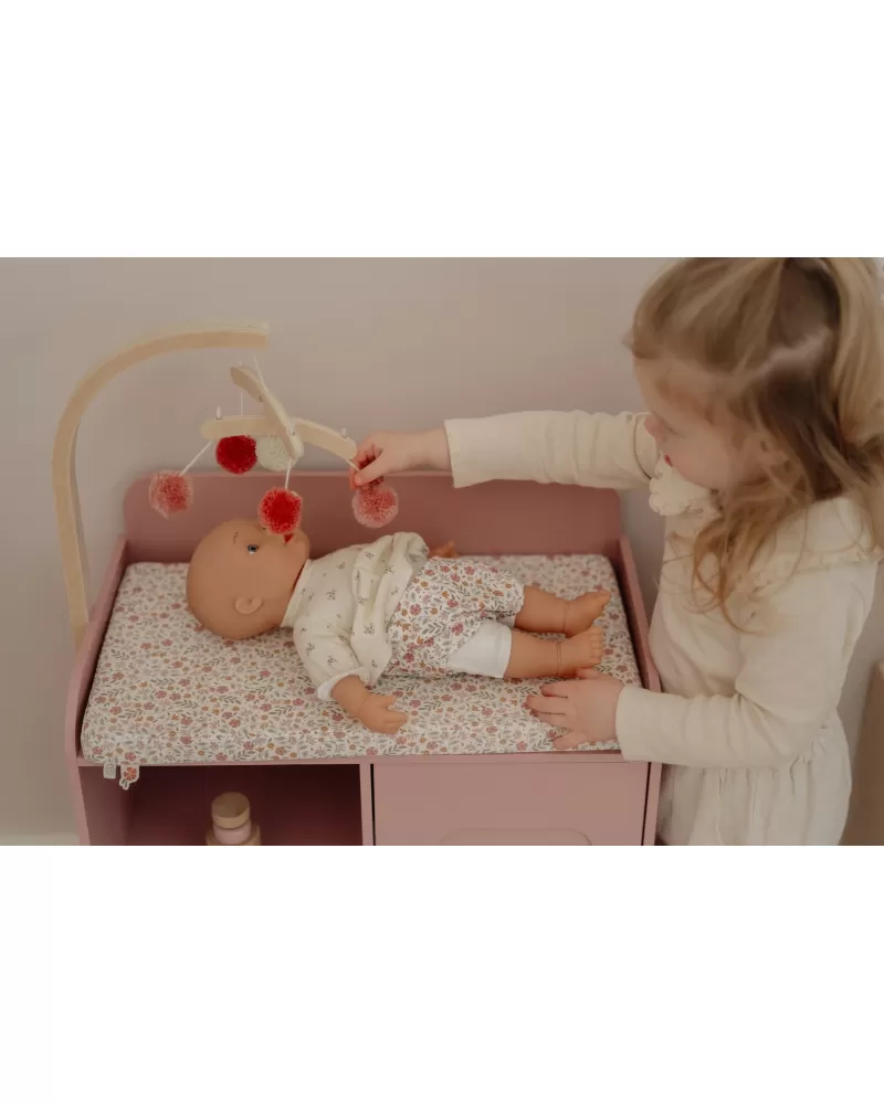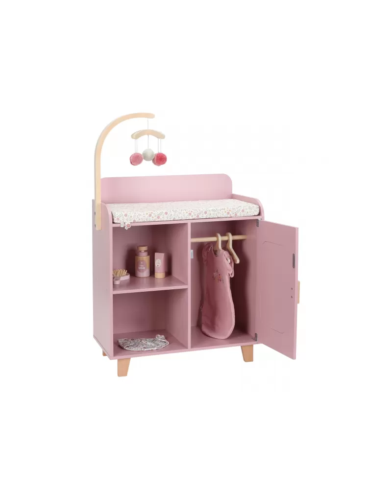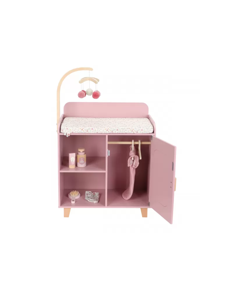 Elegantní přebalovací pult Little Dutch umožňuje dětem napodobovat každodenní péči o miminko a starat se o panenky stejně, jako se maminka či tatínek starají o své miminko. Součástí balení je měkká přebalovací podložka s romantickým květinovým potiskem, závěsný kolotoč, spací pytel, textilní plena, dvě ramínka a dřevěné doplňky pro péči o panenku. Praktická skříňka a poličky ve spodní části přebalovacího pultu umožňují mít vše potřebné pro péči o panenku vždy po ruce a uklizené.