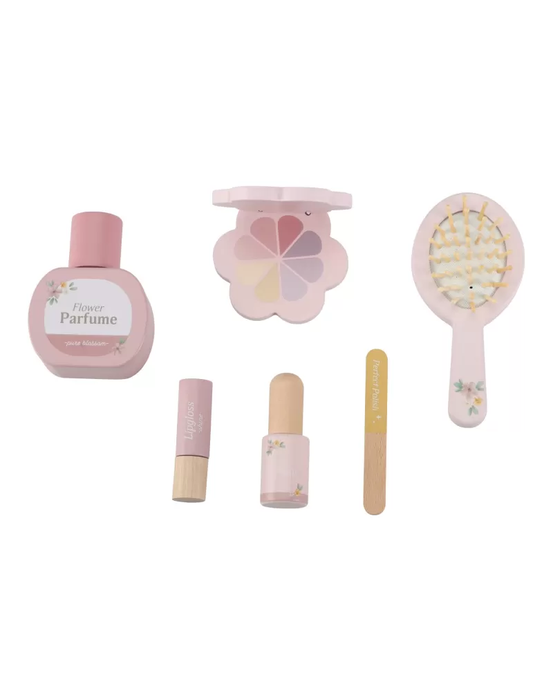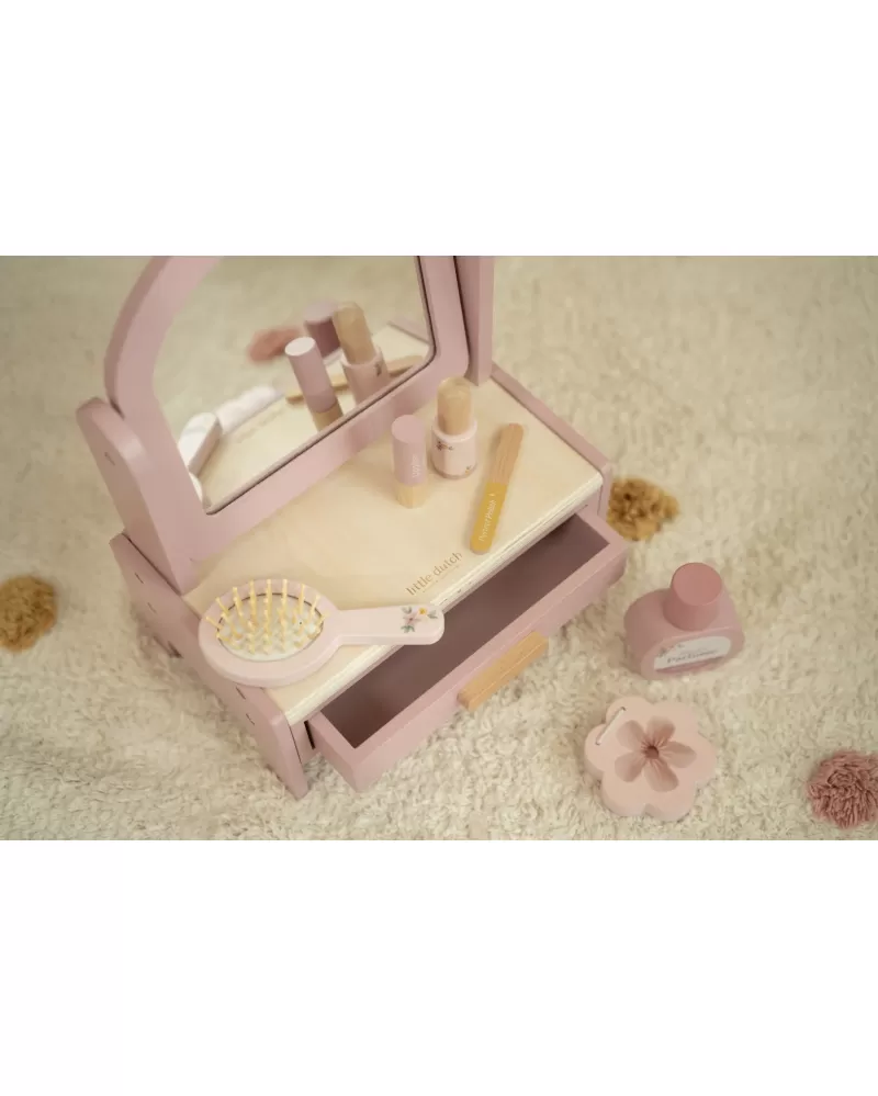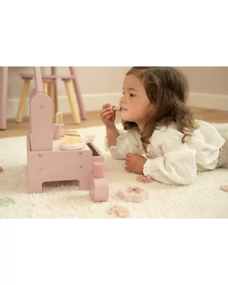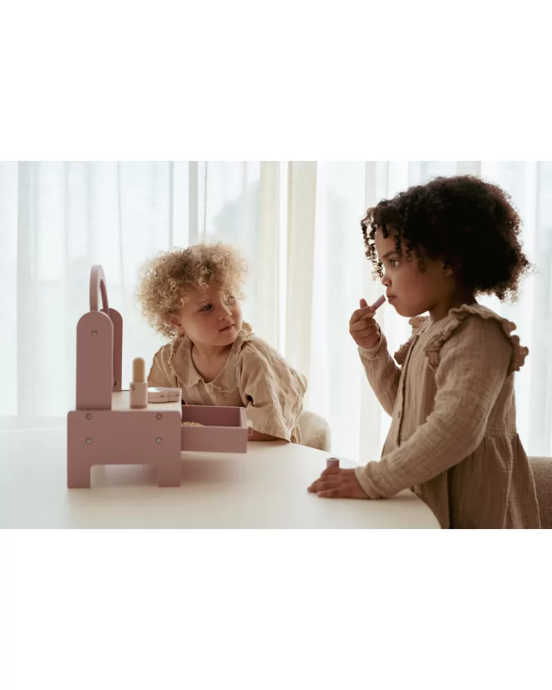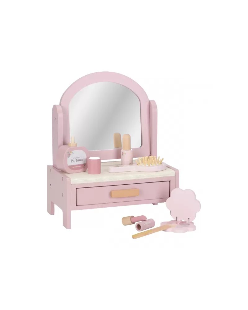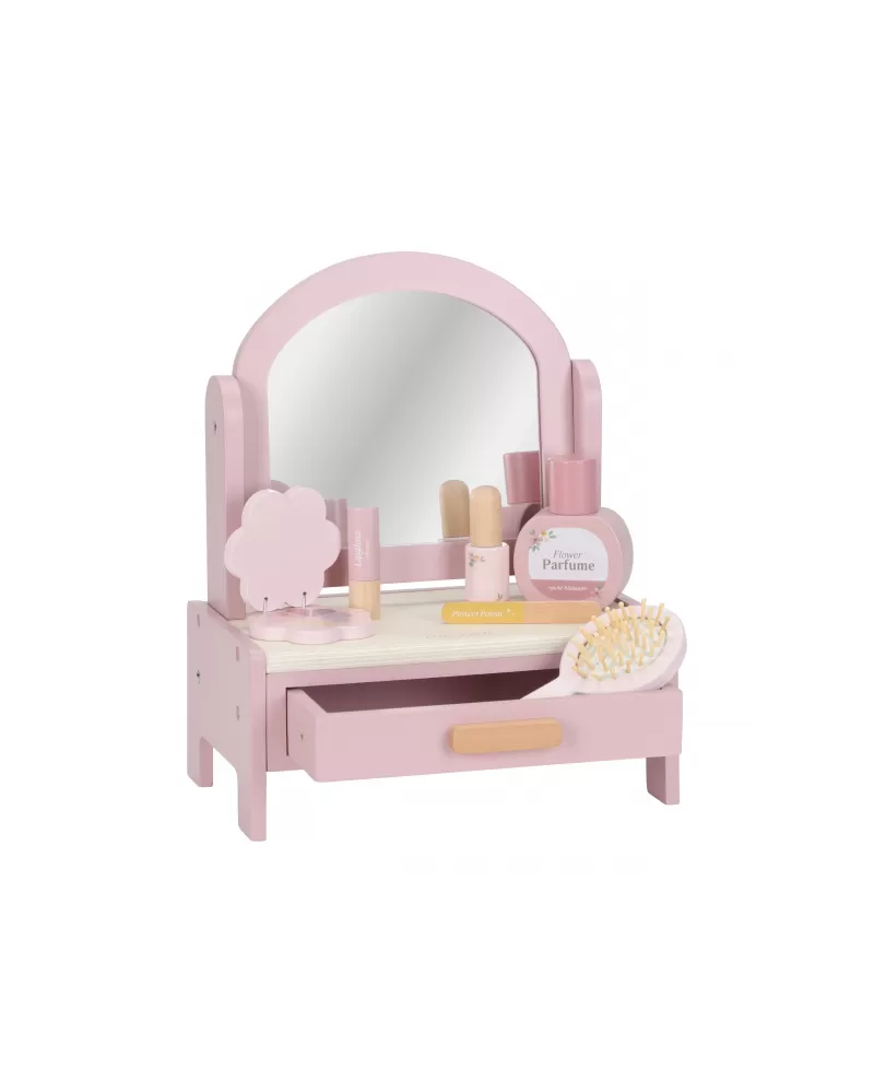 Toaletní stolek s doplňky v dřevěném provedení potěší malou parádnici a stane se i krásnou dekorací v dětském pokoji. Stolek je vybaven otočným zrcadlem, kartáčem na vlasy, parfémem, rtěnkou, očními stíny, pilníkem a lakem na nehty. Zásuvka je ideální pro uložení drobností.