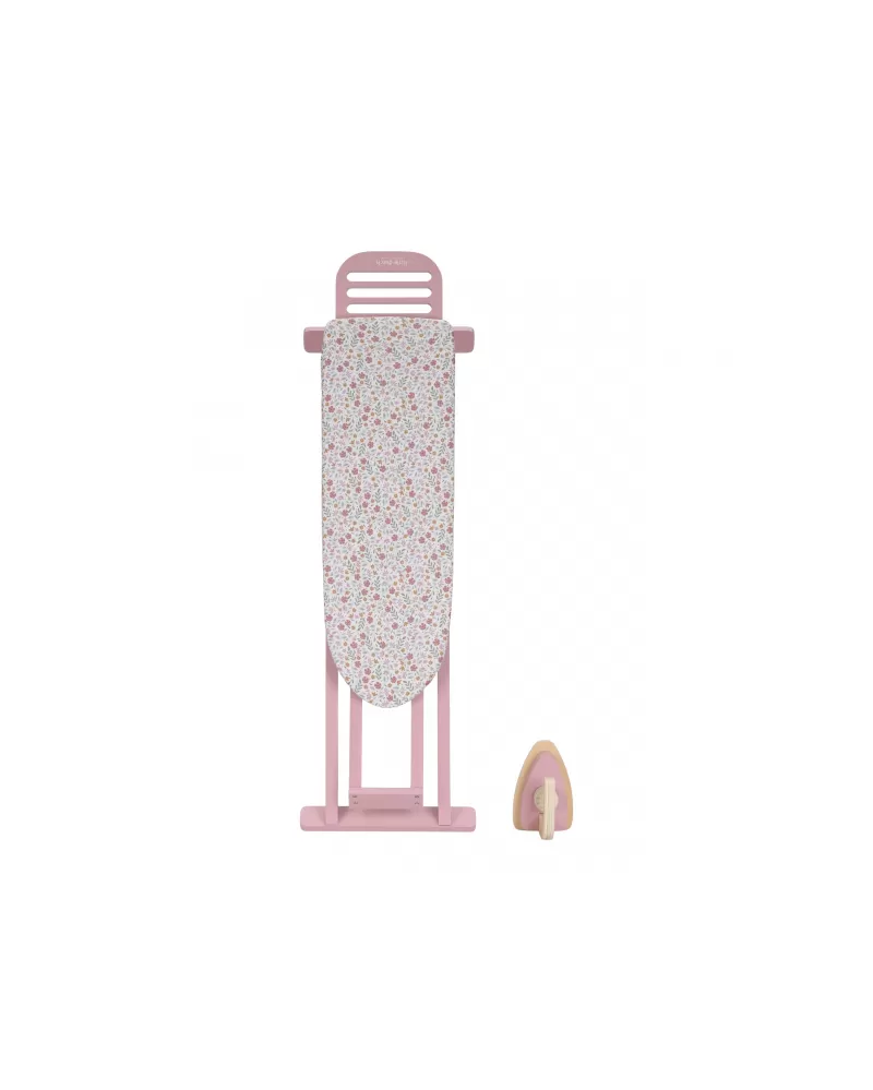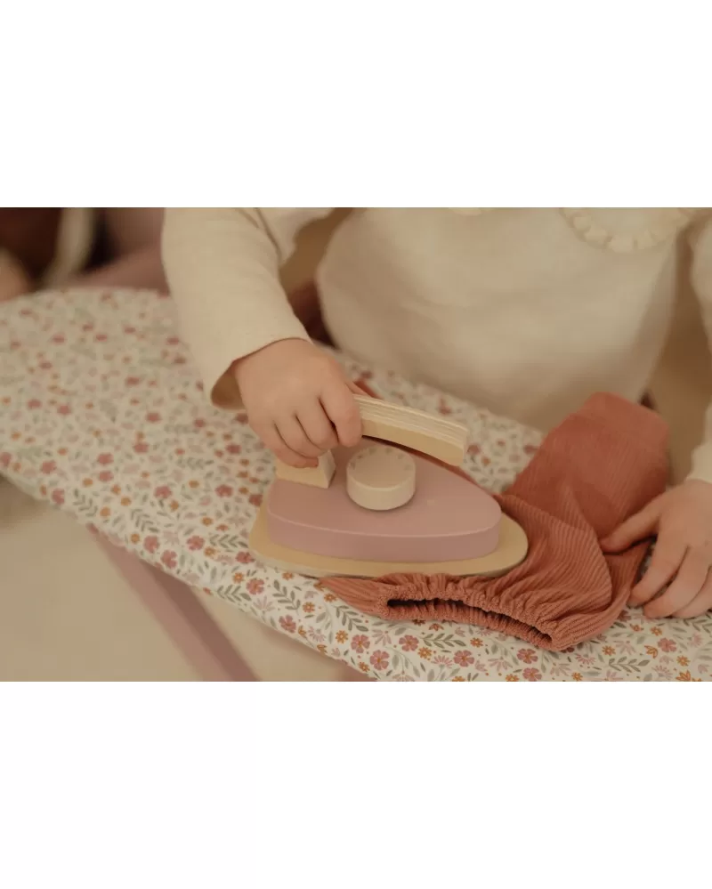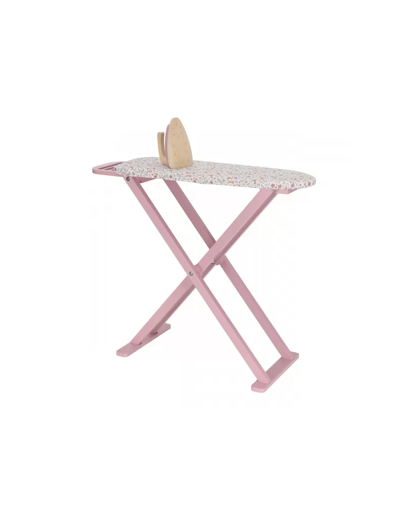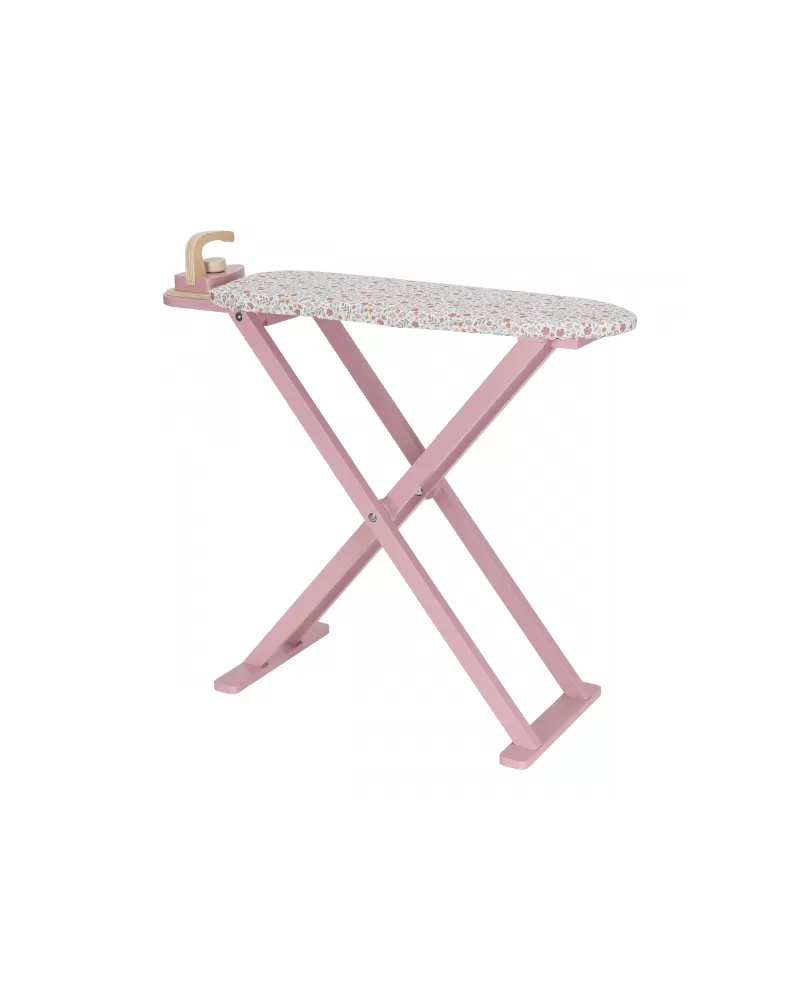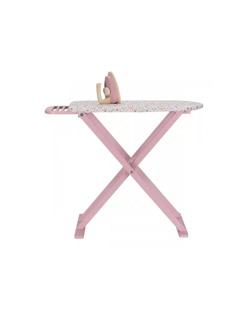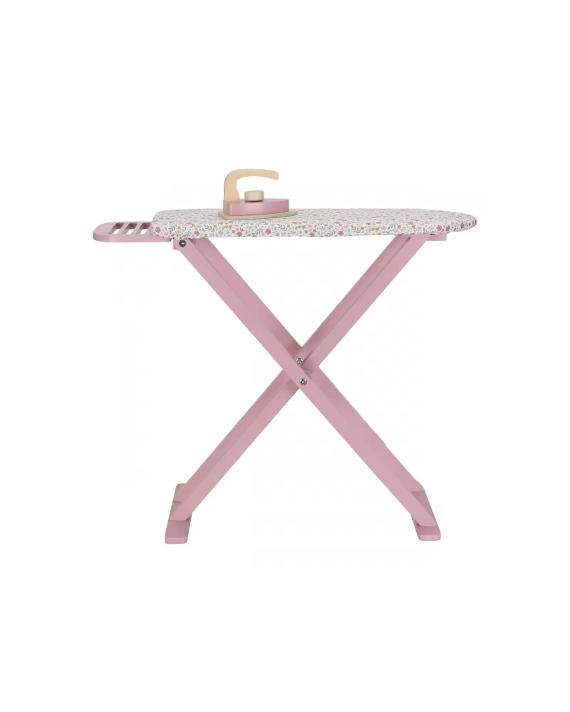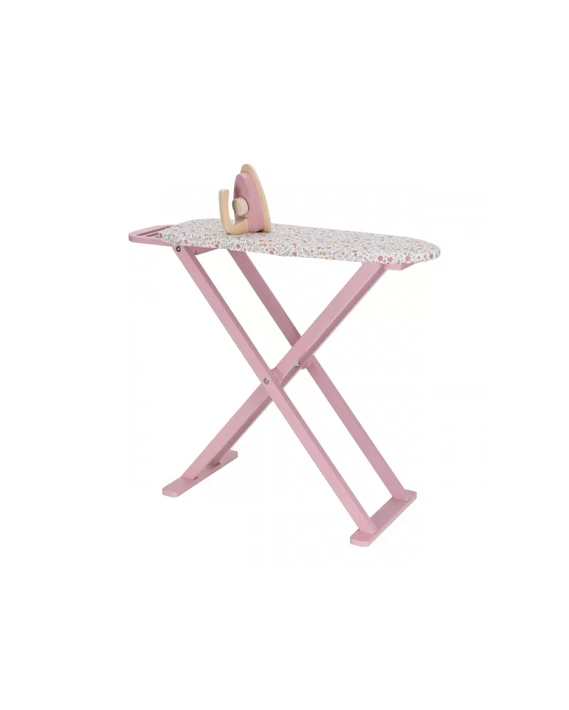 Žehlení oblečení panenkám bude radost s tímto krásným dřevěným žehlicím prknem a žehličkou. Skládací prkno je s textilním potahem s něžným květinovým potiskem vypadá jako opravdové, realisticky působí i běrevně sladěná dřevěná žehlička. Děti mohou hraním s žehličkou napodobovat dospělé a poznávat svět domácnosti zábavnou formou.