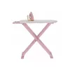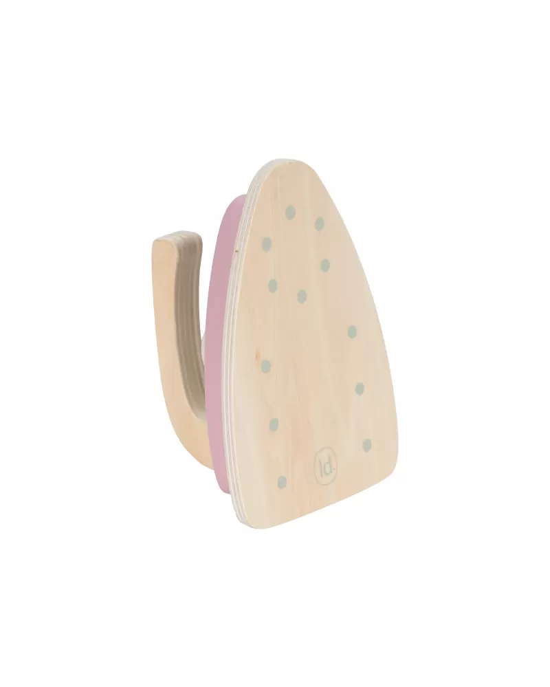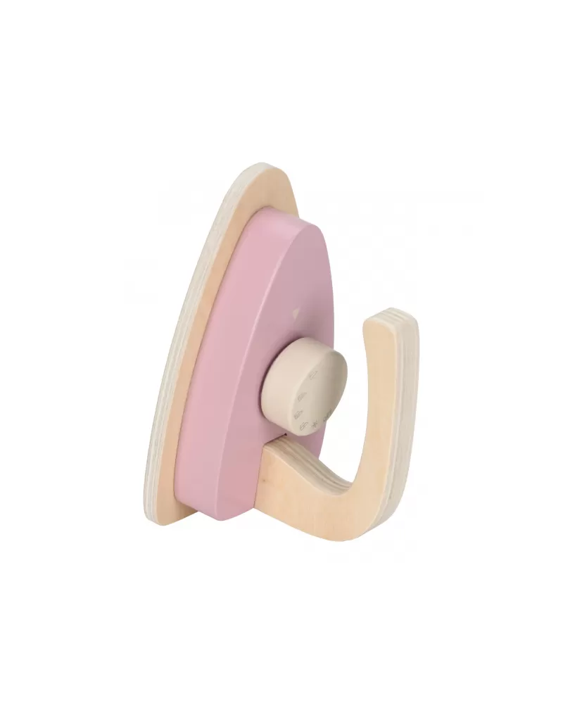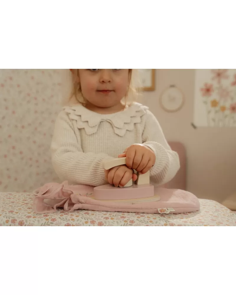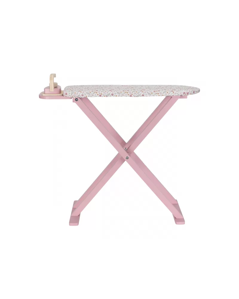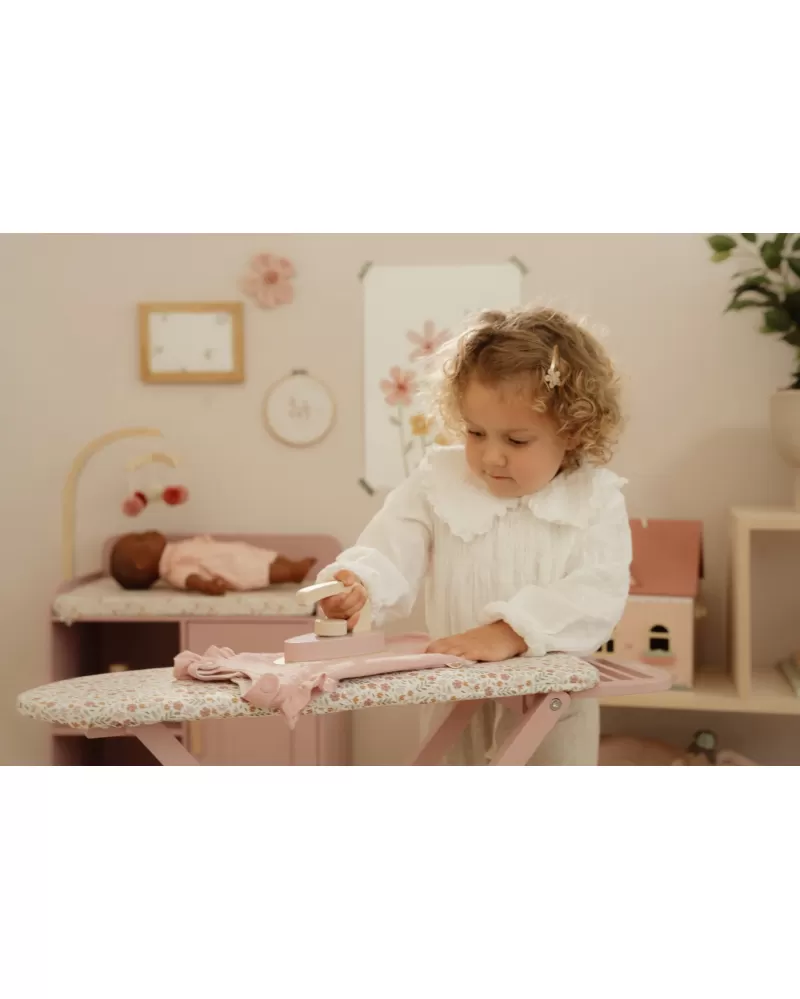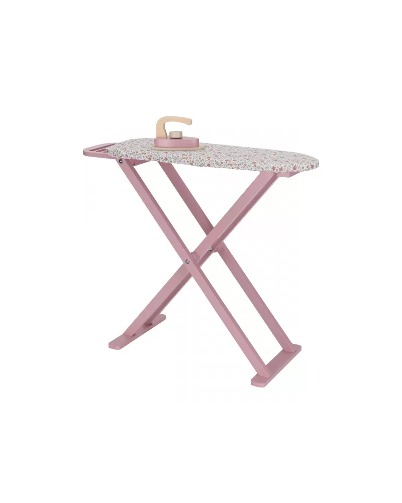 Žehlení oblečení panenkám bude radost s tímto krásným dřevěným žehlicím prknem a žehličkou. Skládací prkno je s textilním potahem s něžným květinovým potiskem vypadá jako opravdové, realisticky působí i běrevně sladěná dřevěná žehlička. Děti mohou hraním s žehličkou napodobovat dospělé a poznávat svět domácnosti zábavnou formou.