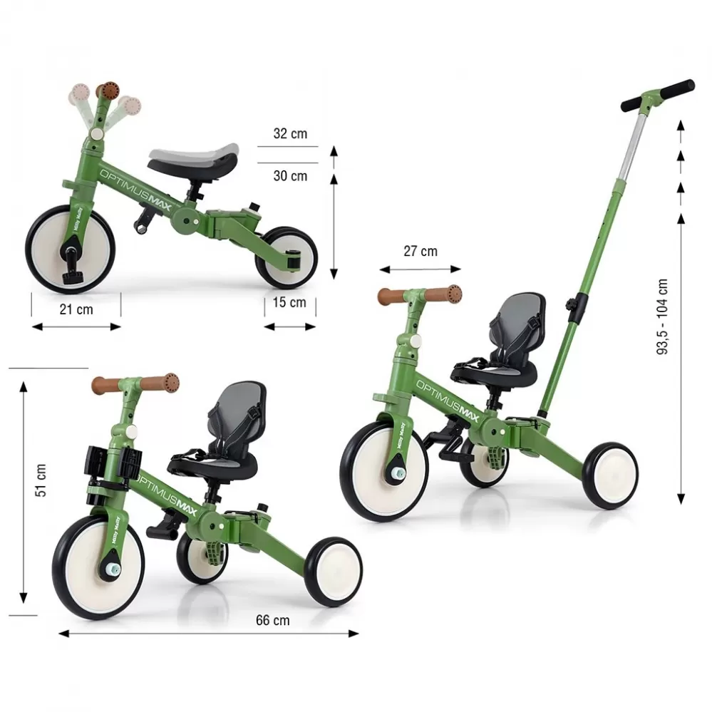 Optimus Max byl navržen tak, aby se stal jednou z nejlepších voleb pro první vozidlo vašeho dítěte. Díky stabilní tříkolové konstrukci poskytuje dítěti odpovídající úroveň bezpečnosti a usnadňuje získávání nových dovedností. Když má dítě již zvládnuté základy jízdy a nevyžaduje pomoc rodiče prostřednictvím řídicí rukojeti, můžeme přidat pedály nebo jej přeměnit na klasické odrážedlo.