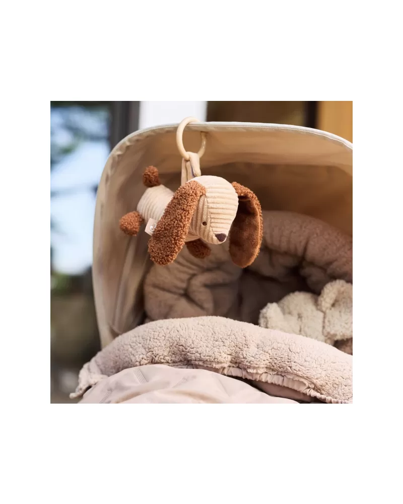 Roztomilý závěsný pejsek Diego z měkké žebrované látky s buklé detaily je ideálním společníkem pro vaše miminko na procházkách a výletech. Díky plastovému kroužku jej snadno připevníte na kočárek nebo autosedačku.