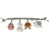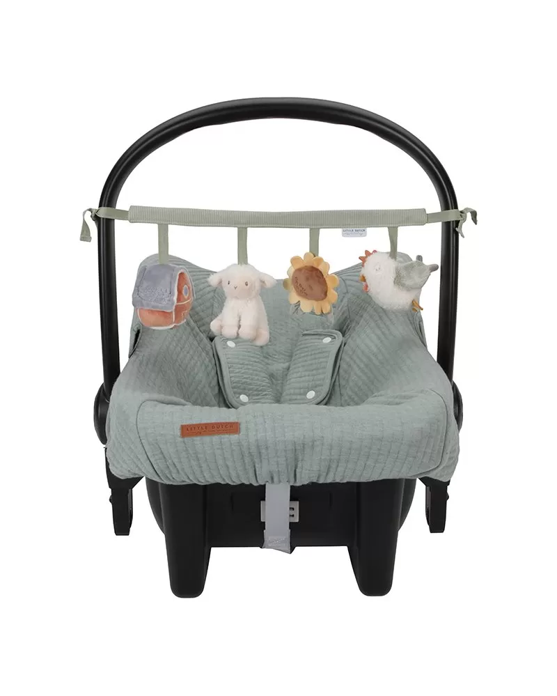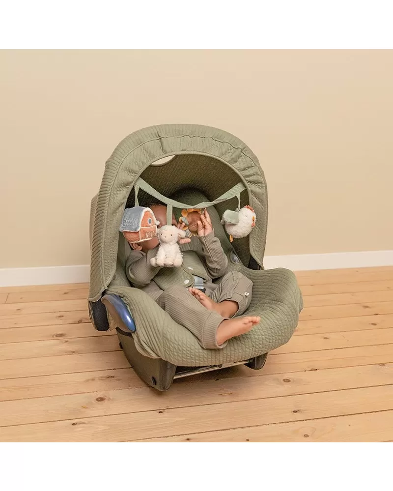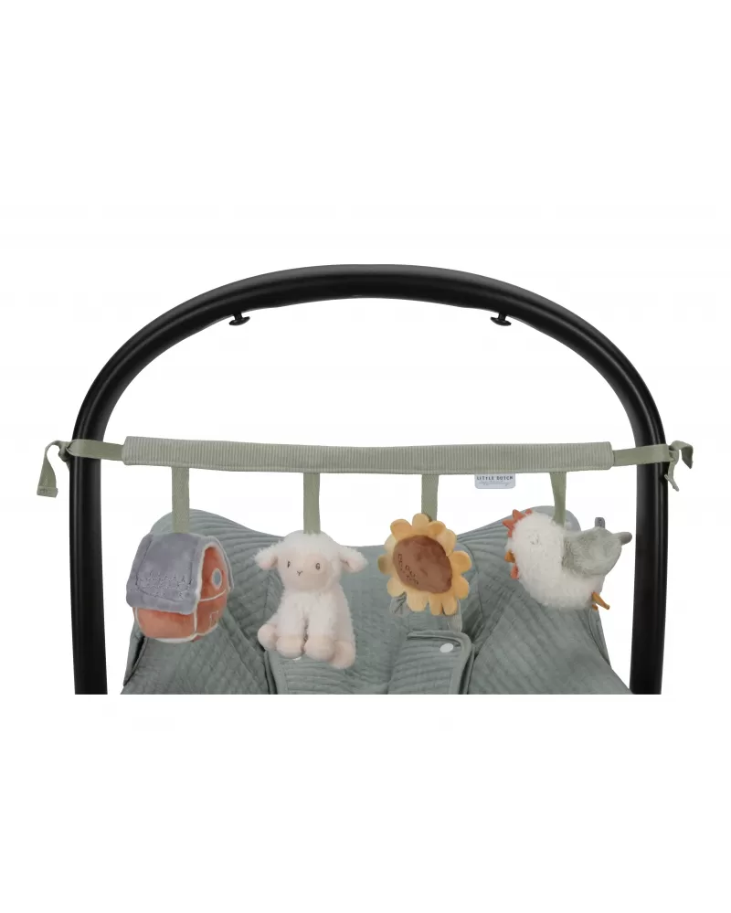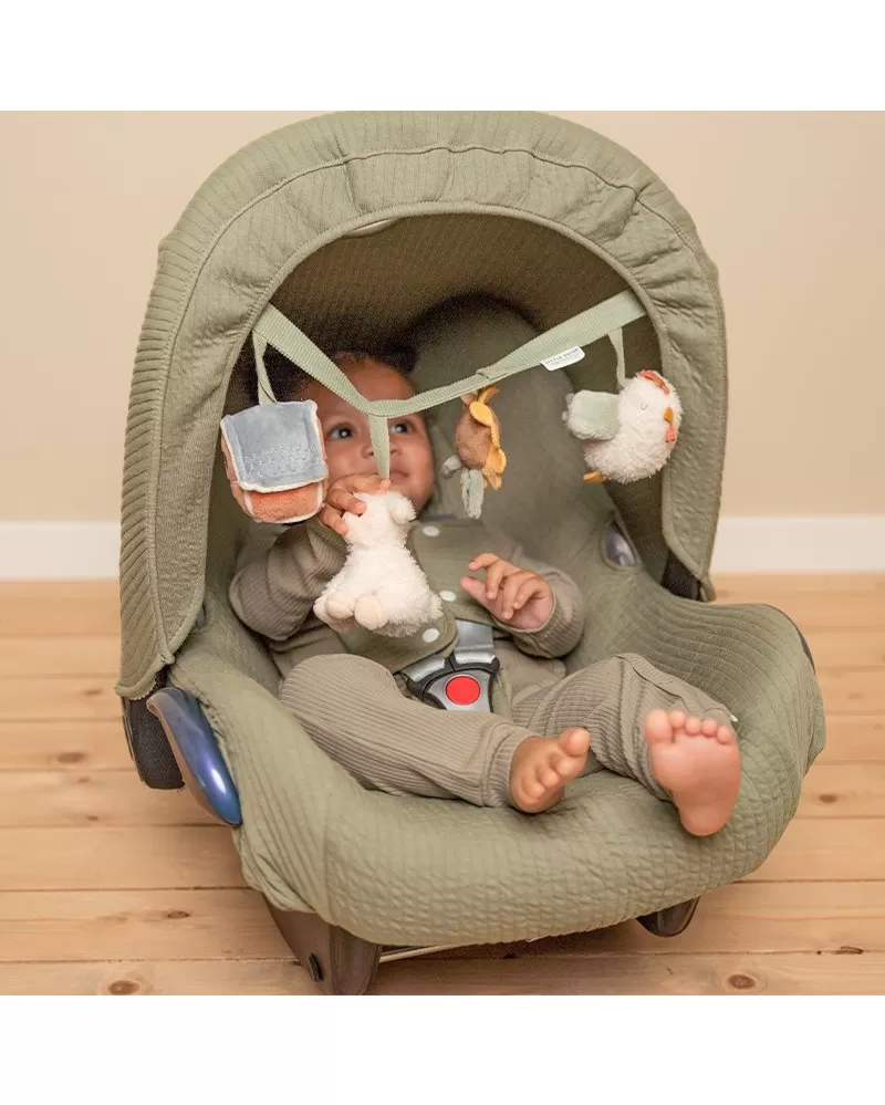 Čtyři zavěšené plyšové hračky v podobě slepičky, ovečky, slunečnice a domečku zabaví vaše miminko na cestách v autosedačce či kočárku. Jednotlivé hračky při zkoumání dětskými ručičkami chrastí, po zmáčknutí pískají a šustí. Hračky stimulují koordinaci ruka / oko dítěte.